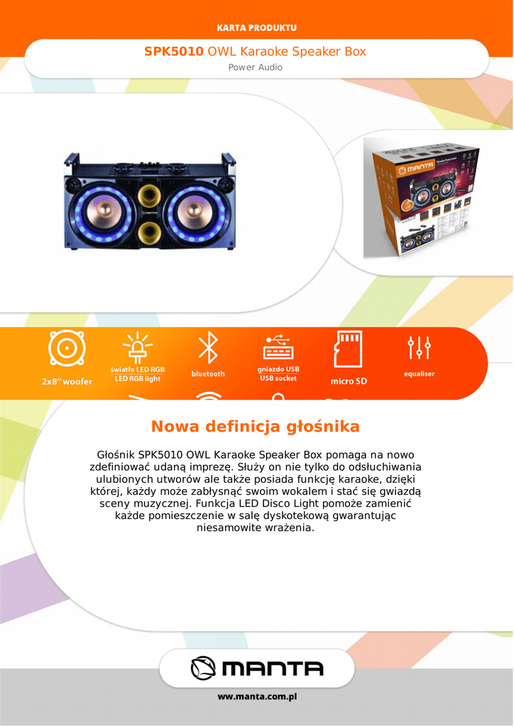 SPK5010OWLKaraokeSpeakerBox PowerAudio Nowadefinicjagłośnika GłośnikSPK5010OWLKaraokeSpeakerBoxpomagananowo zdefiniowaćudanąimprezę.Służyonnietylkodoodsłuchiwania ulubionychutworówaletakżeposiadafunkcjękaraoke,dzięki której,każdymożezabłysnąćswoimwokalemistaćsięgwiazdą scenymuzycznej.FunkcjaLEDDiscoLightpomożezamienić każdepomieszczeniewsalędyskotekowągwarantując niesamowitewrażenia. SPK5010OWLKaraokeSpeakerBox PowerAudio Specyfikacja Nowoczesność Urządzenieobsługujetechnologiębluetooth,dzięki czemumożesiębezprzewodowołączyćzinnymi urządzeniami–np.Zesmartfonem.Jużdziś możeszpuszczaćmuzykęzeswojegosmartfonu czytabletazanagłośnikuMantaSPK5010OWL KaraokeSpeakerBox.Dodatkowo,głośnik wyposażonyjestwportUSB,którypozwalana odtwarzaniemuzykizpamięciprzenośnych. GłośnikibezproblemuodtwarzaplikiMP3. Muzykawnowymwydaniu Wbudowanegłośniki 2x8calisubwoofer,2x2caległośnik wysokotonowy Zasilanie AC230V~50Hz Wymiary(SxWxG) 760x405x405mm Waga 16,3kg Złącza jack6,3mm(gitara+2xmikrofon),AUXIN, USB,SD Wyświetlacz LED Dodatkowefunkcje LEDDiscoLight,Pilot MocRMS 40W*2 Cechyszczególne OdtwarzanieMP3,SuperBass,Equalizer Dziękiwbudowanymgłośnikom:dwóm8calowym subwooferomoraz2óm2calowymgłośnikom wysoko-tonowymodtwarzanedźwiękizadowolą nawetnajbardziejwymagającychmiłośników muzyki.Zkolei,dziękifunkcjiSuperBasskażdy utwórnabierzeodpowiedniejgłębi,asłuchanie muzykistaniesięjeszczeprzyjemniejsze.Equalizer pomożedostosowaćdźwiękdoupodobań użytkownika.Oprócztegourządzeniejest wyposażonewnastępującezłącza:jack6,3mm (gitara+2xmikrofon),AUXIN,USB,SD. http://www.manta.com.pl/pl/spk5010 EAN:5907377868033