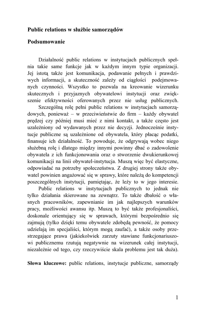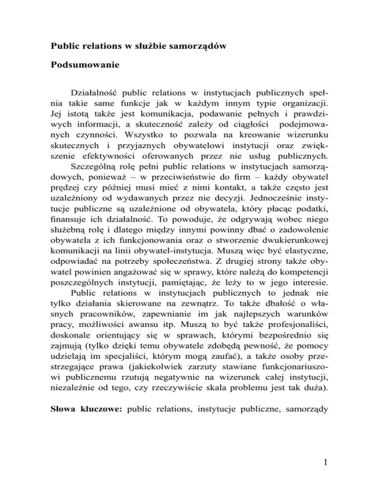 Public relations w służbie samorządów Podsumowanie Działalność public relations w instytucjach publicznych spełnia takie same funkcje jak w każdym innym typie organizacji. Jej istotą także jest komunikacja, podawanie pełnych i prawdziwych informacji, a skuteczność zależy od ciągłości podejmowanych czynności. Wszystko to pozwala na kreowanie wizerunku skutecznych i przyjaznych obywatelowi instytucji oraz zwiększenie efektywności oferowanych przez nie usług publicznych. Szczególną rolę pełni public relations w instytucjach samorządowych, ponieważ – w przeciwieństwie do firm – każdy obywatel prędzej czy później musi mieć z nimi kontakt, a także często jest uzależniony od wydawanych przez nie decyzji. Jednocześnie instytucje publiczne są uzależnione od obywatela, który płacąc podatki, finansuje ich działalność. To powoduje, że odgrywają wobec niego służebną rolę i dlatego między innymi powinny dbać o zadowolenie obywatela z ich funkcjonowania oraz o stworzenie dwukierunkowej komunikacji na linii obywatel-instytucja. Muszą więc być elastyczne, odpowiadać na potrzeby społeczeństwa. Z drugiej strony także obywatel powinien angażować się w sprawy, które należą do kompetencji poszczególnych instytucji, pamiętając, że leży to w jego interesie. Public relations w instytucjach publicznych to jednak nie tylko działania skierowane na zewnątrz. To także dbałość o własnych pracowników, zapewnianie im jak najlepszych warunków pracy, możliwości awansu itp. Muszą to być także profesjonaliści, doskonale orientujący się w sprawach, którymi bezpośrednio się zajmują (tylko dzięki temu obywatele zdobędą pewność, że pomocy udzielają im specjaliści, którym mogą zaufać), a także osoby przestrzegające prawa (jakiekolwiek zarzuty stawiane funkcjonariuszowi publicznemu rzutują negatywnie na wizerunek całej instytucji, niezależnie od tego, czy rzeczywiście skala problemu jest tak duża). Słowa kluczowe: public relations, instytucje publiczne, samorządy 1 Public relations in the service of local government Summary Public relations activities in public institutions meet the same functions as in any other type of organization. Its essence is also communication, the administration of complete and correct information and the effectiveness depends on the continuity of the activities taken. All this allows to create the image of efficient and citizenfriendly institutions, and increase the efficiency of its public services. In local government institutions public relations play a special role, because - unlike in companies - each citizen must sooner or later be in contact with them, and often depends on the decision issued by them. Simultaneously, public institutions are dependent on the citizen, who pay taxes and finance their activities. This makes them play a subordinate role to him and, therefore, among other things they should take care of citizen satisfaction with their functioning and to produce a two-way communication with him. They must therefore be flexible and respond to the needs of the society. On the other hand the citizen should engage in matters that fall within the competence of each institution, keeping in mind that it is in his personal interest. Public relations in public institutions is not only actions directed outward. It is also a concern for its employees, providing them with the best working conditions, promotion opportunities, etc. They are expected to be professional, well-oriented in the matters which they deal with (only then the citizens will gain assurance that the assistance is provided by specialists, whom they may trust), as well as law abiding individuals (any allegations against a public official impinge negatively on the image of the entire organization, regardless the scale of the problem). Keywords: public relations, public institutions, local governments 2
