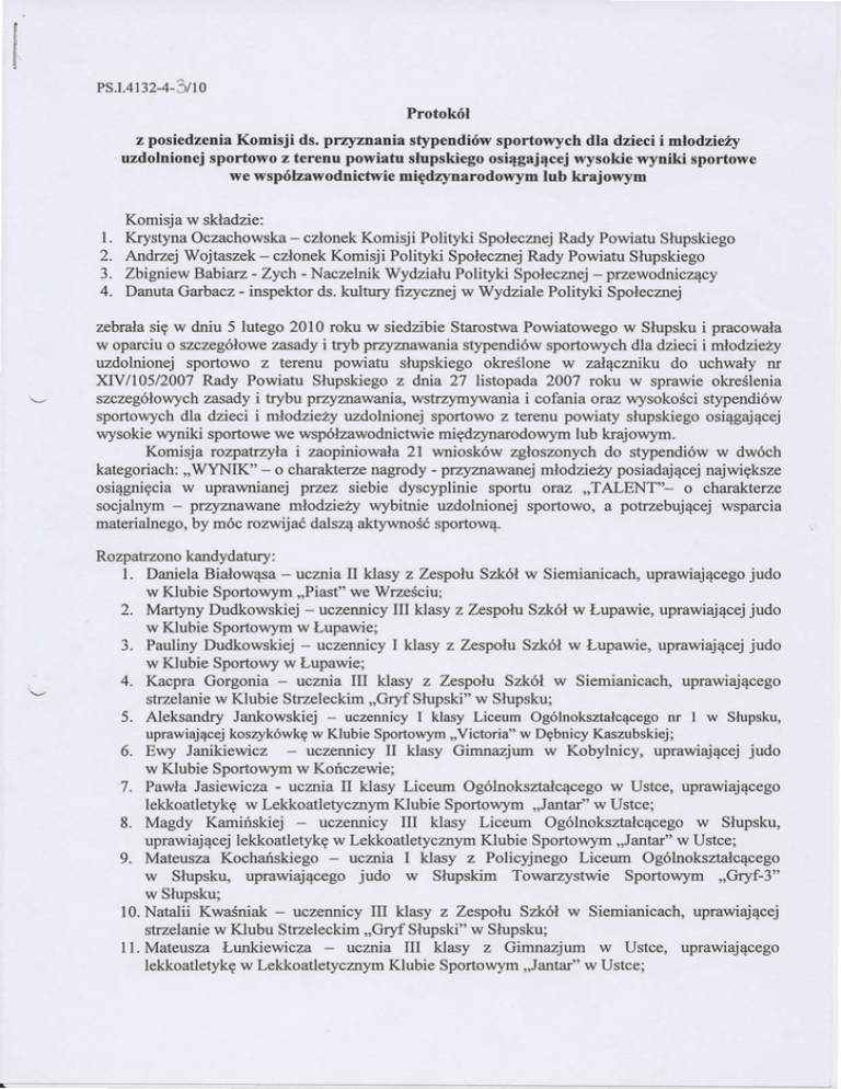 PS.t.41324-tl0 Protokół z posiedzeniaKomisji ds. przyznania stypendiówsportorrYchdla dzieci i m|odzieł uzdolnionejspońowo z terenupowiatu slupskiegoosiągającejłvysokiewyniki spońowe we wspólzawodnictwie międz}TarodonTm lub krajowym 12. 3' 4. Komisja w składzie: Krystyna oczachowska _ członekKomisji Polityki społecznejRady Powiatu Słupskiego AldtzĄ wojtasfek _ członękKomisji Polityki SpołecznejRady Powiatu Słupskiego Zbigniew Babiarz - Zych - Naczelnik WydziałuPolityki społ€cznej _ przewodniczący DanutaGalbacz - inspektol ds. kulfury fizycznĄ w Wydzia|e Polityki społecznej zebrałasię w dniu 5 lutego 2010 rcku w siedzibie starostwa Powiatowego w Sfupsku i pmcowała w oparciuo szczegółowęzasady i tryb przyznawaniastypendiów sportowych dla dziecli rrrtodzieĄ uzdo]nionej sportowo z telenu powiatu słupskiego okeślone w zalLączniktldo uchwały ff x]vl|o5/200'7 Rady Powiatu Słupskiego z dnia 27 listopada 2007 roku w sprawie okeślenia szczegótowychzasady i Ębu przyznawania,wstrz}tnywania i cofania ońz wysokościstypendiów sportowychdla dzieci i młodzieżyuzdoLrionej sportowo z tęrenu powiaty sfupskiego osiągającej wysokie wyniki spoltowe we współzawodnictwiemiędzFarodow)m lub kńjowym' Komisja rozpafozyłai zaopi owała 21 wniosków zgłoszonych do stypendiów w dwóch kategoriach:,,WYNIK'' _ o charakterzenagrody . przyznałłwtejmłodziezyposiadającejnajwiększe osiągnięcia W upBwnianęj pzez siebię dyscyplinie spońu omz ',TALENT._ o chafakteze socjalnym _ ptzyznawane młodziezy wybitnie uzdolnionej spońowo, a potrzebującej wsparcia mateńalnego,by móc rozwijać dalsząakqt'mośćsportową. - Rozpatrzonokandydatuly: judo 1. DanielaBiałowąsa_ ucznia II klasy z z€ s połu szkół w siemianicach,uprawiającego w Klubie spońowym ,,Piast''we wrześciu; 2. Martyny Dudkowskiej _ uczennicy III klasy z Zespofu Szkół w Łupawie, uprawiającejjudo w Klubie spońowym w Łupawie; 3. Pauliny Dudkowskiej _ uczennicy I klasy z Zespofu Szkół w Łupawie, uprawiającejjudo w Klubie Sportowyw Lupawie: 4. KacpE Gorgonia _ ucznia III klasy z Zespołu szkół w sięmianicach, uprawiającęgo strzelanięw Klubie strzeleckim,,GryfSłupski''w Sfupsku; 5. Aleksandry Jankowskiej ' uczennicy I klasy Liceum ogólnoksŹałcącegonr 1 w Słupsku, uprawiającej koszykówkęw Klubie sportowym,,Victoria''w DębnicyKaszubskiej; 6. Ewy Janikiewicz - uczennicy II klasy Gimnazjum w Kobylnicy' uprawiającej judo w Klubie Spońowym w Kończewie; 7' Pawła Jasiewicza . uca|ia Il klasy Liceum ogó]nokształcącegow Ustce, uprawiającego lekkoallętykę w Lekkoatletycznym Klubie sportowym ,,Jantar''w Ustce; 8' Magdy Kamińskiej _ uczennicy IlI klasy Liceum ogólnokształcącego w Sfupsku, uprawiającejlekkoatletykęw Lekkoatletycznym Klubię sporto\rr'ym,,Jantal''w Ustce; 9. Mateusza Kochańskięgo _ uczrria l klasy z Policyjnego Liceum ogólnokształcącego w słupsku, uprawiającego judo w Sfupskim Towarzystwie sportowym ,,Gr1f-3'' w Słupsku; l0. Natalii Kwaśniak_ uczennicy III klasy z Zespołu Szkół w Siemianicach, upiawiającej stzelaniew Klubu stlzęleckim,'Gryf słupski''w słupsku; 11.Mateusza Łunkiewicza _ ucznia III klasy z Gimnazjum w Ustce, uplawiającego lękkoatletykęw Lekkoatletycznym Klubie spoltowym ,,Jantar''w Ustce; 12.Mateusza Malinowskiego _ ucznia I klasy technikum z Zespołu szkół ogólnokształcących i Technicznych w Słupsku,uprawiającegoboks w Klubie Sportowym w Damnicy; 13.Mateusza Michalskiego _ uczrria I klasy Społecznej ZasadnicĄ SzkĘ Zawodowej w Sfupskq uprawiającegoboks w Klubie Spońowym w Darnnicy; 14' Karcliny Rączki uczenrricy II klasy liceum z Zespołl Szkół ogólnokształcących i Technicznych w Słupsku,uprawiającejkoszykówkę w Uczniowskim Klubie sportowym ,.Victoria..w DębnicyKaszubskiejl 15.Patryka Runowskiego ucznia I klasy z ZespołuSzkól w Zagórzycy' uprawiającegoboks w Klubie spońowym w Damnicy; l6' PrzemysławaRunowskiego _ ucznia III klasy z Zespołuszkół w Zagórrycy, upraitajqcego boks w Klubje Sportowymw Damnicy: l7.lwetty salachny _ uczennicy II klasy liceum z Zespotlt Szkół ogólnokształcących i Tecbnicznych w Słupsku,uprawiającejkoszykówkę w Ucaniowskim Klubie Sportorłym .,Victońa..w DębnicyKaszubskiej: l8' Anety siczek . uczennicy II klasy Liceum ogólnokształcącychru l w Sfupsku, upawiającej koszykówkę w Uczniowskim Klubie Sportowym ,,Victońa'' w Dębnicy Kaszubskiej; l9. Piotra wasilewskiego _ uczrria I klasy v LicetĘ ogólnoksŹałcącego w Sfupsku, uprawiającegojudo w Klubie spoltowym w Łupawie; 20' Jolanty wichłacz _ uczennicy II klasy z ZespołuSzkół ogólnokształcących i Technicznych w sfupsku, uprawiającej koszykówkę w Uczniowskim Klubie spoltowym ',Victoria'' w Dębnicy Kaszubskiej; 2l. Agnieszki Zielińskiej _ uczerrnicy II klasy z Zespołu Szkól ogólnokształcących i Techrricznychw Sfupsku' uprawiającejkoszykówkę w Uczniowskim Klubię spońowym ..Victońa.'w DębnicyKaszubskiej. Komisja stwierdziła'iż wszystkie wnioski złożonęzostałyzgodŃe z wymaganąprocedurą spełniĄ kĄ,teria zawatte w s 3 pkt. 2 zasącz\ika do uchwały nr Xlv/l05/2007 Rady Powiatu Stupskiegoz dnia 27 listopada2007 roku. Po szczegołowejoceńe wniosków Komisja w wyniku jawnego głosowaniapostanowiła pozytywnię zaopiniować wniosek o sĘpendium w kategorii ''WYNIK" _ o charakterzenagrody, przyznawanejmłodziezyposiadającejnajwiększeosiągnięciaw uplawianej przez siebie dysc}plinie spolfu . PŹęmysława Runowskiego _ ucznia klasy II1 z Zgspołu szkó| w Zagófzycy i poponuje przyznać stypęndiumw łysokości200 ż miesięcznie. W wyniku jawnego głosowania Komisja poz}'tywnie zaopińowała takze wnioski wybitnie o stypendiumw kategońi ''TAIENT'' - o charakterzesocjalnym . przyznawane młodzieźry uzdolnionej spoltowo, a potrzebującejwsparcia materialnego,by móc rozwijać dalszą aliitywność sportową' niżej wymienionych kandydatów i proponuje miesięczne kwot