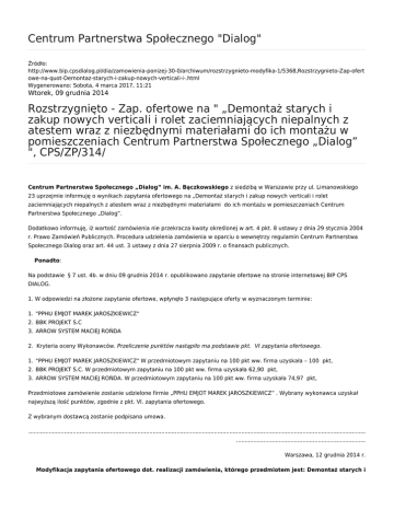 Centrum Partnerstwa Społecznego "Dialog" Źródło: http://www.bip.cpsdialog.pl/dia/zamowienia-ponizej-30-0/archiwum/rozstrzygnieto-modyfika-1/5368,Rozstrzygnieto-Zap-ofert owe-na-quot-Demontaz-starych-i-zakup-nowych-verticali-i-.html Wygenerowano: Sobota, 4 marca 2017, 11:21 Wtorek, 09 grudnia 2014 Rozstrzygnięto - Zap. ofertowe na " „Demontaż starych i zakup nowych verticali i rolet zaciemniających niepalnych z atestem wraz z niezbędnymi materiałami do ich montażu w pomieszczeniach Centrum Partnerstwa Społecznego „Dialog” ", CPS/ZP/314/ Centrum Partnerstwa Społecznego „Dialog” im. A. Bączkowskiego z siedzibą w Warszawie przy ul. Limanowskiego 23 uprzejmie informuję o wynikach zapytania ofertowego na „Demontaż starych i zakup nowych verticali i rolet zaciemniających niepalnych z atestem wraz z niezbędnymi materiałami do ich montażu w pomieszczeniach Centrum Partnerstwa Społecznego „Dialog”. Dodatkowo informuję, iż wartość zamówienia nie przekracza kwoty określonej w art. 4 pkt. 8 ustawy z dnia 29 stycznia 2004 r. Prawo Zamówień Publicznych. Procedura udzielenia zamówienia w oparciu o wewnętrzy regulamin Centrum Partnerstwa Społecznego Dialog oraz art. 44 ust. 3 ustawy z dnia 27 sierpnia 2009 r. o finansach publicznych. Ponadto: Na podstawie § 7 ust. 4b. w dniu 09 grudnia 2014 r. opublikowano zapytanie ofertowe na stronie internetowej BIP CPS DIALOG. 1. W odpowiedzi na złożone zapytanie ofertowe, wpłynęło 3 następujące oferty w wyznaczonym terminie: 1. "PPHU EMJOT MAREK JAROSZKIEWICZ" 2. BBK PROJEKT S.C 3. ARROW SYSTEM MACIEJ ROŃDA 2. Kryteria oceny Wykonawców. Przeliczenie punktów nastąpiło ma podstawie pkt. VI zapytania ofertowego. 1. "PPHU EMJOT MAREK JAROSZKIEWICZ" W przedmiotowym zapytaniu na 100 pkt ww. firma uzyskała – 100 pkt, 2. BBK PROJEKT S.C. W przedmiotowym zapytaniu na 100 pkt ww. firma uzyskała 62,90 pkt, 3. ARROW SYSTEM MACIEJ ROŃDA. W przedmiotowym zapytaniu na 100 pkt ww. firma uzyskała 74,97 pkt, Przedmiotowe zamówienie zostanie udzielone firmie „PPHU EMJOT MAREK JAROSZKIEWICZ” . Wybrany wykonawca uzyskał najwyższą ilość punktów, zgodnie z pkt. VI. zapytania ofertowego. Z wybranym dostawcą zostanie podpisana umowa. ...................................................................................................................................................................................................... ............................................................................ Warszawa, 12 grudnia 2014 r. Modyfikacja zapytania ofertowego dot. realizacji zamówienia, którego przedmiotem jest: Demontaż starych i zakup nowych verticali i rolet zaciemniających niepalnych z atestem wraz z niezbędnymi materiałami do ich montażu w pomieszczeniach Centrum Partnerstwa Społecznego „Dialog” Modyfikowana jest tresć załacznika nr 1 w pozycji 3. z "Sala B ( 3 okna – 3 skrzydła )" na "Sala B ( 4 okna - 3 skrzydłowe)". Pozostałe zapisy oraz termin składania ofert pozostaja bez zmian. W załaczeniu poprawiony formularz ofertowy. ...................................................................................................................................................................................................... ........................................................................ Warszawa, 09 grudnia 2014 r. Zapytanie ofertowe, CPS/ZP/-/314/14 Centrum Partnerstwa Społecznego „Dialog” im. A. Bączkowskiego z siedzibą w Warszawie przy ul. Limanowskiego 23 zwraca się z zapytaniem ofertowym dotyczącym realizacji zamówienia, którego przedmiotem jest: Demontaż starych i zakup nowych verticali i rolet zaciemniających niepalnych z atestem wraz z niezbędnymi materiałami do ich montażu w pomieszczeniach Centrum Partnerstwa Społecznego „Dialog” I. Zamawiający: Centrum Partnerstwa Społecznego „Dialog” im. Andrzeja Bączkowskiego, ul. Limanowskiego 23, 02-943 Warszawa II. Przedmiot zamówienia: Demontaż starych i zakup nowych verticali i rolet zaciemniających niepalnych z atestem wraz z niezbędnymi materiałami do ich montażu w pomieszczeniach Centrum Partnerstwa Społecznego „Dialog”. ● Sala konferencyjna A ( demontaż wraz z montażem nowych verticali oraz ekranów zaciemniających), ● Sala konferencyjna B ( montaż verticali oraz ekranów zaciemniających), ● Kltka schodowa I p. ( demontaż verticali oraz montaż nowych verticali), ● Klatka schodowa II p.( demontaż verticali oraz montaż nowych verticali). PARAMETRY MATERIAŁU ŻALUZJE PIONOWE VERTICALE Skład - włókno szklane 100 % Gramatura – ok. 200 g/m2 Grubość – ok. 0,30 mm *Kolor - fiji vanilla /biały – bądź równoważny materiał Mocowanie/montaż do sufitu. Wymiary szczegółowo opisane w formularzu ofertowym nr 1. Szerokość lameli powinna wynosić ok. 127 mm. Przymocowane do wysięgnika rozsuwane na dwie strony za pomocą łożyskowych wagoników zamocowanych przy szynie aluminiowej białej. Wykonane z tworzywa odpornego na działania promieni słonecznych i osiadanie kurzu, a także nadającego się do prania. Obracanie lameli w stosunku do szyny następuje za pomocą łańcuszka kulkowego. Otwieranie i zamykanie żaluzji następuje za pomocą sznurka z obciążnikiem. Żaluzje verticale powinny posiadać atest higieniczny Państwowego Zakładu Higieny (należy dołączyć do oferty) . Zamawiający informuje o konieczności przedłożenia próbników oferowanej tkaniny. * Ostateczny kolor zostanie wybrany po podpisaniu umowy. ROLETA ZACIEMNIAJĄCA W KASECIE ALUMINIOWEJ O WYMIARACH W ŚWIETLE SZYBY: Roleta w kasecie aluminiowej i prowadnicami z mechanizmem sprężynowym typ BAMAR-11, tkanina zaciemniająca 100% w kolorze czarnym. Montaż kasety aluminiowej w górnej części okna. Materiał niepalny, (atest należy dołączyć do oferty). WIZJA LOKALNA ZALECANA Kod przedmiotu zamówienia w oparciu o Wspólny Słownik Zamówień (CPV): 39.51.54.40-1 Żaluzje pion
