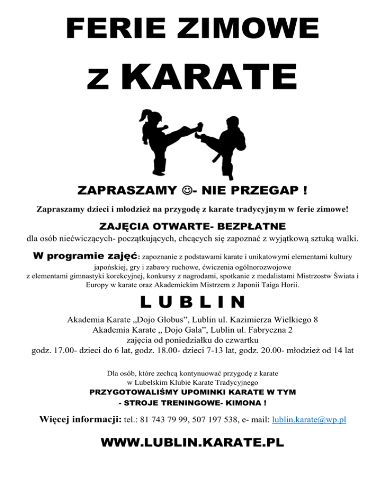 FERIE ZIMOWE Z KARATE ZAPRASZAMY - NIE PRZEGAP ! Zapraszamy dzieci i młodzież na przygodę z karate tradycyjnym w ferie zimowe! ZAJĘCIA OTWARTE- BEZPŁATNE dla osób niećwiczących- początkujących, chcących się zapoznać z wyjątkową sztuką walki. W programie zajęć: zapoznanie z podstawami karate i unikatowymi elementami kultury japońskiej, gry i zabawy ruchowe, ćwiczenia ogólnorozwojowe z elementami gimnastyki korekcyjnej, konkursy z nagrodami, spotkanie z medalistami Mistrzostw Świata i Europy w karate oraz Akademickim Mistrzem z Japonii Taiga Horii. LUBLIN Akademia Karate „Dojo Globus”, Lublin ul. Kazimierza Wielkiego 8 Akademia Karate „ Dojo Gala”, Lublin ul. Fabryczna 2 zajęcia od poniedziałku do czwartku godz. 17.00- dzieci do 6 lat, godz. 18.00- dzieci 7-13 lat, godz. 20.00- młodzież od 14 lat Dla osób, które zechcą kontynuować przygodę z karate w Lubelskim Klubie Karate Tradycyjnego PRZYGOTOWALIŚMY UPOMINKI KARATE W TYM - STROJE TRENINGOWE- KIMONA ! Więcej informacji: tel.: 81 743 79 99, 507 197 538, e- mail: [email protected] WWW.LUBLIN.KARATE.PL