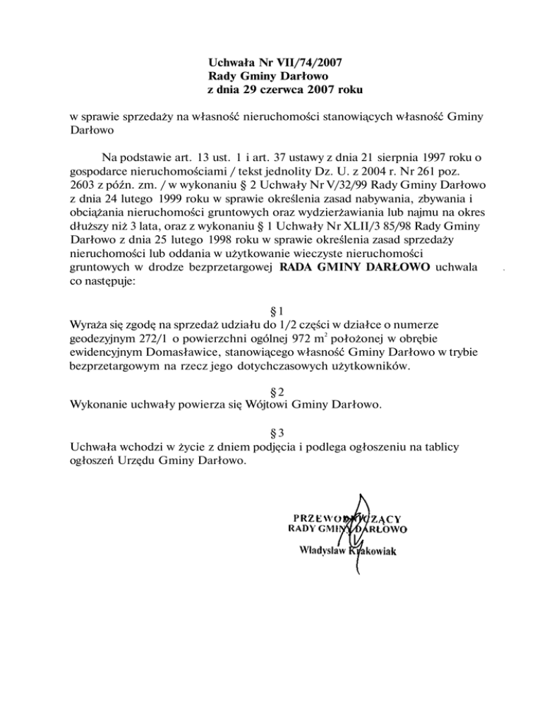 Uchwała Nr VII/74/2007 Rady Gminy Darłowo z dnia 29 czerwca 2007 roku w sprawie sprzedaży na własność nieruchomości stanowiących własność Gminy Darłowo Na podstawie art. 13 ust. 1 i art. 37 ustawy z dnia 21 sierpnia 1997 roku o gospodarce nieruchomościami / tekst jednolity Dz. U. z 2004 r. Nr 261 poz. 2603 z późn. zm. / w wykonaniu § 2 Uchwały Nr V/32/99 Rady Gminy Darłowo z dnia 24 lutego 1999 roku w sprawie określenia zasad nabywania, zbywania i obciążania nieruchomości gruntowych oraz wydzierżawiania lub najmu na okres dłuższy niż 3 lata, oraz z wykonaniu § 1 Uchwały Nr XLII/3 85/98 Rady Gminy Darłowo z dnia 25 lutego 1998 roku w sprawie określenia zasad sprzedaży nieruchomości lub oddania w użytkowanie wieczyste nieruchomości gruntowych w drodze bezprzetargowej RADA GMINY DARŁOWO uchwala co następuje: §1 Wyraża się zgodę na sprzedaż udziału do 1/2 części w działce o numerze geodezyjnym 272/1 o powierzchni ogólnej 972 m2 położonej w obrębie ewidencyjnym Domasławice, stanowiącego własność Gminy Darłowo w trybie bezprzetargowym na rzecz jego dotychczasowych użytkowników. §2 Wykonanie uchwały powierza się Wójtowi Gminy Darłowo. §3 Uchwała wchodzi w życie z dniem podjęcia i podlega ogłoszeniu na tablicy ogłoszeń Urzędu Gminy Darłowo.