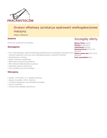Drukarz offsetowy (produkcja opakowań) wielkogabarytowe maszyny Belgia, Wetteren Zadania Praca przy maszynach do produkcji Szczegóły oferty Nazwa firmy: Adecco Branża:Produkcyjna Wymagania Lokalizacja:Operator Zamieszczono:2013-11-29 00:00:00 Min. 4 lata świeżego, udokumentowanego doświadczenia na podobnym stanowisku przy Oferta ważna do:2013-12-16 produkcji opakowań oraz pracy przy wielkogabarytowych maszynach (Roland) 00:00:00 Doświadczenie w branży Ilość wyświetleń:6101 Dobra znajomość angielskiego Referencje od byłych pracodawców Mile widziane doświadczenie za granicą Możliwość zabrania samochodu Chęć osiedlenia się na ternie Belgii ● ● ● ● ● ● ● Oferujemy ● ● ● ● ● Stawka: 12 E brutto / 1h + dodatki zmianowe Kupony na posiłek: 1,09 E / dziennie 37 godzin tygodniowo, od poniedziałku do piątku Praca 2 zmianowa Intencja tylko długiego zatrudnienia
