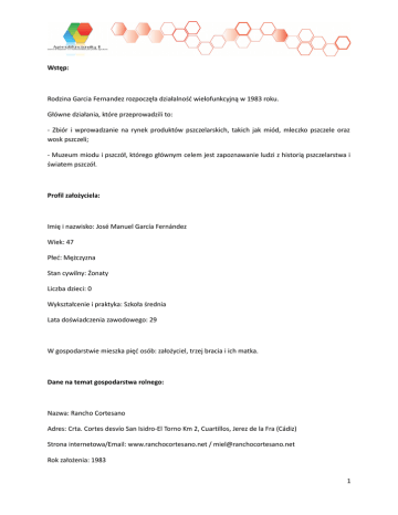 Wstęp: Rodzina Garcia Fernandez rozpoczęła działalność wielofunkcyjną w 1983 roku. Główne działania, które przeprowadzili to: - Zbiór i wprowadzanie na rynek produktów pszczelarskich, takich jak miód, mleczko pszczele oraz wosk pszczeli; - Muzeum miodu i pszczół, którego głównym celem jest zapoznawanie ludzi z historią pszczelarstwa i światem pszczół. Profil założyciela: Imię i nazwisko: José Manuel García Fernández Wiek: 47 Płeć: Mężczyzna Stan cywilny: Żonaty Liczba dzieci: 0 Wykształcenie i praktyka: Szkoła średnia Lata doświadczenia zawodowego: 29 W gospodarstwie mieszka pięć osób: założyciel, trzej bracia i ich matka. Dane na temat gospodarstwa rolnego: Nazwa: Rancho Cortesano Adres: Crta. Cortes desvío San Isidro-El Torno Km 2, Cuartillos, Jerez de la Fra (Cádiz) Strona internetowa/Email: www.ranchocortesano.net / [email protected] Rok założenia: 1983 1 Hektary: 12 Poprzedania sytuacja: Rancho Cortesano jest firmą rodzinną, która początkowo zajmowała się rolnictwem (uprawiano głównie: słonecznik, buraki cukrowy, itd.), co nie było w pełni rentowne. Pszczelarstwo stanowiło tylko działalnością dodatkową, jednakże kryzys tradycyjnego rolnictwa i reformy PAC, doprowadziły gospodarstwo do ustanowienia pszczelarstwa głównym źródłem dochodu. Aktualnie piętnaście osób utrzymuje się z dochodu pochodzącego z gospodarstwa. Doświadczenie z wielofunkcyjnością: Doświadczenie z wielofunkcyjnością rozpoczęło się w 1983 roku. Głównym celem pana Garcii było podwyższenie rentowności gospodarstwa, uzyskanie dodatkowego dochodu i zdobycie doświadczenia w nowym sektorze. Na pomysł wpadł Pan Garcia i jego trzej bracia. Po odbyciu szkoleń dotyczących pszczelarstwa na różnych kursach pan Garcia podjął pierwsze kroki w stronę realizacji swojego pomysłu. Zakupił ule od lokalnych pszczelarzy, którzy zmieniali zawód. Początkowo gospodarstwo rozpoczęło hurtową sprzedaż nieprzetworzonego miodu. Następnie rozważyli możliwość przetwarzania i pakowania swoich produktów, aby zwiększyć wartość firmy w regionie. Aby osiągnąć ten cel, właściciele złożyli wniosek i uzyskali dofinansowanie z programu rozwoju pszczelarstwa (programa de fomento de la apicultura), przyznawanego przez Radę Prowincji Cádiz. Dzisiaj posiadają 1700 uli pogrupowanych w 40 pasiekach znajdujących się głównie w górzystym terenie prowincji Cadiz. Sprzedają produkty pochodzące z działalności pszczelarskiej: różne rodzaje miodu, mleczko pszczele i wosk pszczeli. Równocześnie rodzina Garcia Fernandez wpadła na pomysł otworzenia nowych kanałów dywersyfikacji gospodarczej poprzez stworzenie Muzeum Miodu. Pomysł opierał się na olbrzymim turystycznym i szkoleniowym potencjale (głównie dla centrów szkoleniowych, stowarzyszeń, grup, itd.) świata pszczelarskiego. Rodzina Garcia Fernandez zaczęła pracę nad muzeum w 1999 roku i otworzyła je w 2003. Na rozwój tej działalności właściciele otrzymali dofinansowanie z programu PRODER-Andaluzja. 2 Dotychczas muzeum odwiedziło ponad 15 000 osób, które mogły korzystać z rozmaitych elementów oferty: ścieżka przez historię pszczelarstwa, oglądanie uli przez szkło, biblioteka i pokój audiowizualny oraz muzeum narzędzi pszczelarskich. Gospodarze sprzedają swoje produkty również na terenie gospodarstwa. Pomimo sukcesu muzeum, działalność pszczelarska nadal jest głównym źródłem dochodu. Z tego powodu rodzina Garcia Fernandez w dalszym ciągu inwestuje w działalność, aby podnieść jakość produktu. Właściciele otrzymali kolejne dofinansowanie z programu PRODER-Andaluzja, które przeznaczyli na poprawę podstawowej infrastruktury, strategię marketingową, itd. Inwestycja związana z wielofunkcyjnością wyniosła około 800 000 euro, a ostatnie dofinansowanie, pokryło około 40% tej kwoty. Rodzina Garcia Fernandez stanęła w obliczu pewnych problemów w trakcie realizacji projektu, związanych głównie z finansami i biurokracją. Aby wdrożyć projekt, pan Garcia korzystał z rad różnych zawodowców i techników. Wyniki: Rancho Cortesano było małą firmą o niskiej rentowności. Po wprowadzeniu w życie projektu związanego z wielofunkcyjnością dochód przedsiębiorstwa podwyższył się o około 60%. Działalność ta umożliwiła polepszenie jakości życia w rodzinie oraz w regionie na kilka sposobów, na przykład poprzez rozwój zawodowy rodziny, wprowadzanie na rynek produktów z terenów wiejskich lub zmniejszanie migracji z terenów wiejskich do miast. Rancho Cortesano stara się uzyskać certyfikaty wyróżniające ich własne produkty, takie jak: - „Natural Park” (Fundacja Andanatura); - „Certyfikat jakości" (Ministerstwo Rolnictwa Regionalnego); - „Miód ekologiczny" (Komisja ekologicznego rolnictwa Andaluzji); Filozofia marketingowa rodziny Garcia Fernandez zawsze łączyła się z wysoką jakością produktu. Pomogło im to zdobyć liczne nagrody za jakość. Otrzymali pięć pierwszych nagród za miód jasny i ciemny w latach 1998, 1999, 2000 i 2002 w andaluzyjskim Konkursie Miodu. Ponadto otrzymali nagrodę za inicjatywę od miasta Jerez w 2006 roku i zdobyli pierwsze miejsce w kategorii miód (jednokwiatowy) w Konkursie Expomiel w 2007. Kwalifikacje założyciela: 3 Pan Garcia ukończył szkołę średnią i kursy uzupełniające w zakresie pszczelarstwa (nadal szkoli się w tym kierunku). Jego siostry mają następujące wykształcenie: Turystyka: Siostra jest odpowiedzialna za oprowadzanie po muzeum miodu; Pielęgniarstwo: Siostra specjalizuje się w terapii przy wykorzystaniu pszczół; Administracja: Siostra jest odpowiedzialna za zarządzanie i opiekę nad klientami. Rada założyciela: Produkty, które wytwarzasz, powinieneś wprowadzać na rynek sam, unikając pośredników między producentem i klientem finalnym. Pytania i wątpliwości: - Czy jesteś świadomy możliwości uzyskania dofinansowa