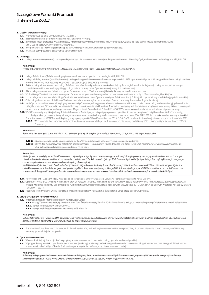 Szczegółowe Warunki Promocji „Internet za ZŁO...” 1. Ogólne warunki Promocji: 1.1. Promocja trwa od dnia 01.08.2011 r. do 31.10.2011 r. 1.2. Zastrzegamy prawo do skrócenia czasu obowiązywania Promocji. 1.3. Z Promocji może skorzystać wyłącznie Nowy Abonent będący Konsumentem w rozumieniu Ustawy z dnia 16 lipca 2004 r. Prawo Telekomunikacyjne (art. 2 ust. 18 Ustawy Prawo Telekomunikacyjne). 1.4. Integralną częścią Promocji jest Netia Spot, który udostępniamy na warunkach opisanych poniżej. 1.5. Wszystkie ceny podane w dokumencie są cenami brutto. 2. Definicje: 2.1. Usługa Internetowa (Internet) – usługa stałego dostępu do internetu, wraz z opcjami Bezpieczny Internet i Wirtualny Dysk, realizowana w technologiach: BSA, LLU, CU. Komentarz: Wraz z aktywacją Usługi Internetowej jednocześnie włączamy dwie opcje – Bezpieczny Internet oraz Wirtualny Dysk. 2.2. Usługa Telefoniczna (Telefon) – usługa głosowa realizowana w oparciu o technologie: WLR, LLU, CU. 2.3. Usługa Mobilny Internet (Mobilny Internet) – usługa dostępu do internetu realizowana poprzez sieć UMTS operatora P4 Sp. z o.o. W przypadku zakupu Usługi Mobilny Internet bez Usługi Internetowej, aktywowana jest także opcja Bezpieczny Internet. 2.4. Pakiet – Usługa Internetowa oraz Usługa Telefoniczna zakupione łącznie na warunkach niniejszej Promocji albo zakupienie jednej z Usług wraz z jednoczesnym przedłużeniem Umowy na drugą Usługę; Usługi świadczone są przez Operatora na tej samej linii telefonicznej. 2.5. BSA – Usługa Internetowa świadczona przez Operatora na łączu Telekomunikacji Polskiej SA w oparciu o Bitstream Access. 2.6. WLR – Usługa Telefoniczna realizowana przez Operatora w oparciu o hurtowy zakup abonamentu, realizowana na łączu Telekomunikacji Polskiej SA. 2.7. LLU – Usługa Internetowa i/lub Usługa Telefoniczna świadczone przez Operatora na łączu Telekomunikacji Polskiej SA poprzez dostęp do lokalnej pętli abonenckiej. 2.8.. CU – Usługa Internetowa i/lub Usługa Telefoniczna świadczone z wykorzystaniem łącz Operatora opartych na technologii miedzianej. 2.9. Netia Spot – router bezprzewodowy będący własnością Operatora, udostępniony Abonentowi w ramach Umowy o świadczenie usług telekomunikacyjnych w zakresie Usługi Internetowej. W przypadku rozwiązania Umowy przez Abonenta lub Operatora Abonent zobowiązany jest do odesłania urządzenia, wraz z wszystkimi przekazanymi elementami w stanie nieuszkodzonym, na adres: Magazyn Netii Platan Park, ul. Poleczki 21, 02-822 Warszawa, w terminie do 14 dni od dnia rozwiązania Umowy, 2.10. Wi-Fi Community – aplikacja domyślnie instalowana na Netia Spot, udostępniająca pasmo częstotliwości na potrzeby innych użytkowników Wi-Fi Community, umożliwiająca korzystanie z udostępnionego pasma w celu uzyskania dostępu do internetu, stworzona przez FON WIRELESS, Ltd., spółkę zarejestrowaną w Wielkiej Brytanii, o numerze 5661131, z siedzibą firmy znajdującą się na 8, Clifford Street, London W1S, 2LQ („Fon”); uruchomienie aplikacji planowane jest na 1 września 2011 r. 2.10.1. W momencie skorzystania z Netia Spot router w ustawieniach fabrycznych automatycznie tworzy dodatkowy SSID udostępniający łącze członkom Wi-Fi Community. Komentarz: Stworzona sieć zewnętrzna jest niezależna od sieci wewnętrznej, z której korzysta wyłącznie Abonent, oraz posiada niższy priorytet ruchu. 2.10.2. Abonent wyraża zgodę na przekazanie do Fon Wireless informacji na temat miejsca instalacji urządzenia. 2.10.3. Aby zostać pełnoprawnym członkiem społeczności Wi-Fi Community, trzeba dokonać rejestracji Netia Spot za pomocą serwisu www.netiaonline.pl lub z aplikacji znajdującej się na urządzeniu Netia Spot. Komentarz: Netia Spot to router dający możliwość automatycznej konfiguracji połączenia internetowego oraz łatwej obsługi i prostego rozwiązywania problemów technicznych. Urządzenie oferuje również możliwość korzystania z dodatkowych funkcjonalności (jak np. Wi-Fi Community ). Netia Spot jest integralną częścią Promocji, rezygnacja i zwrot urządzenia nie oznacza braku naliczania opłaty aktywacyjnej. Wi-Fi Community to sieć ponad 2 milionów hot spotów na całym świecie. Za korzystanie z hot spotów przez członków społeczności Netia nie pobiera opłat. By zostać członkiem społeczności, należy zarejestrować posiadany Netia Spot wraz z aktywną aplikacją FON. Informacje dotyczące Wi-Fi Community można znaleźć na stronie www.netia.pl. Rezygnacji z funkcjonalności można dokonać za pomocą serwisu www.netiaonline.pl lub aplikacji zainstalowanej na urządzeniu Netia Spot. 2.11. Nowy Abonent – Abonent, który nie posiada obowiązującej Umowy w zakresie Usługi, na którą ma być zawarta nowa Umowa. 2.12. Operator – Netia SA, z siedzibą w Warszawie przy ul. Poleczki 13, 02-822 Warszawa, zarejestrowana w Sądzie Rejonowym dla m.st. Warszawy, Sąd Gospodarczy, XIII Wydział Krajowego Rejestru Sądowego pod numerem KRS 0000041649, o kapitale zakładowym w wysokości 391 042 968 PLN opłaconym w całości, NIP 526-02-05-575, REGON 011566374. 2.13. Pozostałe terminy pisane wielką literą mają znaczenie określone w Regulaminie Świadczenia Usług przez Spółki Grupy Netia. 3. Usługi dostępne w ramach Promocji: 3.1. W ramach niniejszej Promocji oferujemy następujące Usługi: 3.1.1. Usługę Telefoniczną z taryfą Non Stop, Non Stop Świat lub Lepszy Telefon 60 (brak możliwości zakupu samodzielnej Usługi Telefonicznej w technologii LLU). 3.1.2. Usługę Internetową w wariancie MAX. 3.1.3. Usługę Mobilnego Internetu w wariancie 2 GB lub 4 GB. Komentarz: Usługa Internetowa w wariancie MAX oznacza maksymalnie osiągalną prędkość łącza, która gwarantuje stabilne korzystanie z Usługi; dla technologii BSA maksymalna prędkość zostanie osiągnięta w terminie do 30 dni od chwili aktywacji Usługi. 3.2. Brak możli