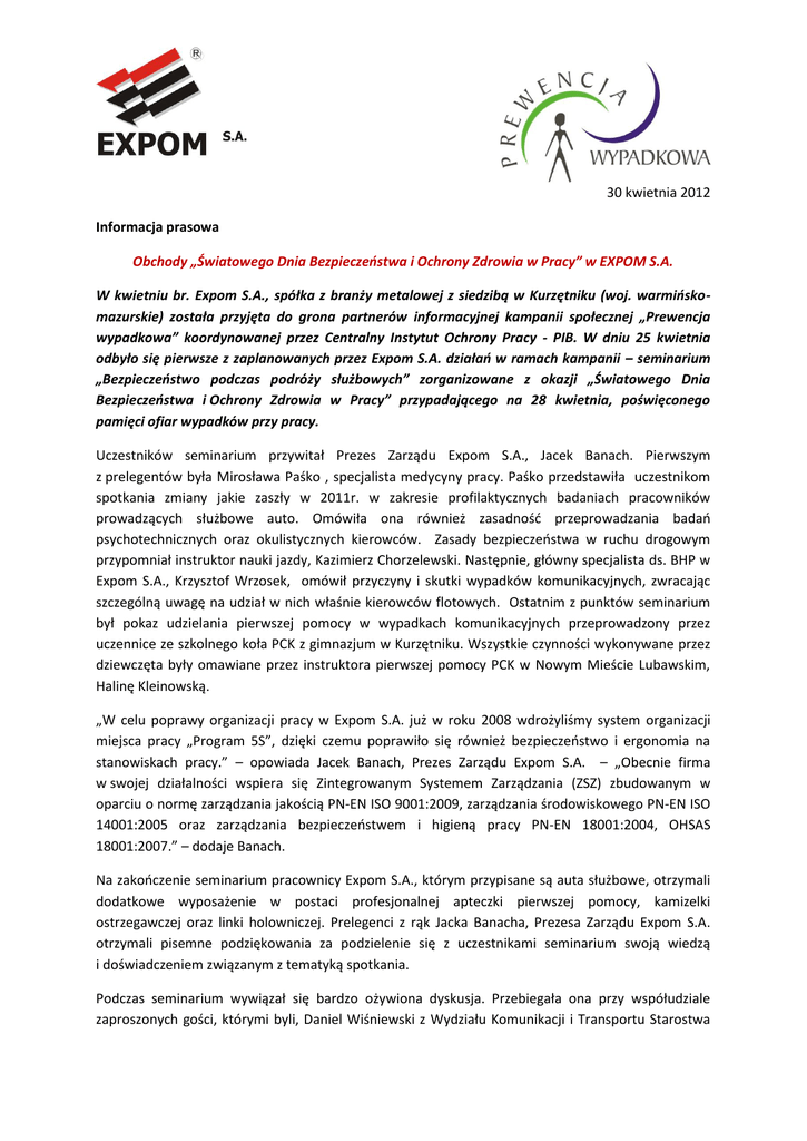 30 kwietnia 2012 Informacja prasowa Obchody „Światowego Dnia Bezpieczeństwa i Ochrony Zdrowia w Pracy” w EXPOM S.A. W kwietniu br. Expom S.A., spółka z branży metalowej z siedzibą w Kurzętniku (woj. warmińskomazurskie) została przyjęta do grona partnerów informacyjnej kampanii społecznej „Prewencja wypadkowa” koordynowanej przez Centralny Instytut Ochrony Pracy - PIB. W dniu 25 kwietnia odbyło się pierwsze z zaplanowanych przez Expom S.A. działań w ramach kampanii – seminarium „Bezpieczeństwo podczas podróży służbowych” zorganizowane z okazji „Światowego Dnia Bezpieczeństwa i Ochrony Zdrowia w Pracy” przypadającego na 28 kwietnia, poświęconego pamięci ofiar wypadków przy pracy. Uczestników seminarium przywitał Prezes Zarządu Expom S.A., Jacek Banach. Pierwszym z prelegentów była Mirosława Paśko , specjalista medycyny pracy. Paśko przedstawiła uczestnikom spotkania zmiany jakie zaszły w 2011r. w zakresie profilaktycznych badaniach pracowników prowadzących służbowe auto. Omówiła ona również zasadność przeprowadzania badań psychotechnicznych oraz okulistycznych kierowców. Zasady bezpieczeństwa w ruchu drogowym przypomniał instruktor nauki jazdy, Kazimierz Chorzelewski. Następnie, główny specjalista ds. BHP w Expom S.A., Krzysztof Wrzosek, omówił przyczyny i skutki wypadków komunikacyjnych, zwracając szczególną uwagę na udział w nich właśnie kierowców flotowych. Ostatnim z punktów seminarium był pokaz udzielania pierwszej pomocy w wypadkach komunikacyjnych przeprowadzony przez uczennice ze szkolnego koła PCK z gimnazjum w Kurzętniku. Wszystkie czynności wykonywane przez dziewczęta były omawiane przez instruktora pierwszej pomocy PCK w Nowym Mieście Lubawskim, Halinę Kleinowską. „W celu poprawy organizacji pracy w Expom S.A. już w roku 2008 wdrożyliśmy system organizacji miejsca pracy „Program 5S”, dzięki czemu poprawiło się również bezpieczeństwo i ergonomia na stanowiskach pracy.” – opowiada Jacek Banach, Prezes Zarządu Expom S.A. – „Obecnie firma w swojej działalności wspiera się Zintegrowanym Systemem Zarządzania (ZSZ) zbudowanym w oparciu o normę zarządzania jakością PN-EN ISO 9001:2009, zarządzania środowiskowego PN-EN ISO 14001:2005 oraz zarządzania bezpieczeństwem i higieną pracy PN-EN 18001:2004, OHSAS 18001:2007.” – dodaje Banach. Na zakończenie seminarium pracownicy Expom S.A., którym przypisane są auta służbowe, otrzymali dodatkowe wyposażenie w postaci profesjonalnej apteczki pierwszej pomocy, kamizelki ostrzegawczej oraz linki holowniczej. Prelegenci z rąk Jacka Banacha, Prezesa Zarządu Expom S.A. otrzymali pisemne podziękowania za podzielenie się z uczestnikami seminarium swoją wiedzą i doświadczeniem związanym z tematyką spotkania. Podczas seminarium wywiązał się bardzo ożywiona dyskusja. Przebiegała ona przy współudziale zaproszonych gości, którymi byli, Daniel Wiśniewski z Wydziału Komunikacji i Transportu Starostwa Powiatowego w Nowym Mieście Lub. oraz Naczelnik Wydziału Prewencji i Ruchu Drogowego nadkomisarz Krzysztof Grugiel wraz z z-cą podkomisarzem Waldemarem Bartnickim z Komendy Powiatowej Policji. Firma Expom S.A. prowadząca od prawie 60 lat działalność w branży metalowej specjalizuje się w produkcji wysoko przetworzonego produktu finalnego. Expom S.A. wytwarza części, zespoły i urządzenia dla przemysłu energetycznego, okrętowego, wydobywczego, budowlanego i innych. Ponad 90% produkcji realizowana jest w oparciu o zamówienia klientów zagranicznych. Kluczowe obszary, w których firma prowadzi działalność i chce się rozwijać to energetyka odnawialna (kotły na biomasę, konstrukcje dla elektrowni wodnych, małe elektrownie wiatrowe), branża gazowo-naftowa (elementy maszyn do budowy rurociągów, stalowe konstrukcje spawane do poszukiwań i wydobycia gazu niekonwencjonalnego) oraz branża okrętowa (kompaktowe żurawie okrętowe i elementy dźwigów). Expom S.A. zatrudnia około 160 wysoko wykwalifikowanych pracowników i posiada własne biuro technologiczno-konstrukcyjne, a także pięć hal produkcyjnych o łącznej powierzchni 6500mkw wraz z parkiem maszynowym. Firma posiada zezwolenia, certyfikaty i świadectwa dotyczące systemu zapewnienia jakości produkcji, a także system zarządzania zgodny z normami ISO. Firma ma swoją siedzibę w Kurzętniku (woj. warmińsko-mazurskie). Strona internetowa Spółki: www.expom.pl
