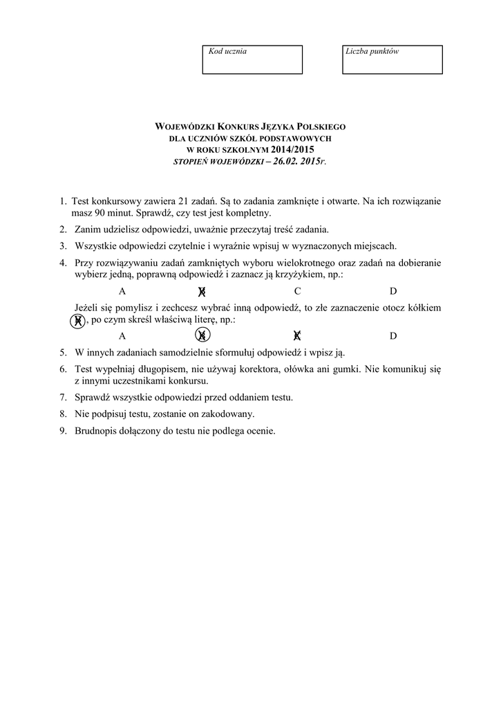 Liczba punktów Kod ucznia WOJEWÓDZKI KONKURS JĘZYKA POLSKIEGO DLA UCZNIÓW SZKÓŁ PODSTAWOWYCH W ROKU SZKOLNYM 2014/2015 STOPIEŃ WOJEWÓDZKI – 26.02. 2015r. 1. Test konkursowy zawiera 21 zadań. Są to zadania zamknięte i otwarte. Na ich rozwiązanie masz 90 minut. Sprawdź, czy test jest kompletny. 2. Zanim udzielisz odpowiedzi, uważnie przeczytaj treść zadania. 3. Wszystkie odpowiedzi czytelnie i wyraźnie wpisuj w wyznaczonych miejscach. 4. Przy rozwiązywaniu zadań zamkniętych wyboru wielokrotnego oraz zadań na dobieranie wybierz jedną, poprawną odpowiedź i zaznacz ją krzyżykiem, np.: A XB C D Jeżeli się pomylisz i zechcesz wybrać inną odpowiedź, to złe zaznaczenie otocz kółkiem XB , po czym skreśl właściwą literę, np.: A XB XC D 5. W innych zadaniach samodzielnie sformułuj odpowiedź i wpisz ją. 6. Test wypełniaj długopisem, nie używaj korektora, ołówka ani gumki. Nie komunikuj się z innymi uczestnikami konkursu. 7. Sprawdź wszystkie odpowiedzi przed oddaniem testu. 8. Nie podpisuj testu, zostanie on zakodowany. 9. Brudnopis dołączony do testu nie podlega ocenie. WOJEWÓDZKIE KONKURSY PRZEDMIOTOWE 2014/2015 – SZKOŁA PODSTAWOWA STOPIEŃ WOJEWÓDZKI Tekst I Jan Kochanowski Na młodość Jakoby też rok bez wiosny mieć chcieli, Którzy chcą, żeby młodzi nie szaleli. Zadanie 1. (1 p.) Dokończ poniższe zdanie – wybierz właściwą odpowiedź spośród podanych. Według Kochanowskiego skłonność do zabawy jest u młodych ludzi cechą A. rzadką. B. typową. C. naganną. D. zaskakującą. Tekst II Jan Kochanowski Na starość Biedna starości, wszyscy cię żądamy, A kiedy przyjdziesz, to zaś narzekamy. Zadanie 2. (1 p.) Które przysłowie wyraża podobną myśl jak fraszka Na starość? Wybierz odpowiedź spośród podanych. A. Kto sieje wiatr, ten zbiera burzę. B. Przysłowie to stare: We wszystkim znaj miarę. C. Jeszcze się taki nie urodził, co by każdemu dogodził. D. Czego się Jaś nie nauczy, tego Jan nie będzie umiał. Zadanie 3. (1 p.) Które zdanie informuje o cechach gatunkowych fraszek Na młodość i Na starość? Wybierz odpowiedź spośród podanych. A. Zostały napisane przez Jana Kochanowskiego. B. Odnoszą się do życia człowieka. C. Mają formę zdań złożonych. D. Są zwięzłe i dowcipne. 2 z 12 WOJEWÓDZKIE KONKURSY PRZEDMIOTOWE 2014/2015 – SZKOŁA PODSTAWOWA STOPIEŃ WOJEWÓDZKI Tekst III Jan Sztaudynger Przyjaciel Dał mi przyjaźni dowody, Utopił mnie w łyżce wody. Zadanie 4. (2 p.) Napisz, jaki frazeologizm został wykorzystany we fraszce Przyjaciel. Wyjaśnij jego znaczenie. frazeologizm – …………………………………………………………………………………. znaczenie – …………………………………………………………………………………….. Tekst IV Jan Sztaudynger Skromny Opierał czubek swego nosa O niebiosa. Zadanie 5. (2 p.) Wyjaśnij, jaką funkcję pełni tytuł fraszki Skromny. Uzasadnij swoją odpowiedź. …………………………………………………………………………………………………. …………………………………………………………………………………………………. ………………………………………………………………………………………………….. Tekst V „Ojciec go nie chce”... Było w tym zdaniu coś przerażającego. Zdarzało się przecież, że dorośli wspominali o jakichś złych rodzicach, o zaniedbywanych, niekochanych dzieciach – nigdy jednak ani Pestka, ani Marian i Julek nie zetknęli się z kimś takim bezpośrednio. Czuli takie zdumienie, jakby się dowiedzieli, że po zimie nie będzie wiosny, że po nocy nie będzie dnia. Ojciec może się gniewać, może nawet być niesprawiedliwy, ale przecież to ojciec! A dom? Bywa w nim wesoło lub nudno, przyjemnie, czasem źle – ale jak można być gdzie indziej? Chętnie się z niego wybiega, odchodzi, wyjeżdża – ale zawsze się do niego wraca, bo to jest jedyne miejsce na świecie, które tak do każdego pasuje jak skóra do ciała. Pestce staje przed oczami jej kącik w warszawskim pokoju mamy, gdzie stoi stolik z dwiema szufladami, przy którym odrabia się lekcje. W szufladach, oprócz zeszytów, są rozmaite rzeczy, do których jest się przywiązanym i które miło wziąć w rękę, żeby oddalić pisanie ćwiczenia czy wypracowania choć na chwilę. Ojciec, wróciwszy z biura, wkłada tu czasem czekoladę albo jabłko, albo pomarańczę. Robi to zawsze niepostrzeżenie. Pestka, znajdując prezencik, udaje, że nie ma pojęcia, skąd się mógł wziąć, ojciec robi minę człowieka, który nie rozumie, o co chodzi, i zwala wszystko na mamę, mama odrzuca podejrzenie w sposób kategoryczny – i wszyscy troje śmieją się, że w domu muszą być duchy... 3 z 12 WOJEWÓDZKIE KONKURSY PRZEDMIOTOWE 2014/2015 – SZKOŁA PODSTAWOWA STOPIEŃ WOJEWÓDZKI Marian widzi przed sobą ojca, który siedzi po drugiej stronie dużego stołu, w kręgu lampy... Rozłożył arkusz milimetrowego papieru, rysuje i robi obliczenia, niedługo zacznie budowę nowego budynku. Przyjemnie jest patrzeć na precyzyjne, cienkie linie, na małe i równo wypisane cyferki, toteż Marian często odrywa wzrok od książki. W jakiejś chwili mama każe im się „z tym wszystkim” zabierać, będzie szykowała kolację. Ojciec protestuje, mruczy, wreszcie jednak składa papiery i mówi: „Chodź, synu, my tu nie rządzimy. Tylko mama tu rządzi, znaczymy tu tyle, co nic”. I od razu wie się doskonale, że te rządy bardzo się ojcu podobają... Julkowi przypomina się uchwyt maminej ręki, która go zatrzymuje w progu. „A szalik? A czapka?” Bierze się szalik i czapkę, przy sposobności mama wsuwa do teczki cukierek albo kawałek słodkiej bułki, jeżeli tylko coś takiego jest w domu, i mówi do Heli: „Helciu, idźcie razem, jesteś starsza, pilnuj, żeby się nie spóźnił i niech 