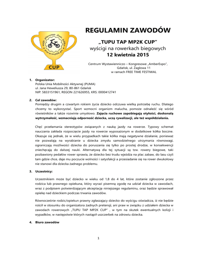 REGULAMIN ZAWODÓW „TUPU TAP MP2K CUP” wyścigi na rowerkach biegowych 12 kwietnia 2015 Centrum Wystawienniczo – Kongresowe „AmberExpo”, Gdańsk, ul. Żaglowa 11 w ramach FREE TIME FESTIWAL 1. Organizator: Polska Unia Mobilności Aktywnej (PUMA) ul. Jana Heweliusza 29, 80-861 Gdańsk NIP: 5833151961, REGON 221626955, KRS: 0000412741 2. Cel zawodów: Pomiędzy drugim a czwartym rokiem życia dziecko odczuwa wielką potrzebę ruchu. Dlatego chcemy to wykorzystać. Sport wzmocni organizm malucha, pomoże odnaleźć się wśród rówieśników a także rozwinie umysłowo. Zajęcia ruchowe zapobiegają otyłości, doskonalą wytrzymałość, wzmacniają odporność dziecka, uczą rywalizacji, ale też współdziałania. Chęć przełamania stereotypów związanych z nauką jazdy na rowerze. Typowy schemat nauczania zakłada rozpoczęcie jazdy na rowerze wyposażonym w dodatkowe kółka boczne. Okazuje się jednak, że w wielu przypadkach takie kółka mają negatywne działanie, ponieważ nie pozwalają na wyrabianie u dziecka zmysłu samodzielnego utrzymania równowagi, ograniczają możliwości dziecka do poruszania się tylko po prostej drodze, w konsekwencji zniechęcają do dalszej nauki. Alternatywą dla tej sytuacji są tzw. rowery biegowe, taki pozbawiony pedałów rower sprawia, że dziecko bez trudu wjeżdża na plac zabaw, do lasu czyli tam gdzie chce, daje mu poczucie wolności i satysfakcji a przesiadanie się na rower dwukołowy nie stanowi dla dziecka żadnego problemu. 3. Uczestnicy: Uczestnikiem może być dziecko w wieku od 1,8 do 4 lat, które zostanie zgłoszone przez rodzica lub prawnego opiekuna, który wyrazi pisemną zgodę na udział dziecka w zawodach, wraz z podpisem potwierdzającym akceptację niniejszego regulaminu, oraz będzie sprawował opiekę nad dzieckiem podczas trwania zawodów. Równocześnie rodzic/opiekun prawny zgłaszający dziecko do wyścigu oświadcza, iż nie będzie rościł w stosunku do organizatora żadnych pretensji, ani praw w związku z udziałem dziecka w zawodach rowerowych „TUPU TAP MP2K CUP” , w tym na skutek ewentualnych kolizji i wypadków, w następstwie których nastąpił uszczerbek na zdrowiu dziecka. 4. Biuro zawodów 1 Centrum Wystawienniczo – Kongresowe „AmberExpo” w Gdańsku, ul. Żaglowa 11. Biuro zawodów zlokalizowane w w/w miejscu, czynne w dniu zawodów od 10:00 do 17:30. Dyrektor Zawodów – Rafał Glazik. 5. Kategorie wiekowe do 2,5 lat (razem dziewczynki i chłopcy) od 2,5 do 3 lat (razem dziewczynki i chłopcy) od 3 do 3,5 roku (razem dziewczynki i chłopcy) od 3,5 do 4 lat (razem dziewczynki i chłopcy) Trasa będzie oznakowana taśmami. 6. Godziny startów 12 kwietnia 2015 roku 10:00 – 12:00 Rejestracja uczestników (przydzielenie numerów startowych), jazdy próbne po torze wyścigowym 12:00 – 13:00 Zawody – grupa wiekowa do 2,5 roku - wręczenie medali pamiątkowych 13:00 – 13:30 Rejestracja uczestników i jazdy próbne po torze wyścigowym grupy wiekowej 2,5 - 3 lata 13:30 – 14:30 Zawody grupa wiekowa 2,5 – 3 lata, wręczenie medali pamiątkowych LOSOWANIE PIERWSZEJ NAGRODY GŁÓWNEJ weekendowy rodzinny pobyt w hotelu „ZIELONA BRAMA” dla uczestników w kategorii wiekowej 1,8 – 3 lata. 14:30 – 15:00 Rejestracja uczestników i jazdy próbne po torze wyścigowym grupy wiekowej 3 – 3,5 roku 15:00 – 16:00 Zawody grupa wiekowa 3 – 3,5 roku - wręczenie medali pamiątkowych 16:00 – 16:30 Rejestracja uczestników i jazdy próbne po torze wyścigowym grupy wiekowej 3,5 – 4 lata 16:30 – 17:30 Zawody grupa wiekowa 3,5 – 4 lata – wręczenie medali pamiątkowych LOSOWANIE PIERWSZEJ NAGRODY GŁÓWNEJ weekendowy rodzinny pobyt w hotelu „ZIELONA BRAMA” dla uczestników w kategorii wiekowej 1,8 – 3 lata. Zakończenie zawodów 7. Nagrody „TUPU TAP MP2K CUP” to impreza przeznaczona dla najmłodszych miłośników dwóch kółek. W formie zabawy realizowane będą wyścigi na rowerkach biegowych w trzech grupach wiekowych od 1,8 do 4 lat. Czy jesteś zaawansowany czy początkującym, nie ma to znaczenia liczą się emocje i co najważniejsze każdy startujący otrzyma pamiątkowy medal. Każdy z 2 zarejestrowanych zawodników otrzyma upominki od organizatora. Zwycięzcy poszczególnych wyścigów otrzymają pamiątkowy puchar. 8. Nagrody do rozlosowania Wśród zarejestrowanych uczestników zostaną rozlosowane dwie nagrody główne. Pierwsza nagroda główna – weekendowy rodzinny pobyt w hotelu „ZIELONA BRAMA” dla uczestników w kategorii wiekowej 1,8 – 3 lata. Druga nagroda główna - weekendowy rodzinny pobyt w hotelu „KOZI GRÓD” dla uczestników w kategorii wiekowej 3,5 - 4 lata. 9. Nagroda dla przedszkola w ramach konkursu „Przedszkole na KOLE” Przedszkole, z którego zostanie zgłoszona największa liczba zawodników otrzyma nagrodę w postaci bezpłatnego wejścia do „ŚWIATA LABIRYNTÓW” Bliziny. Informacja o nagrodzie zostanie ogłoszona na stronie www.mp2k.pl . 10. Rejestracja Rejestracji należy dokonać, wypełniając formularz zgłoszeniowy podany na stronie internetowej www.mp2k.pl oraz w informacjach przesyłanych przez organizatora. 11. Wpisowe Wpisowe należy uiścić przelewem na konto organizatora podane w formularzu zgłoszeniowym i stronie internetowej www.mp2k.pl do dnia 12 kwietnia 2015 roku do godziny 11:00. Osoby dokonujące przelewu w dniu 10, 11 lub 12 kwietnia 2015 roku, proszone są o zabranie ze sobą dowodu wpłaty i okazanie go w biurze zawodów przed startem. Wpisowe wynosi 29 zł za jednego uczestnika – zawodnika. Dane do przelewu: Polska Unia Mobilności Aktywnej (PUMA) ul. Jana Heweliusza 29, 80-861 Gdańsk Bank Pekao: 53 1240 1268 1111 0010 4451 7200 12. Odpowiedzialność Pełną odpowiedzialność za dzieci ponoszą rodzice lub opiekunowie prawni, którzy wypełniają formularz zgłoszeniowy po przez stronę internetową www.mp2k.pl, akceptując regulamin zawodów i podpisując w ten sposób zgodę iż ka