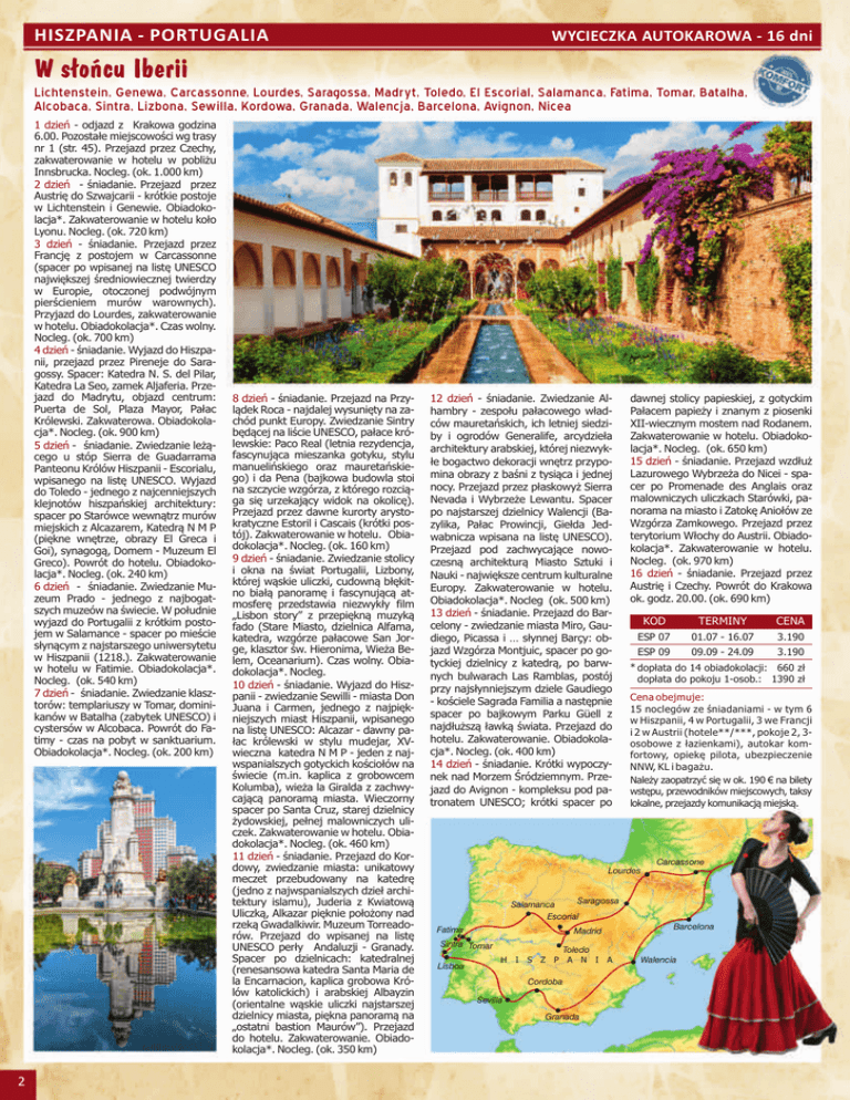 HISZPANIA - PORTUGALIA WYCIECZKA AUTOKAROWA - 16 dni W s ło ń c u I b e r i i Lichtenstein, Genewa, Carcassonne, Lourdes, Saragossa, Madryt, Toledo, El Escorial, Salamanca, Fatima, Tomar, Batalha, Alcobaca, Sintra, Lizbona, Sewilla, Kordowa, Granada, Walencja, Barcelona, Avignon, Nicea 1 dzieñ - odjazd z Krakowa godzina 6.00. Pozosta³e miejscowoœci wg trasy nr 1 (str. 45). Przejazd przez Czechy, zakwaterowanie w hotelu w pobli¿u Innsbrucka. Nocleg. (ok. 1.000 km) 2 dzieñ - œniadanie. Przejazd przez Austriê do Szwajcarii - krótkie postoje w Lichtenstein i Genewie. Obiadokolacja*. Zakwaterowanie w hotelu ko³o Lyonu. Nocleg. (ok. 720 km) 3 dzieñ - œniadanie. Przejazd przez Francjê z postojem w Carcassonne (spacer po wpisanej na listê UNESCO najwiêkszej œredniowiecznej twierdzy w Europie, otoczonej podwójnym pierœcieniem murów warownych). Przyjazd do Lourdes, zakwaterowanie w hotelu. Obiadokolacja*. Czas wolny. Nocleg. (ok. 700 km) 4 dzieñ - œniadanie. Wyjazd do Hiszpanii, przejazd przez Pireneje do Saragossy. Spacer: Katedra N. S. del Pilar, Katedra La Seo, zamek Aljaferia. Przejazd do Madrytu, objazd centrum: Puerta de Sol, Plaza Mayor, Pa³ac Królewski. Zakwaterowa. Obiadokolacja*. Nocleg. (ok. 900 km) 5 dzieñ - œniadanie. Zwiedzanie le¿¹cego u stóp Sierra de Guadarrama Panteonu Królów Hiszpanii - Escorialu, wpisanego na listê UNESCO. Wyjazd do Toledo - jednego z najcenniejszych klejnotów hiszpañskiej architektury: spacer po Starówce wewn¹trz murów miejskich z Alcazarem, Katedr¹ N M P (piêkne wnêtrze, obrazy El Greca i Goi), synagog¹, Domem - Muzeum El Greco). Powrót do hotelu. Obiadokolacja*. Nocleg. (ok. 240 km) 6 dzieñ - œniadanie. Zwiedzanie Muzeum Prado - jednego z najbogatszych muzeów na œwiecie. W po³udnie wyjazd do Portugalii z krótkim postojem w Salamance - spacer po mieœcie s³yn¹cym z najstarszego uniwersytetu w Hiszpanii (1218.). Zakwaterowanie w hotelu w Fatimie. Obiadokolacja*. Nocleg. (ok. 540 km) 7 dzieñ - œniadanie. Zwiedzanie klasztorów: templariuszy w Tomar, dominikanów w Batalha (zabytek UNESCO) i cystersów w Alcobaca. Powrót do Fatimy - czas na pobyt w sanktuarium. Obiadokolacja*. Nocleg. (ok. 200 km) 2 8 dzieñ - œniadanie. Przejazd na Przyl¹dek Roca - najdalej wysuniêty na zachód punkt Europy. Zwiedzanie Sintry bêd¹cej na liœcie UNESCO, pa³ace królewskie: Paco Real (letnia rezydencja, fascynuj¹ca mieszanka gotyku, stylu manueliñskiego oraz mauretañskiego) i da Pena (bajkowa budowla stoi na szczycie wzgórza, z którego rozci¹ga siê urzekaj¹cy widok na okolicê). Przejazd przez dawne kurorty arystokratyczne Estoril i Cascais (krótki postój). Zakwaterowanie w hotelu. Obiadokolacja*. Nocleg. (ok. 160 km) 9 dzieñ - œniadanie. Zwiedzanie stolicy i okna na œwiat Portugalii, Lizbony, której w¹skie uliczki, cudown¹ b³êkitno bia³¹ panoramê i fascynuj¹c¹ atmosferê przedstawia niezwyk³y film „Lisbon story” z przepiêkn¹ muzyk¹ fado (Stare Miasto, dzielnica Alfama, katedra, wzgórze pa³acowe San Jorge, klasztor œw. Hieronima, Wie¿a Belem, Oceanarium). Czas wolny. Obiadokolacja*. Nocleg. 10 dzieñ - œniadanie. Wyjazd do Hiszpanii - zwiedzanie Sewilli - miasta Don Juana i Carmen, jednego z najpiêkniejszych miast Hiszpanii, wpisanego na listê UNESCO: Alcazar - dawny pa³ac królewski w stylu mudejar, XVwieczna katedra N M P - jeden z najwspanialszych gotyckich koœcio³ów na œwiecie (m.in. kaplica z grobowcem Kolumba), wie¿a la Giralda z zachwycaj¹c¹ panoram¹ miasta. Wieczorny spacer po Santa Cruz, starej dzielnicy ¿ydowskiej, pe³nej malowniczych uliczek. Zakwaterowanie w hotelu. Obiadokolacja*. Nocleg. (ok. 460 km) 11 dzieñ - œniadanie. Przejazd do Kordowy, zwiedzanie miasta: unikatowy meczet przebudowany na katedrê (jedno z najwspanialszych dzie³ architektury islamu), Juderia z Kwiatow¹ Uliczk¹, Alkazar piêknie po³o¿ony nad rzek¹ Gwadalkiwir. Muzeum Torreadorów. Przejazd do wpisanej na listê UNESCO per³y Andaluzji - Granady. Spacer po dzielnicach: katedralnej (renesansowa katedra Santa Maria de la Encarnacion, kaplica grobowa Królów katolickich) i arabskiej Albayzin (orientalne w¹skie uliczki najstarszej dzielnicy miasta, piêkna panoram¹ na „ostatni bastion Maurów”). Przejazd do hotelu. Zakwaterowanie. Obiadokolacja*. Nocleg. (ok. 350 km) 12 dzieñ - œniadanie. Zwiedzanie Alhambry - zespo³u pa³acowego w³adców mauretañskich, ich letniej siedziby i ogrodów Generalife, arcydzie³a architektury arabskiej, której niezwyk³e bogactwo dekoracji wnêtrz przypomina obrazy z baœni z tysi¹ca i jednej nocy. Przejazd przez p³askowy¿ Sierra Nevada i Wybrze¿e Lewantu. Spacer po najstarszej dzielnicy Walencji (Bazylika, Pa³ac Prowincji, Gie³da Jedwabnicza wpisana na listê UNESCO). Przejazd pod zachwycaj¹ce nowoczesn¹ architektur¹ Miasto Sztuki i Nauki - najwiêksze centrum kulturalne Europy. Zakwaterowanie w hotelu. Obiadokolacja*. Nocleg (ok. 500 km) 13 dzieñ - œniadanie. Przejazd do Barcelony - zwiedzanie miasta Miro, Gaudiego, Picassa i … s³ynnej Barçy: objazd Wzgórza Montjuic, spacer po gotyckiej dzielnicy z katedr¹, po barwnych bulwarach Las Ramblas, postój przy najs³ynniejszym dziele Gaudiego - koœciele Sagrada Familia a nastêpnie spacer po bajkowym Parku Güell z najd³u¿sz¹ ³awk¹ œwiata. Przejazd do hotelu. Zakwaterowanie. Obiadokolacja*. Nocleg. (ok. 400 km) 14 dzieñ - œniadanie. Krótki wypoczynek nad Morzem Œródziemnym. Przejazd do Avignon - kompleksu pod patronatem UNESCO; krótki spacer po po . dawnej stolicy papieskiej, z gotyckim Pa³acem papie¿y i znanym z piosenki XII-wiecznym mostem nad Rodanem. Zakwaterowanie w hotelu. Obiadokolacja*. Nocleg. (ok. 650 km) 15 dzieñ - œniadanie. Przejazd wzd³u¿ Lazurowego Wybrze¿a do Nicei - spacer po Promenade des Anglais oraz malowniczych uliczkach Starówki, panorama na miasto i Zatokê Anio³ów ze Wzgórza Zamkowego. Przejazd przez terytorium W³ochy do Austrii. Obia