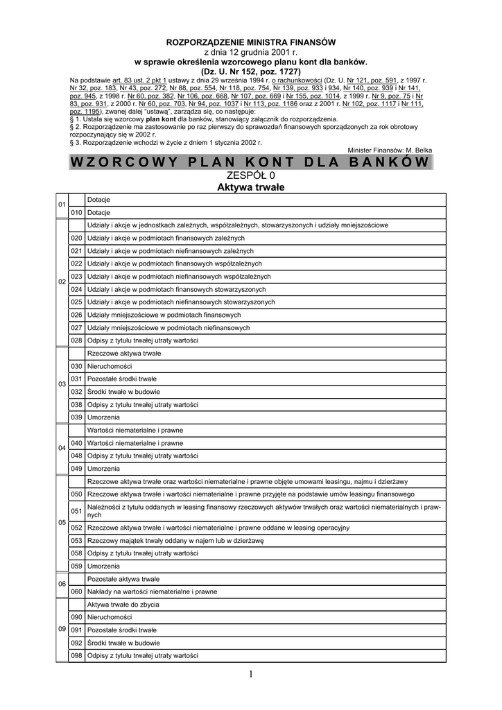 ROZPORZĄDZENIE MINISTRA FINANSÓW z dnia 12 grudnia 2001 r. w sprawie określenia wzorcowego planu kont dla banków. (Dz. U. Nr 152, poz. 1727) Na podstawie art. 83 ust. 2 pkt 1 ustawy z dnia 29 września 1994 r. o rachunkowości (Dz. U. Nr 121, poz. 591, z 1997 r. Nr 32, poz. 183, Nr 43, poz. 272, Nr 88, poz. 554, Nr 118, poz. 754, Nr 139, poz. 933 i 934, Nr 140, poz. 939 i Nr 141, poz. 945, z 1998 r. Nr 60, poz. 382, Nr 106, poz. 668, Nr 107, poz. 669 i Nr 155, poz. 1014, z 1999 r. Nr 9, poz. 75 i Nr 83, poz. 931, z 2000 r. Nr 60, poz. 703, Nr 94, poz. 1037 i Nr 113, poz. 1186 oraz z 2001 r. Nr 102, poz. 1117 i Nr 111, poz. 1195), zwanej dalej “ustawą”, zarządza się, co następuje: § 1. Ustala się wzorcowy plan kont dla banków, stanowiący załącznik do rozporządzenia. § 2. Rozporządzenie ma zastosowanie po raz pierwszy do sprawozdań finansowych sporządzonych za rok obrotowy rozpoczynający się w 2002 r. § 3. Rozporządzenie wchodzi w życie z dniem 1 stycznia 2002 r. Minister Finansów: M. Belka WZORCOWY PLAN KONT DLA BANKÓW ZESPÓŁ 0 Aktywa trwałe Dotacje 01 010 Dotacje Udziały i akcje w jednostkach zależnych, współzależnych, stowarzyszonych i udziały mniejszościowe 020 Udziały i akcje w podmiotach finansowych zależnych 021 Udziały i akcje w podmiotach niefinansowych zależnych 022 Udziały i akcje w podmiotach finansowych współzależnych 02 023 Udziały i akcje w podmiotach niefinansowych współzależnych 024 Udziały i akcje w podmiotach finansowych stowarzyszonych 025 Udziały i akcje w podmiotach niefinansowych stowarzyszonych 026 Udziały mniejszościowe w podmiotach finansowych 027 Udziały mniejszościowe w podmiotach niefinansowych 028 Odpisy z tytułu trwałej utraty wartości Rzeczowe aktywa trwałe 030 Nieruchomości 03 031 Pozostałe środki trwałe 032 Środki trwałe w budowie 038 Odpisy z tytułu trwałej utraty wartości 039 Umorzenia Wartości niematerialne i prawne 04 040 Wartości niematerialne i prawne 048 Odpisy z tytułu trwałej utraty wartości 049 Umorzenia Rzeczowe aktywa trwałe oraz wartości niematerialne i prawne objęte umowami leasingu, najmu i dzierżawy 050 Rzeczowe aktywa trwałe i wartości niematerialne i prawne przyjęte na podstawie umów leasingu finansowego 051 05 Należności z tytułu oddanych w leasing finansowy rzeczowych aktywów trwałych oraz wartości niematerialnych i prawnych 052 Rzeczowe aktywa trwałe i wartości niematerialne i prawne oddane w leasing operacyjny 053 Rzeczowy majątek trwały oddany w najem lub w dzierżawę 058 Odpisy z tytułu trwałej utraty wartości 059 Umorzenia 06 Pozostałe aktywa trwałe 060 Nakłady na wartości niematerialne i prawne Aktywa trwałe do zbycia 090 Nieruchomości 09 091 Pozostałe środki trwałe 092 Środki trwałe w budowie 098 Odpisy z tytułu trwałej utraty wartości 1 ZESPÓŁ 1 Operacje z udziałem środków pieniężnych i operacje z podmiotami finansowymi Kasa 100 Gotówka (banknoty oraz monety) 101 Czeki podróżnicze 10 102 Złoto niemonetarne i inne metale szlachetne 103 Znaki wartościowe 104 Czeki podróżnicze własnej emisji 105 Czeki bankierskie Należności i zobowiązania wobec banku centralnego Operacje bieżące z bankiem centralnym 110 1100 konto bieżące nostro 1101 konto bieżące loro Operacje terminowe z bankiem centralnym 111 1110 lokaty 1111 depozyty Aukcyjny obrót papierami wartościowymi 112 1120 lokaty 1121 pożyczki Operacje refinansowe 11 113 1130 redyskonto weksli 1131 kredyt lombardowy 1132 kredyt refinansowy na realizację programu naprawczego 1133 kredyt refinansowy na inwestycje centralne 1134 kredyt na odsetki skapitalizowane od kredytów na inwestycje centralne 1135 kredyt refinansowy na uzupełnienie zasobów pieniężnych 1136 inne kredyty refinansowe 1139 kredyty niespłacone w terminie Inne operacje z bankiem centralnym 114 1140 należności 1141 zobowiązania Odsetki od operacji z bankiem centralnym 119 1190 należności 1191 zobowiązania 12 Należności normalne od podmiotów finansowych i rezerwy celowe Rachunki bieżące 120 1200 konto bieżące nostro 1201 konto bieżące loro 122 Lokaty Kredyty i pożyczki 123 1230 różnica pomiędzy wartością nominalną a ceną nabycia Skupione wierzytelności 124 1240 różnica pomiędzy wartością nominalną a ceną nabycia 125 Zrealizowane gwarancje 127 Inne należności 128 Rezerwy celowe 129 Odsetki 1290 należności 2 1291 zobowiązania Należności pod obserwacją od podmiotów finansowych i rezerwy celowe 132 Lokaty Kredyty i pożyczki 133 1330 różnica pomiędzy wartością nominalną a ceną nabycia Skupione wierzytelności 13 134 1340 różnica pomiędzy wartością nominalną a ceną nabycia 135 Zrealizowane gwarancje 137 Inne należności 138 Rezerwy celowe 139 Odsetki Należności poniżej standardu od podmiotów finansowych i rezerwy celowe 142 Lokaty Kredyty i pożyczki 143 1430 różnica pomiędzy wartością nominalną a ceną nabycia Skupione wierzytelności 14 144 1440 różnica pomiędzy wartością nominalną a ceną nabycia 145 Zrealizowane gwarancje 147 Inne należności 148 Rezerwy celowe 149 Odsetki Należności wątpliwe od podmiotów finansowych i rezerwy celowe 152 Lokaty Kredyty i pożyczki 153 1530 różnica pomiędzy wartością nominalną a ceną nabycia Skupione wierzytelności 15 154 1540 różnica pomiędzy wartością nominalną a ceną nabycia 155 Zrealizowane gwarancje 157 Inne należności 158 Rezerwy celowe 159 Odsetki Należności stracone od podmiotów finansowych i rezerwy celowe 162 Lokaty Kredyty i pożyczki 163 1630 różnica pomiędzy wartością nominalną a ceną nabycia Skupione wierzytelności 16 164 1640 różnica pomiędzy wartością nominalną a ceną nabycia 165 Zrealizowane gwarancje 167 Inne należności 168 Rezerwy celowe 169 Odsetki 17 Zobowiązania i pozostałe należności od podmiotów finansowych i rezerwy celowe 170 Rachunki bieżące 171 Depozyty terminowe i zablokowane 173 Kredyty i pożyczki 175 N