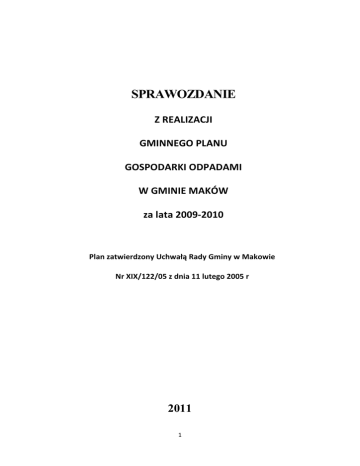 SPRAWOZDANIE Z REALIZACJI GMINNEGO PLANU GOSPODARKI ODPADAMI W GMINIE MAKÓW za lata 2009-2010 Plan zatwierdzony Uchwałą Rady Gminy w Makowie Nr XIX/122/05 z dnia 11 lutego 2005 r 2011 1 Na podstawie art. 14 ust. 12b pkt. 4 i ust. 13 pkt. 1 ustawy z dnia 27 kwietnia 2001t. o odpadach (Dz. U. z 2010r. Nr 185, poz. 1243 z późn. zm.) Wójt Gminy przedkłada Radzie Gminy i Zarządowi Powiatu sprawozdanie z realizacji Planu Gospodarki Odpadami dla Gminy Maków obejmujące okres dwóch lat kalendarzowych wg stanu na dzień 31 grudnia roku kończącego ten okres Plan gospodarki Odpadami w gminie Maków został przyjęty Uchwałą nr XIX/122/05 z dnia 11 lutego 2005r. Odpady Komunalne System zbiórki odpadów komunalnych na terenie gminy Maków prowadzony jest przez firmy, które uzyskały Decyzję w sprawie zezwolenia na prowadzenie działalności gospodarczej w zakresie odbierania odpadów komunalnych od właścicieli nieruchomości. Odpady komunalne niesegregowane są gromadzone na terenie nieruchomości w zamkniętych pojemnikach, wyłącznie do tego celu przeznaczonych, najczęściej o pojemności 120 l, w zabudowie jednorodzinnej, wywożone z częstotliwością określoną w harmonogramach ( co 4 tyg.) Tabela1. Ilość i rodzaje odpadów komunalnych zebranych z terenu gminy w latach 2009-2010 2009 Nazwa odpadu i kod Niesegregowane (zmieszane) odpady komunalne 20 03 01 Masa [Mg] 2010 Oznaczenie procesu unieszkodliwiania i odzysku Masa [Mg] Oznaczenie procesu unieszkodliwiania i odzysku 1165, 66 D 5 - składowanie na 1058,16 D 5 składowanie na składowiskach odpadów składowiskach odpadów niebezpiecznych lub ba niebezpiecznych lub ba składowiskach odpadów składowiskach odpadów innych niż niebezpieczne innych niż niebezpieczne Jak wynika z powyższego zestawienie nastąpił spadek ilości wytworzonych i zebranych odpadów komunalnych z terenu gminy. Selektywna zbiórka odpadów: Selektywna zbiórka odpadów prowadzona jest na terenie gminy w systemie „u źródła”, obejmuję wszystkich mieszkańców, którzy mają podpisane umowy na wywóz nieczystości. Wysegregowane odpady gromadzone są w przeźroczystych workach foliowych, dostarczanych na wymianę przez firmy obsługujące oraz dostępnych w Urzędzie Gminy. 2 Ilość i rodzaje zebranych selektywnie odpadów na terenie gminy przedstawia poniższa tabela. Tabela2. Ilość i rodzaje selektywnie zebranych odpadów z terenu gminy w latach 2009-2010. 2009 Nazwa i kod odpadu Opakowania z tworzyw sztucznych 15 01 02 Opakowania ze szkła 15 01 07 Masa [Mg] 5,978 Opakowania papieru i tektury 15 01 01 11,959 z 41,846 i podanych odzyskowi 2010 Oznaczenie procesu unieszkodliwiania i odzysku R 14 – Inne działania polegające na wykorzystaniu odpadów w całości lub części R 14 – Inne działania polegające na wykorzystaniu odpadów w całości lub części R 14 – Inne działania polegające na wykorzystaniu odpadów w całości lub części Masa [Mg] 5,935 43,845 11,870 Oznaczenie procesu unieszkodliwiania i odzysku R 14 – Inne działania polegające na wykorzystaniu odpadów w całości lub części R 14 – Inne działania polegające na wykorzystaniu odpadów w całości lub części R 14 – Inne działania polegające na wykorzystaniu odpadów w całości lub części Należy podkreślić, że w wielu gospodarstwach domowych prowadzone jest segregowanie odpadów opakowaniowych dla potrzeb własnych. Wydzielane odpady takie jak papier i tektura najczęściej spalane są w domowych kotłowniach, natomiast opakowania z metali sprzedawane we własnym zakresie. Na podstawie art. 7 ust. 6 ustawy z dnia 13 września 1996r. o utrzymaniu czystości i porządku w gminach, zezwolenie na odbiór odpadów komunalnych na terenie Gminy Maków, posiadają następujące firmy: 1. VEOLIA Usługi dla Środowiska S.A. , ul. Majowa 97/89, 97-200 Tomaszów Mazowiecki; zezwolenie do 22.06.2017r. 2. EKO-REGION Sp. z o.o., ul. Bawełniana 18, 97-400 Bełchatów . Instalacje do zbierania odpadów: Szkoła Podstawowa w Makowie - rodzaj kontener typu KP 7 Szkoła Podstawowa w Pszczonowie - rodzaj kontener typu MGB 1100 Szkoła Podstawowa w Słomkowie - rodzaj kontener typu MGB 1100 Szkoła Podstawowa w Świętem - rodzaj kontener typu MGB 1100 Szkoła Podstawowa w Woli Makowskiej - rodzaj kontener typu MGB 1100 Szkoła Podstawowa w Dąbrowicach - rodzaj kontener typu MGB 1100 Gimnazjum Św. Wojciecha w Makowie - rodzaj kontener typu KP 7 Wszystkie strażnice OSP - MGB 1100 3 Ośrodek Zdrowia w Makowie - MGB 1100 Odpady z sektora gospodarczego: Do największych zakładów na terenie gminy wytwarzających odpady z sektora gospodarczego należą: • Spółdzielnia Producentów Grzybów Jadalnych, Maków, ul. Akacjowa 4; • Fungis Sp. z o.o., Wola Makowska 124a; • Lasy Państwowe, Maków Zwierzyniec; • Piekarnia Maków; Spółdzielnia Producentów Grzybów Jadalnych prowadzi działalność w zakresie skupu i sprzedaży hurtowej grzybów jadalnych. Wytwarza następujące odpady: 16 02 13 zużyte urządzenia zawierające niebezpieczne elementy; 16 06 01 zużyte baterie i akumulatory ołowiowe; 16 06 02 baterie i akumulatory niklowo kadmowe; 15 01 01 opakowania z papieru i tektury; 15 01 02 opakowania z tworzyw sztucznych ; 15 01 03 opakowania z drewna; 17 04 07 mieszaniny metali; 16 02 14 zużyte urządzenia; 08 03 18 odpadowy toner drukarski; Fungis Sp. z o.o. w Woli Makowskiej prowadzi produkcję i sprzedaż podłoża do uprawy pieczarek, wytwarza: Przepracowane oleje: 13 01 13 inne oleje hydrauliczne; 13 02 08 inne oleje silnikowe, przekładniowe, smarowane; 16 06 01 zużyte akumulatory; 16 02 13 zużyte świetlówki; 16 01 07 zużyte filtry olejowe; 15 02 02 zużyte zaolejone czyściwo; 15 01 10 opakowania zawierające pozostałości substancji niebezpiecznych lub nimi zanieczyszczone; 18 01 03 inne odpady, które zawierają żywe drobnoustroje chorobotwórcze lub ich toksyny zdolne do przeniesienia materiału genetycznego, o którym wiadom
