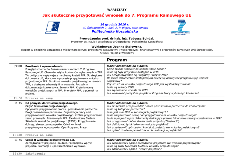 WARSZTATY Jak skutecznie przygotować wniosek do 7. Programu Ramowego UE 16 grudnia 2010 r. ul. Śniadeckich 2, blok A, V piętro, sala senatu Politechnika Koszalińska Prowadzenie: prof. dr hab. inż. Tadeusz Bohdal, Prorektor ds. Nauki i Współpracy z Gospodarką, Politechnika Koszalińska Wykładowca: Joanna Stalewska, ekspert w dziedzinie zarządzania międzynarodowymi projektami badawczymi i wspierającymi, finansowanymi z programów ramowych Unii Europejskiej, AMBER Project z Warszawy Program 09:00 Powitanie i wprowadzenie. Przegląd schematów finansowania w ramach 7. Programu Ramowego UE. Charakterystyka konkursów ogłaszanych w 7PR. Tło polityczne wypływające na obecny kształt 7PR. Strategiczne dokumenty UE, kluczowe w procesie przygotowania wniosku projektowego 7PR. Struktura wniosku projektowego w ramach 7PR, a dostępne schematy finansowania. Potrzebna dokumentacja konkursowa. Sekrety 7PR. Kryteria oceny wniosków projektowych w 7PR. Priorytety 7PR, a pomysł na projekt. 11:00 Przerwa na kawę 11:15 13:30 13:45 15:30 Od pomysłu do wniosku projektowego. Część B wniosku projektowego. Optymalne przygotowanie procesu poszukiwania partnerów. Drogi poszukiwania partnerów. Organizacja pracy nad przygotowaniem wniosku projektowego. Krótkie przypomnienie zasad prawnych i finansowych 7PR. Elektroniczny System Składania Wniosków projektowych (EPSS). Przygotowanie dobrego streszczenia projektu. Cele i kontekst przygotowywanego projektu. Opis Programu Pracy. Moduł odpowiada na pytania: Gdzie szukać środków na finansowanie badań? Jakie są typy projektów dostępne w 7PR? Jak przygotowywane są Programy Pracy w 7PR? Do jakich dokumentów strategicznych należy się odwoływać przygotowując wniosek projektowy? Czy struktura wniosku projektowego 7PR jest wystandaryzowana? Jakie są sekrety 7PR? Jak są oceniane wnioski do 7PR? Jak wpasować pomysł na projekt w Program Pracy wybranego konkursu? Moduł odpowiada na pytania: Jak skutecznie przeprowadzić proces poszukiwania partnerów do konsorcjum? Jakie są kategorie partnerów? Jaka jest role MŚP w konsorcjach projektowych? Jakie zorganizować pracę nad przygotowaniem wniosku projektowego? Jakie są najważniejsze dokumenty definiujące prawne i finansowe zasady uczestnictwa w 7PR? Jak przygotować dobre streszczenie projektu (“Abstract”). Jak definiować tytuł i akronim wniosku projektu? Jak przedstawić opis celów i kontekst projektu we wniosku projektowym? Jak opisać działania przewidziane do realizacji w projekcie? Przerwa na kawę Część B wniosku projektowego c.d. Zarządzanie w projekcie i budżet. Potencjalny wpływ projektu. Promocja i upowszechnianie wyników. Zakończenie Moduł odpowiada na pytania: Jak zaplanować i opisać zarządzanie projektem we wniosku projektowym? Jakie są kroki tworzenia budżetu wniosku projektowego? Jak zdefiniować i opisać ”wpływ projektu”?