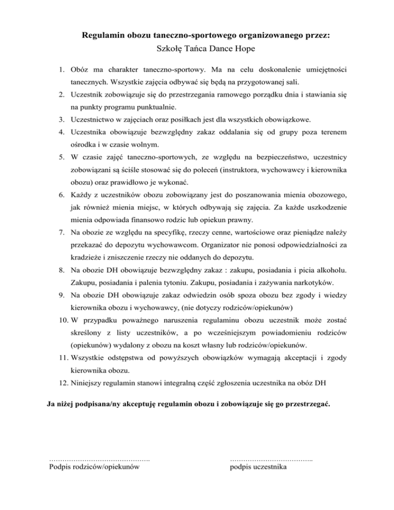 Regulamin obozu taneczno-sportowego organizowanego przez: Szkołę Tańca Dance Hope 1. Obóz ma charakter taneczno-sportowy. Ma na celu doskonalenie umiejętności tanecznych. Wszystkie zajęcia odbywać się będą na przygotowanej sali. 2. Uczestnik zobowiązuje się do przestrzegania ramowego porządku dnia i stawiania się na punkty programu punktualnie. 3. Uczestnictwo w zajęciach oraz posiłkach jest dla wszystkich obowiązkowe. 4. Uczestnika obowiązuje bezwzględny zakaz oddalania się od grupy poza terenem ośrodka i w czasie wolnym. 5. W czasie zajęć taneczno-sportowych, ze względu na bezpieczeństwo, uczestnicy zobowiązani są ściśle stosować się do poleceń (instruktora, wychowawcy i kierownika obozu) oraz prawidłowo je wykonać. 6. Każdy z uczestników obozu zobowiązany jest do poszanowania mienia obozowego, jak również mienia miejsc, w których odbywają się zajęcia. Za każde uszkodzenie mienia odpowiada finansowo rodzic lub opiekun prawny. 7. Na obozie ze względu na specyfikę, rzeczy cenne, wartościowe oraz pieniądze należy przekazać do depozytu wychowawcom. Organizator nie ponosi odpowiedzialności za kradzieże i zniszczenie rzeczy nie oddanych do depozytu. 8. Na obozie DH obowiązuje bezwzględny zakaz : zakupu, posiadania i picia alkoholu. Zakupu, posiadania i palenia tytoniu. Zakupu, posiadania i zażywania narkotyków. 9. Na obozie DH obowiązuje zakaz odwiedzin osób spoza obozu bez zgody i wiedzy kierownika obozu i wychowawcy, (nie dotyczy rodziców/opiekunów) 10. W przypadku poważnego naruszenia regulaminu obozu uczestnik może zostać skreślony z listy uczestników, a po wcześniejszym powiadomieniu rodziców (opiekunów) wydalony z obozu na koszt własny lub rodziców/opiekunów. 11. Wszystkie odstępstwa od powyższych obowiązków wymagają akceptacji i zgody kierownika obozu. 12. Niniejszy regulamin stanowi integralną część zgłoszenia uczestnika na obóz DH Ja niżej podpisana/ny akceptuję regulamin obozu i zobowiązuje się go przestrzegać. ………………………………………. ……………………………….. Podpis rodziców/opiekunów podpis uczestnika KARTA KWALIFIKACYJNA UCZESTNIKA KOLONIE I OBÓZ MŁODZIEŻOWY WE WŁOSZECH 28.07. – 9.08 Marina Romea koło Rawenny, Turnus III I. WNIOSEK RODZICÓW / OPIEKUNÓW O SKIEROWANIE DZIECKA NA OBÓZ imię i nazwisko uczestnika .................................................................................................. 2. data i miejsce urodzenia ...................................................................................................... 3. nr pesel .................................................. 4. nr dok. tożsamości ........................................... 5. adres zamieszkania ............................................................................................................. 6. tel. kontaktowe do rodziców/opiekunów uczestnika obozu .............................................. 7. Wyrażam zgodę na wyjazd mojego dziecka na wyżej wymieniony obóz i jego udział we wszystkich zajęciach ruchowych i programowych. 8. Stwierdzam że podałam/em w niniejszej karcie obozowej wszystkie znane mi informacje o dziecku, które mogą pomóc w zapewnieniu mu właściwej opieki 9. Przyjmuję do wiadomości i akceptuję że: 1. uczestników obozu obowiązuje bezwzględny zakaz posiadania, spożywania, i używania tytoniu, alkoholu, narkotyków i środków odurzających w przypadku naruszenia regulaminu może zostać podjęta decyzja o usunięciu uczestnika z obozu i odwiezienie do domu na koszt rodziców rodzice są odpowiedzialni materialnie za szkody wyrządzone przez dziecko 10. W przypadku podejrzenia uczestnika o spożywanie alkoholu lub narkotyków wyrażam zgodę na przeprowadzenie badania alkomatem lub testami narkotykowymi przez kadrę obozową. 11. Informuję że zapoznałam/em się i w pełni akceptuję: regulamin obozu zamieszczony na stronie 4 program obozu oraz warunki uczestnictwa ………………………… ………………………… ………………………… miejscowość i data podpis matki/opiekuna podpis ojca/opiekuna UWAGA: WYPEŁNIONĄ KARTĘ KWALIFIKACYJNĄ UCZESTNIKA PROSIMY ODDAĆ WYCHOWAWCY NA ZBIÓRCE W DNIU WYJAZDU LUB NA ZEBRANIU INFORMACYJUNUM/ORGANIZACYJNYM Szkoła tańca Dance Hope ul. Abramowskiego 20 m 37, 90-355 Łódź Tel. 507454257 [email protected] www.dancehope.pl II. INFORMACJE ROZICÓW/OPIEKUNÓW O DZIECKU I JEGO ZDROWIU: Choroby przewlekle lub inne: astma, padaczka, choroby reumatyczne, choroby serca, nerek inne ....................................................................................................................... ........................................................................................................................................ ........................................................................................................................................ Dolegliwości lub objawy które występują ostatnio u dziecka: omdlenia, drgawki z utratą przytomności, częste bóle głowy, zaburzenia równowagi, częste wymioty, krwotoki z nosa, ataki duszności, bezsenność, przewlekły kaszel, szybkie męczenie się, częste bóle brzucha, bóle stawów, lęki nocne, moczenie nocne inne: ................................................................................................................................ ........................................................................................................................................ ........................................................................................................................................ Dziecko jest uczulone lub nie może stosować leków (podać nazwę leku, pokarmu itp): .................................................................................................................................. Dziecko przyjmuje stale leki (podać lek i dawkę)