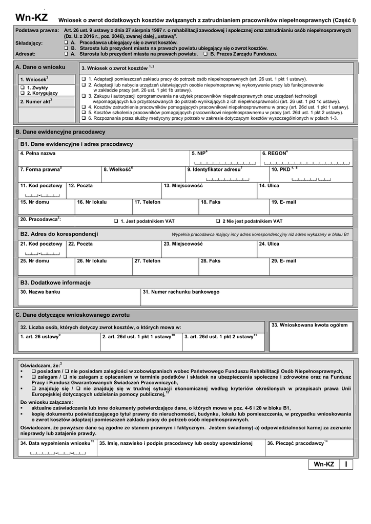 0 Wn-KZ Wniosek o zwrot dodatkowych kosztów związanych z zatrudnianiem pracowników niepełnosprawnych (Część I) Podstawa prawna: Art. 26 ust. 9 ustawy z dnia 27 sierpnia 1997 r. o rehabilitacji zawodowej i społecznej oraz zatrudnianiu osób niepełnosprawnych (Dz. U. z 2016 r., poz. 2046), zwanej dalej „ustawą”. A. Pracodawca ubiegający się o zwrot kosztów. B. Starosta lub prezydent miasta na prawach powiatu ubiegający się o zwrot kosztów. A. Starosta lub prezydent miasta na prawach powiatu. B. Prezes Zarządu Funduszu. Składający: Adresat: A. Dane o wniosku 1. Wniosek 2 1, 2 1. Adaptacji pomieszczeń zakładu pracy do potrzeb osób niepełnosprawnych (art. 26 ust. 1 pkt 1 ustawy). 2. Adaptacji lub nabycia urządzeń ułatwiających osobie niepełnosprawnej wykonywanie pracy lub funkcjonowanie 1. Zwykły 2. Korygujący 2. Numer akt 3. Wniosek o zwrot kosztów w zakładzie pracy (art. 26 ust. 1 pkt 1b ustawy). 3. Zakupu i autoryzacji oprogramowania na użytek pracowników niepełnosprawnych oraz urządzeń technologii 3 wspomagających lub przystosowanych do potrzeb wynikających z ich niepełnosprawności (art. 26 ust. 1 pkt 1c ustawy). 4. Kosztów zatrudnienia pracowników pomagających pracownikowi niepełnosprawnemu w pracy (art. 26d ust. 1 pkt 1 ustawy). 5. Kosztów szkolenia pracowników pomagających pracownikowi niepełnosprawnemu w pracy (art. 26d ust. 1 pkt 2 ustawy). 6. Rozpoznania przez służby medycyny pracy potrzeb w zakresie dotyczącym kosztów wyszczególnionych w polach 1-3. B. Dane ewidencyjne pracodawcy B1. Dane ewidencyjne i adres pracodawcy 4. Pełna nazwa 5. NIP 4 4 6. REGON └──┴──┴──┴──┴──┴──┴──┴──┴──┴──┘ 7. Forma prawna 5 8. Wielkość 6 9. Identyfikator adresu 7 └──┴──┴──┴──┴──┴──┴──┴──┴──┴──┴──┴──┴──┴──┘ 10. PKD └──┴──┴──┴──┴──┴──┴──┘ 11. Kod pocztowy 12. Poczta 4, 8 └──┴──┴──┴──┘└──┴──┘ 13. Miejscowość 14. Ulica └──┴──┘-└──┴──┴──┘ 15. Nr domu 16. Nr lokalu 2 20. Pracodawca : 17. Telefon 18. Faks 1. Jest podatnikiem VAT B2. Adres do korespondencji 21. Kod pocztowy 19. E- mail 2 Nie jest podatnikiem VAT Wypełnia pracodawca mający inny adres korespondencyjny niż adres wykazany w bloku B1 22. Poczta 23. Miejscowość 24. Ulica └──┴──┘-└──┴──┴──┘ 25. Nr domu 26. Nr lokalu 27. Telefon 28. Faks 29. E- mail B3. Dodatkowe informacje 30. Nazwa banku 31. Numer rachunku bankowego C. Dane dotyczące wnioskowanego zwrotu 33. Wnioskowana kwota ogółem 32. Liczba osób, których dotyczy zwrot kosztów, o których mowa w: 1. art. 26 ustawy 9 2. art. 26d ust. 1 pkt 1 ustawy 10 3. art. 26d ust. 1 pkt 2 ustawy 11 2 Oświadczam, że: posiadam / nie posiadam zaległości w zobowiązaniach wobec Państwowego Funduszu Rehabilitacji Osób Niepełnosprawnych, zalegam / nie zalegam z opłacaniem w terminie podatków i składek na ubezpieczenia społeczne i zdrowotne oraz na Fundusz Pracy i Fundusz Gwarantowanych Świadczeń Pracowniczych, znajduję się / nie znajduję się w trudnej sytuacji ekonomicznej według kryteriów określonych w przepisach prawa Unii 12 Europejskiej dotyczących udzielania pomocy publicznej, Do wniosku załączam: aktualne zaświadczenia lub inne dokumenty potwierdzające dane, o których mowa w poz. 4-6 i 20 w bloku B1, kopię dokumentu poświadczającego tytuł prawny do nieruchomości, budynku, lokalu lub pomieszczenia, w przypadku wnioskowania o zwrot kosztów adaptacji pomieszczeń zakładu pracy do potrzeb osób niepełnosprawnych. Oświadczam, że powyższe dane są zgodne ze stanem prawnym i faktycznym. Jestem świadomy(-a) odpowiedzialności karnej za zeznanie nieprawdy lub zatajenie prawdy. 34. Data wypełnienia wniosku 13 35. Imię, nazwisko i podpis pracodawcy lub osoby upoważnionej 36. Pieczęć pracodawcy 14 └──┴──┴──┴──┘-└──┴──┘-└──┴──┘ Wn-KZ I Objaśnienia do I części formularza Wn-KZ 1 W przypadku zaznaczenia pola 1, 2, 3 lub 6 w poz. 3 w Części I należy dodatkowo wypełnić Część II wniosku. W przypadku zaznaczenia pola 4 w poz. 3 należy dodatkowo wypełnić Część III wniosku. W przypadku zaznaczenia pola 5 w poz. 3 należy dodatkowo wypełnić Część IV wniosku. 2 W odpowiednim polu wstawić X. 3 Wypełnia adresat (odpowiednio: starosta lub Prezes Zarządu Funduszu). 4 Wpisać numer, o ile jego nadanie wynika z przepisów prawa. 5 Należy podać kod odpowiadający formie prawnej pracodawcy: 1A – przedsiębiorstwo państwowe, 1B – jednoosobowa spółka Skarbu Państwa, 1C – jednoosobowa spółka jednostki samorządu terytorialnego, w rozumieniu przepisów o gospodarce komunalnej, 1D – spółka akcyjna albo spółka z ograniczoną odpowiedzialnością, w stosunku do których Skarb Państwa, jednostka samorządu terytorialnego, przedsiębiorstwo państwowe lub jednoosobowa spółka Skarbu Państwa są podmiotami, które posiadają uprawnienia takie jak przedsiębiorcy dominujący w rozumieniu przepisów o ochronie konkurencji i konsumentów, 2 – pracodawca nienależący do kategorii określonych kodem od 1A do 1D. 6 Należy podać odpowiedni kod: 0 – mikroprzedsiębiorca, kod 1 – przedsiębiorca mały, kod 2 – przedsiębiorca średni, kod 3 – inny przedsiębiorca. Wpisując kod, należy brać pod uwagę dane na ostatni dzień roku poprzedzającego rok sprawozdawczy. 7 Należy podać pełne, siedmiocyfrowe oznaczenie gminy, na obszarze której pracodawca ma siedzibę lub miejsce zamieszkania - zgodnie z rozporządzeniem Rady Ministrów z dnia 15 grudnia 1998 r. w sprawie szczegółowych zasad prowadzenia, stosowania i udostępniania krajowego rejestru urzędowego podziału terytorialnego kraju oraz związanych z tym obowiązków organów ad