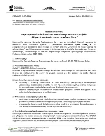PRR BARR_7.3/1/2016 Ustrzyki Dolne, 19.09.2016 r. Dot. Wniosek o dofinansowanie projektu: „Wsparcie na starcie szansą na własną firmę ” Nr wniosku: WND-RPPK.07.03.00-18-0162/15 Rozeznanie rynku na przeprowadzenie doradztwa zawodowego w ramach projektu „Wsparcie na starcie szansą na własną firmę” Bieszczadzka Agencja Rozwoju Regionalnego Sp. z o.o. w Ustrzykach Dolnych zaprasza do składania ofert cenowych zgodnie z „Procedurą rozeznania rynku BARR_7.3” na przeprowadzenie doradztwa zawodowego w ramach projektu „Wsparcie na starcie szansą na własną firmę” współfinansowanego przez Unię Europejską ze środków Europejskiego Funduszu Społecznego, realizowanego w ramach Regionalnego Programu Operacyjnego Województwa Podkarpackiego na lata 2014-2020. 1. Zamawiający: Bieszczadzka Agencja Rozwoju Regionalnego Sp. z o.o., ul. Rynek 17, 38-700 Ustrzyki Dolne 2. Przedmiot rozeznania rynku: Kod CPV: 85312320-8 Usługi doradztwa Osobiste przeprowadzenie indywidualnego doradztwa zawodowego dla maksymalnie 160 osób (5 grup po maksymalnie 32 osoby na grupę), średnio po 1,5 godziny na osobę (łącznie maksymalnie 240 godzin). Zakres doradztwa zawodowego obejmuje: rozmowę z doradcą zawodowym w celu weryfikacji predyspozycji Potencjalnych Uczestników/ Uczestniczek projektu (w tym np. osobowościowych, poziomu motywacji) do samodzielnego założenia i prowadzenia działalności gospodarczej; badanie Potencjalnych Uczestników/ Uczestniczek projektu testem badającym m.in. uzdolnienia i predyspozycje przedsiębiorcze. 3. Wykonawca zobowiązany będzie do: osobistego przeprowadzenia zajęć doradztwa zawodowego zgodnie z ustalonym harmonogramem w pomieszczeniach udostępnionych przez Zamawiającego w jego siedzibie; prowadzenia dokumentacji świadczonych usług zgodnie z wymogami Zamawiającego, w tym do wypełnienia Karty oceny doradczej i testu kompetencji. 4. Termin i miejsce realizacji przedmiotu rozeznania rynku: Realizacja przedmiotu rozeznania rynku będzie świadczona zgodnie z harmonogramem projektu pn. „Wsparcie na starcie szansą na własną firmę”, realizowanym w ramach Działania 7.3, RPOWP 2014-2020 w okresie: wrzesień 2016 r. - grudzień 2016 r., w siedzibie Zamawiającego. Godziny zajęć będą dostosowane do preferencji Potencjalnych Uczestników/Uczestniczek projektu. Bieszczadzka Agencja Rozwoju Regionalnego Sp. z o.o. ul. Rynek 17, 38-700 Ustrzyki Dolne tel. (013) 461-29-98, tel./fax (013) 461-21-47 e-mail: [email protected] 5. Wymagania wobec oferentów: Osoba prowadząca doradztwo zawodowe powinna posiadać odpowiednie kwalifikacje i doświadczenie jako doradca zawodowy, tj. minimum 2 (dwa) lata doświadczenia zawodowego w danej dziedzinie lub 300 godzin przeprowadzonego doradztwa. Wymagania wobec oferentów powinny być poświadczone na Załączniku nr 2 do Rozeznania rynku. 6. Forma, miejsce i termin składania ofert: Oferta powinna zostać sporządzona w języku polskim na Załączniku nr 1 do Rozeznania rynku. Składający ofertę wykonawca winien wycenić koszt brutto jednej godziny doradztwa zawodowego indywidualnego. Forma złożenia oferty: - osobiście w siedzibie Bieszczadzkiej Agencji Rozwoju Regionalnego Sp. z o.o. w Ustrzykach Dolnych, ul. Rynek 17, w dni robocze w godzinach od 7:30 do 15:30 (z zastrzeżeniem terminu upływu składania ofert) lub - za pośrednictwem poczty/kuriera na adres: Bieszczadzka Agencja Rozwoju Regionalnego Sp. z o.o., ul. Rynek 17, 38-700 Ustrzyki Dolne, lub - pocztą elektroniczną (skan podpisanych dokumentów) na adres: [email protected] Ofertę należy złożyć do dnia 27.09.2016 r. (wtorek) do godz. 12.30. O terminowości złożenia oferty decyduje data i godzina wpływu oferty do siedziby Zamawiającego (dotyczy wszystkich form złożenia oferty). Oferty składane osobiście bądź za pośrednictwem poczty/kuriera powinny znajdować się w zamkniętych kopertach z dopiskiem: Procedura rozeznania rynku na przeprowadzenie indywidualnego doradztwa zawodowego, w projekcie: „Wsparcie na starcie szansą na własny biznes”. Oferty składane pocztą elektroniczną w tytule wiadomości powinny zawierać zapis: Procedura rozeznania rynku na przeprowadzenie indywidualnego doradztwa zawodowego, w projekcie: „Wsparcie na starcie szansą na własny biznes”. 7. Kryteria wyboru oferty: Głównym kryterium (100%) oceny ofert będzie cena brutto jednej godziny doradztwa zawodowego. Cena powinna obejmować wszystkie koszty realizacji usługi i być przedstawiona w polskich złotych z dokładnością do 2 (dwóch) miejsc po przecinku. Liczba możliwych do uzyskania punktów = 100. Oferty, które nie będą podlegać odrzuceniu oceniane będą wg wzoru: (Cmin / C of. licz.) x 100 = liczba uzyskanych punktów, gdzie: C min - najniższa całkowita cena brutto wykonania zamówienia spośród wszystkich ocenianych ofert. C of. licz. - zaoferowana całkowita cena brutto wykonania zamówienia w ofercie ocenianej. Końcowy wyniki powyższego działania zostanie zaokrąglony do 2 miejsc po przecinku. Liczba punktów, o których mowa powyżej, stanowić będzie końcową ocenę oferty. O wyborze najkorzystniejszej oferty Zamawiający zawiadomi Oferentów drogą mailową. Bieszczadzka Agencja Rozwoju Regionalnego Sp. z o.o. ul. Rynek 17, 38-700 Ustrzyki Dolne tel. (013) 461-29-98, tel./fax (013) 461-21-47 e-mail: [email protected] 8. Inne Składając ofertę Oferent potwierdza swoją gotowość do rozpoczęcia realizacji przedmiotu rozeznania rynku od dnia następującego po upływie terminu składania ofert, tj. od 28.09.2016 r. Oferty złożone po terminie nie będą rozpatrywane. Niniejsza oferta nie stanowi oferty w myśl art. 66 Kodeksu Cywilnego, jak również nie jest ogłoszeniem w rozumieniu Ustawy Prawo zamówień publicznych. Niniejsze rozeznanie rynku nie zobowiązuje Zamawiającego do żadnego określonego działania. Zamawiający zastrzega sobie prawo do odpowiedzi tylko na wybraną/wybrane oferty. Zama