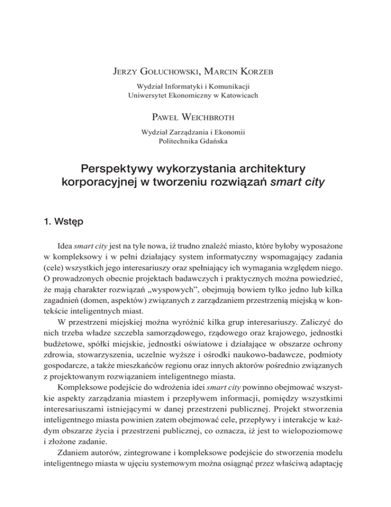 Jerzy Gołuchowski, Marcin Korzeb Wydział Informatyki i Komunikacji Uniwersytet Ekonomiczny w Katowicach Paweł Weichbroth Wydział Zarządzania i Ekonomii Politechnika Gdańska Perspektywy wykorzystania architektury korporacyjnej w tworzeniu rozwiązań smart city 1. Wstęp Idea smart city jest na tyle nowa, iż trudno znaleźć miasto, które byłoby wyposażone w kompleksowy i w pełni działający system informatyczny wspomagający zadania (cele) wszystkich jego interesariuszy oraz spełniający ich wymagania względem niego. O prowadzonych obecnie projektach badawczych i praktycznych można powiedzieć, że mają charakter rozwiązań „wyspowych”, obejmują bowiem tylko jedno lub kilka zagadnień (domen, aspektów) związanych z zarządzaniem przestrzenią miejską w kontekście inteligentnych miast. W przestrzeni miejskiej można wyróżnić kilka grup interesariuszy. Zaliczyć do nich trzeba władze szczebla samorządowego, rządowego oraz krajowego, jednostki budżetowe, spółki miejskie, jednostki oświatowe i działające w obszarze ochrony zdrowia, stowarzyszenia, uczelnie wyższe i ośrodki naukowo-badawcze, podmioty gospodarcze, a także mieszkańców regionu oraz innych aktorów pośrednio związanych z projektowanym rozwiązaniem inteligentnego miasta. Kompleksowe podejście do wdrożenia idei smart city powinno obejmować wszystkie aspekty zarządzania miastem i przepływem informacji, pomiędzy wszystkimi interesariuszami istniejącymi w danej przestrzeni publicznej. Projekt stworzenia inteligentnego miasta powinien zatem obejmować cele, przepływy i interakcje w każdym obszarze życia i przestrzeni publicznej, co oznacza, iż jest to wielopoziomowe i złożone zadanie. Zdaniem autorów, zintegrowane i kompleksowe podejście do stworzenia modelu inteligentnego miasta w ujęciu systemowym można osiągnąć przez właściwą adaptację 86 Jerzy Gołuchowski, Marcin Korzeb, Paweł Weichbroth i wdrożenie architektury korporacyjnej (AK). Architektura ta pozwala, jak pokazują inne doświadczenia, na ujęcie złożoności i wielowątkowości procesu przygotowania i realizacji tego typu przedsięwzięć. Koncepcja AK, zarówno na świecie, jak i w Polsce, zaczyna być stosowana na szeroką skalę. Obejmuje ona zbiór celów i właściwości danej organizacji, formalny opis struktury i funkcji poszczególnych komponentów informacyjnych i procesowych oraz technologicznych, a także wzajemnych powiązań między tymi komponentami. Jednocześnie architekturę korporacyjną stosuje się nie tylko do opisu powyższych elementów w odniesieniu do przedsiębiorstwa lub organizacji, ale także coraz częściej do jednostek administracji publicznej. Należy stwierdzić, iż w chwili obecnej brak jest usystematyzowanego, wykorzystującego AK podejścia do kompleksowych wdrożeń idei smart city, a tym samym do transformacji przestrzeni publicznej z przestrzeni „reagującej” post factum na przestrzeń „reagującą” ex ante. Autorom nie są znane koncepcje wykorzystania idei AK do stworzenia kompleksowego rozwiązania smart city. Celem artykułu jest zidentyfikowanie przesłanek opracowania referencyjnego modelu smart city z wykorzystaniem architektury korporacyjnej jako skutecznego narzędzia transformacji miasta w inteligentne miasto. Wymaga to odniesienia idei korporacji do miasta jako systemu wzajemnych powiązań i zależności pomiędzy jego wszystkimi aktorami i zasobami. 2. Idea smart city W literaturze naukowej i w praktyce zarządzania miastem istnieją rozbieżności co do tego, jak należy rozumieć termin „inteligentne miasto”. Czy jest to tylko synonim słowa „rozwój przestrzeni publicznej”, czy może jednak coś więcej? Niektórzy twierdzą, iż jest to chwytliwy slogan marketingowy, który umożliwia producentom sprzedaż swoich rozwiązań. Inni są przekonani, że to kierunek transformacji przestrzeni publicznej ku celowemu i faktycznemu postępowi cywilizacyjnemu. Do chwili obecnej powstało wiele definicji pojęcia inteligentnego miasta (ang. smart city). Należy zauważyć, iż niektórzy autorzy, formułując jego definicję, kierują się kontekstem przeprowadzanego właśnie badania. W zależności od sytuacji, w jakiej jest przytaczane określenie smart city, jest ono identyfikowane bądź to z szeroko rozumianym obszarem społeczno-gospodarczym, bądź też z obszarem techniczno-informatycznym. Warto zauważyć, iż ten drugi obszar zwykle jest narzędziem realizacji pierwszego. Co więcej, pojęcie inteligentnego miasta jest formułowane zarówno przez przedstawicieli świata nauki czy organy władzy publicznej, jak i przez samych przedsiębiorców, a jego Perspektywy wykorzystania architektury korporacyjnej w tworzeniu rozwiązań smart city 87 definicja zależy od potrzeb danego podmiotu. Tym samym, prowadzenie dalszych rozważań nad perspektywą wykorzystania architektury korporacyjnej przy opracowaniu rozwiązań smart city wymaga w pierwszej kolejności wyjaśnienia tego, jak jest to określenie rozumiane przez autorów. Należy stwierdzić, że głównym celem/założeniem leżącym u podstaw wdrożenia idei smart city jest dążenie do poprawy życia społecznego przez integrację i harmonijną synchronizację ludzi i technologii z otaczającym ich środowiskiem. Inteligentne miasto – z jednej strony – to przestrzeń publiczna absorbująca w sobie wszystkie elementy związane z rozwojem konkretnego produktu i usług mających na celu polepszenie i zautomatyzowanie codziennych procesów, w zakresie zarówno opomiarowania mediów takich jak woda, prąd, ciepło czy gaz, jak i inteligentnego zarządzania ruchem miejskim, szybkiego reagowania na sytuacje kryzysowe czy odnawialnych źródeł energii i wielu innych. Z drugiej strony, obejmuje zależności społeczno-gospodarcze, ekonomiczne, techniczno-technologiczne oraz geośrodowiskowe, które oddziaływają na kształtowanie się danej aglomeracji. Spostrzega to A. Sobczak i 