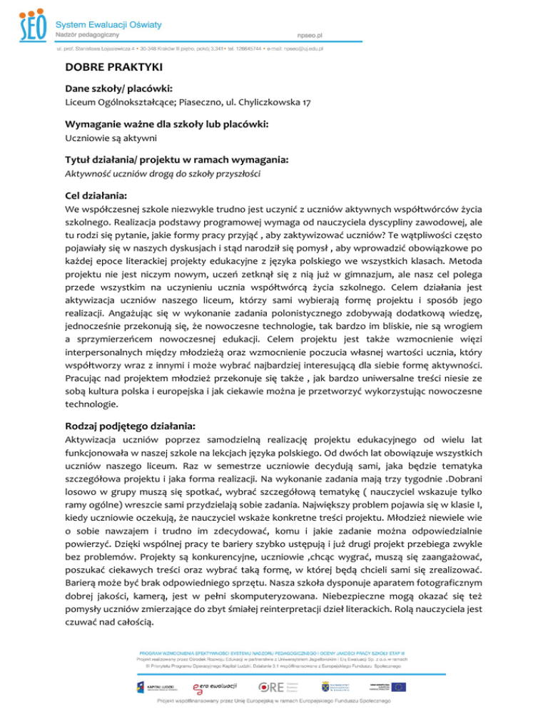DOBRE PRAKTYKI Dane szkoły/ placówki: Liceum Ogólnokształcące; Piaseczno, ul. Chyliczkowska 17 Wymaganie ważne dla szkoły lub placówki: Uczniowie są aktywni Tytuł działania/ projektu w ramach wymagania: Aktywność uczniów drogą do szkoły przyszłości Cel działania: We współczesnej szkole niezwykle trudno jest uczynić z uczniów aktywnych współtwórców życia szkolnego. Realizacja podstawy programowej wymaga od nauczyciela dyscypliny zawodowej, ale tu rodzi się pytanie, jakie formy pracy przyjąć , aby zaktywizować uczniów? Te wątpliwości często pojawiały się w naszych dyskusjach i stąd narodził się pomysł , aby wprowadzić obowiązkowe po każdej epoce literackiej projekty edukacyjne z języka polskiego we wszystkich klasach. Metoda projektu nie jest niczym nowym, uczeń zetknął się z nią już w gimnazjum, ale nasz cel polega przede wszystkim na uczynieniu ucznia współtwórcą życia szkolnego. Celem działania jest aktywizacja uczniów naszego liceum, którzy sami wybierają formę projektu i sposób jego realizacji. Angażując się w wykonanie zadania polonistycznego zdobywają dodatkową wiedzę, jednocześnie przekonują się, że nowoczesne technologie, tak bardzo im bliskie, nie są wrogiem a sprzymierzeńcem nowoczesnej edukacji. Celem projektu jest także wzmocnienie więzi interpersonalnych między młodzieżą oraz wzmocnienie poczucia własnej wartości ucznia, który współtworzy wraz z innymi i może wybrać najbardziej interesującą dla siebie formę aktywności. Pracując nad projektem młodzież przekonuje się także , jak bardzo uniwersalne treści niesie ze sobą kultura polska i europejska i jak ciekawie można je przetworzyć wykorzystując nowoczesne technologie. Rodzaj podjętego działania: Aktywizacja uczniów poprzez samodzielną realizację projektu edukacyjnego od wielu lat funkcjonowała w naszej szkole na lekcjach języka polskiego. Od dwóch lat obowiązuje wszystkich uczniów naszego liceum. Raz w semestrze uczniowie decydują sami, jaka będzie tematyka szczegółowa projektu i jaka forma realizacji. Na wykonanie zadania mają trzy tygodnie .Dobrani losowo w grupy muszą się spotkać, wybrać szczegółową tematykę ( nauczyciel wskazuje tylko ramy ogólne) wreszcie sami przydzielają sobie zadania. Największy problem pojawia się w klasie I, kiedy uczniowie oczekują, że nauczyciel wskaże konkretne treści projektu. Młodzież niewiele wie o sobie nawzajem i trudno im zdecydować, komu i jakie zadanie można odpowiedzialnie powierzyć. Dzięki wspólnej pracy te bariery szybko ustępują i już drugi projekt przebiega zwykle bez problemów. Projekty są konkurencyjne, uczniowie ,chcąc wygrać, muszą się zaangażować, poszukać ciekawych treści oraz wybrać taką formę, w której będą chcieli sami się zrealizować. Barierą może być brak odpowiedniego sprzętu. Nasza szkoła dysponuje aparatem fotograficznym dobrej jakości, kamerą, jest w pełni skomputeryzowana. Niebezpieczne mogą okazać się też pomysły uczniów zmierzające do zbyt śmiałej reinterpretacji dzieł literackich. Rolą nauczyciela jest czuwać nad całością. Efekty działania: Wyjątkowość tego działania polega na tym, że to uczniowie sami stają się aktywnymi współtwórcami nowoczesnej szkoły. Zależy im na tym, żeby zdobyć jak najwięcej informacji w trakcie lekcji, ponieważ może im się to przydać do projektu. Efekty są zaskakujące, ciekawe i inspirujące. Powstają miniatury teatralne, pantomimy, teatrzyki kukiełkowe czy wreszcie filmy będące nie tylko adaptacjami czy też uwspółcześnionymi wersjami wybranych scen literackich, ale także zabawnymi remaikami. Rodzice na zebraniach mają możliwość obejrzenia dokonań swoich dzieci, najciekawsze prace zamieszczane są na szkolnej stronie www, biorą też udział w konkursach zewnętrznych i zdobywają w nich nagrody. Rady i przestrogi: Przede wszystkim do właściwej realizacji potrzebni są przekonani do takiej formy pracy nauczyciele. Poza tym dobrze, jeśli szkoła dysponuje zapleczem w sprzęt multimedialny, kamerę, aparat fotograficzny. Środki na doposażenie zdobywamy od sponsorów, jednostek, z którymi współpracujemy np. Polski Instytut Filmowy. Sojusznikami są przede wszystkim uczniowie bardzo zainteresowani taką formą pracy. Nauczyciel musi czuwać nad czasem prezentacji, która nie może trwać dłużej niż 8-10 minut i nad sposobem przetwarzania materiału literackiego. Zdarza się bowiem, że uczniowie, zachęceni otwartością szkoły na nowoczesne metody pracy, dają się ponieść fantazji i ich działania sięgają zbyt daleko. Sukces to zaangażowanie uczniów, ich kreatywność, to, że chcą spędzać w szkole czas po lekcjach pracując nad szkolnym projektem. Streszczenie: Uczynienie z uczniów aktywnych współtwórców życia szkolnego to wyzwanie współczesnej edukacji. Realizacja podstawy programowej wymaga od nauczyciela dyscypliny zawodowej, ale rodzi się pytanie, jak zaktywizować uczniów? Metoda projektu nie jest niczym nowym, uczeń zetknął się z nią już w gimnazjum, ale nasz pomysł polega przede wszystkim na uczynieniu ucznia współtwórcą życia szkolnego. Celem działania jest aktywizacja uczniów liceum, którzy sami wybierają formę projektu i sposób jego realizacji. Angażując się w wykonanie zadania polonistycznego, zdobywają dodatkową wiedzę, jednocześnie przekonują się, że nowoczesne technologie, tak bardzo im bliskie, nie są wrogiem a sprzymierzeńcem współczesnej edukacji. Celem projektu jest także wzmocnienie więzi interpersonalnych między uczestnikami i rozbudzenie poczucia własnej wartości ucznia, który współtworzy wraz z innymi i może wybrać najbardziej interesującą dla siebie formę aktywności. Pracując nad projektem młodzież przekonuje się także , jak bardzo uniwersalne treści niesie ze sobą kultura polska i europejska i jak ciekawie można je prze