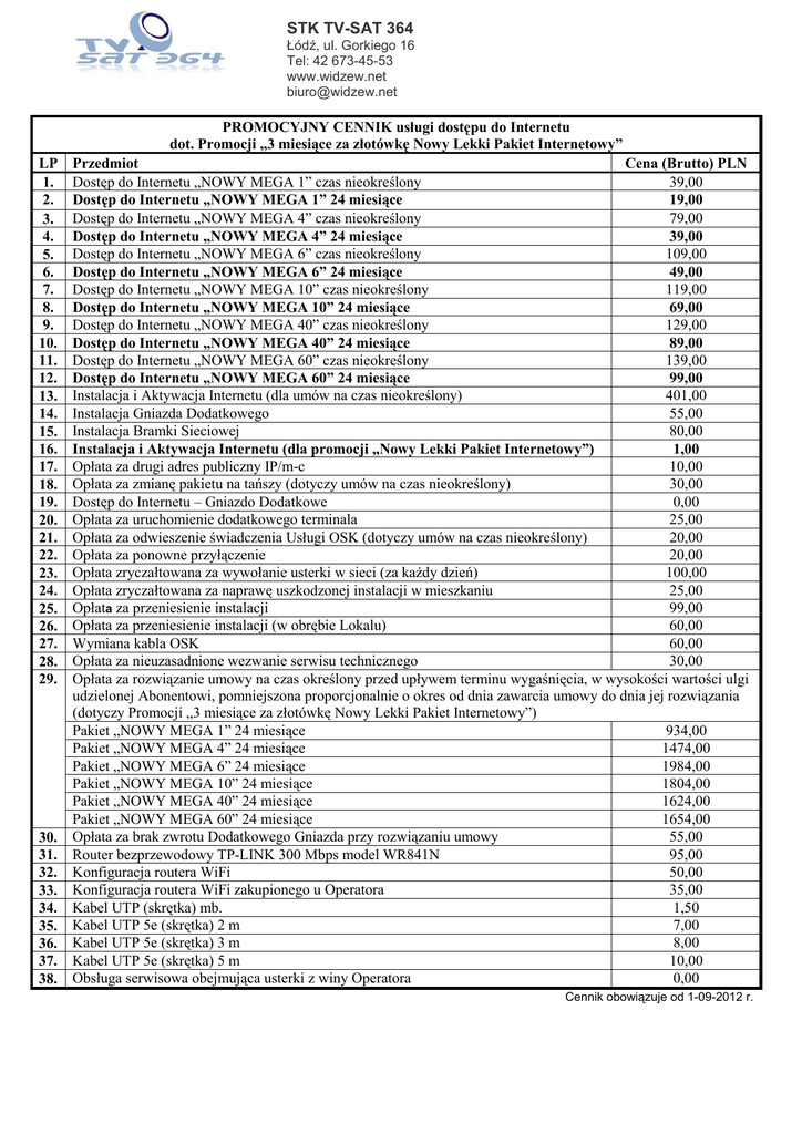 STK TV-SAT 364 Łódź, ul. Gorkiego 16 Tel: 42 673-45-53 www.widzew.net [email protected] PROMOCYJNY CENNIK usługi dostępu do Internetu dot. Promocji „3 miesiące za złotówkę Nowy Lekki Pakiet Internetowy” LP 1. 2. 3. 4. 5. 6. 7. 8. 9. 10. 11. 12. 13. 14. 15. 16. 17. 18. 19. 20. 21. 22. 23. 24. 25. 26. 27. 28. 29. 30. 31. 32. 33. 34. 35. 36. 37. 38. Przedmiot Cena (Brutto) PLN Dostęp do Internetu „NOWY MEGA 1” czas nieokreślony 39,00 Dostęp do Internetu „NOWY MEGA 1” 24 miesiące 19,00 Dostęp do Internetu „NOWY MEGA 4” czas nieokreślony 79,00 Dostęp do Internetu „NOWY MEGA 4” 24 miesiące 39,00 Dostęp do Internetu „NOWY MEGA 6” czas nieokreślony 109,00 Dostęp do Internetu „NOWY MEGA 6” 24 miesiące 49,00 Dostęp do Internetu „NOWY MEGA 10” czas nieokreślony 119,00 Dostęp do Internetu „NOWY MEGA 10” 24 miesiące 69,00 Dostęp do Internetu „NOWY MEGA 40” czas nieokreślony 129,00 Dostęp do Internetu „NOWY MEGA 40” 24 miesiące 89,00 Dostęp do Internetu „NOWY MEGA 60” czas nieokreślony 139,00 Dostęp do Internetu „NOWY MEGA 60” 24 miesiące 99,00 Instalacja i Aktywacja Internetu (dla umów na czas nieokreślony) 401,00 Instalacja Gniazda Dodatkowego 55,00 Instalacja Bramki Sieciowej 80,00 Instalacja i Aktywacja Internetu (dla promocji „Nowy Lekki Pakiet Internetowy”) 1,00 Opłata za drugi adres publiczny IP/m-c 10,00 Opłata za zmianę pakietu na tańszy (dotyczy umów na czas nieokreślony) 30,00 Dostęp do Internetu – Gniazdo Dodatkowe 0,00 Opłata za uruchomienie dodatkowego terminala 25,00 Opłata za odwieszenie świadczenia Usługi OSK (dotyczy umów na czas nieokreślony) 20,00 Opłata za ponowne przyłączenie 20,00 Opłata zryczałtowana za wywołanie usterki w sieci (za każdy dzień) 100,00 Opłata zryczałtowana za naprawę uszkodzonej instalacji w mieszkaniu 25,00 Opłata za przeniesienie instalacji 99,00 Opłata za przeniesienie instalacji (w obrębie Lokalu) 60,00 Wymiana kabla OSK 60,00 Opłata za nieuzasadnione wezwanie serwisu technicznego 30,00 Opłata za rozwiązanie umowy na czas określony przed upływem terminu wygaśnięcia, w wysokości wartości ulgi udzielonej Abonentowi, pomniejszona proporcjonalnie o okres od dnia zawarcia umowy do dnia jej rozwiązania (dotyczy Promocji „3 miesiące za złotówkę Nowy Lekki Pakiet Internetowy”) Pakiet „NOWY MEGA 1” 24 miesiące 934,00 Pakiet „NOWY MEGA 4” 24 miesiące 1474,00 Pakiet „NOWY MEGA 6” 24 miesiące 1984,00 Pakiet „NOWY MEGA 10” 24 miesiące 1804,00 Pakiet „NOWY MEGA 40” 24 miesiące 1624,00 Pakiet „NOWY MEGA 60” 24 miesiące 1654,00 Opłata za brak zwrotu Dodatkowego Gniazda przy rozwiązaniu umowy 55,00 Router bezprzewodowy TP-LINK 300 Mbps model WR841N 95,00 Konfiguracja routera WiFi 50,00 Konfiguracja routera WiFi zakupionego u Operatora 35,00 Kabel UTP (skrętka) mb. 1,50 Kabel UTP 5e (skrętka) 2 m 7,00 Kabel UTP 5e (skrętka) 3 m 8,00 Kabel UTP 5e (skrętka) 5 m 10,00 Obsługa serwisowa obejmująca usterki z winy Operatora 0,00 Cennik obowiązuje od 1-09-2012 r.