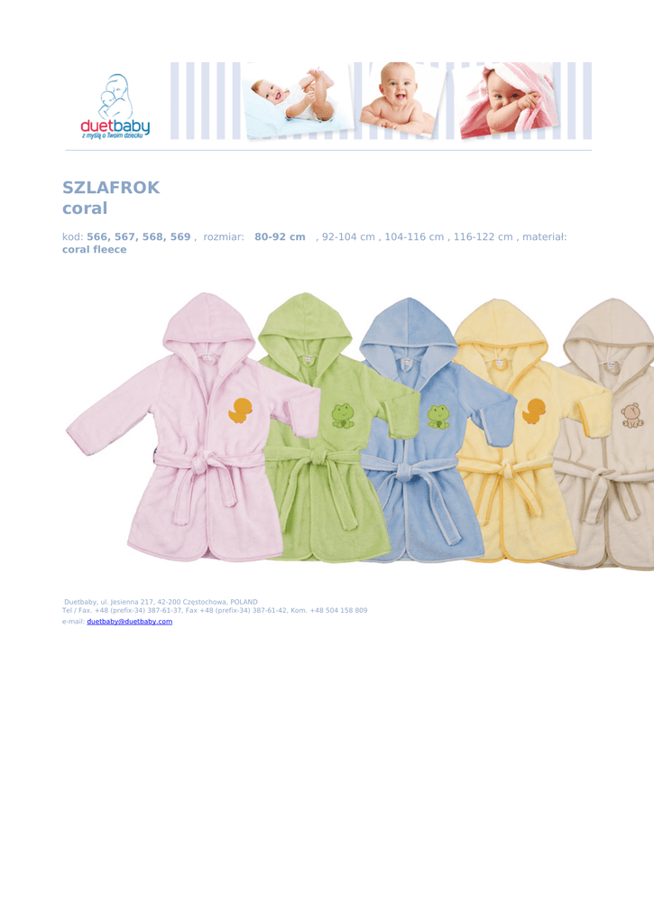 SZLAFROK coral kod: 566, 567, 568, 569 , rozmiar: coral fleece 80-92 cm , 92-104 cm , 104-116 cm , 116-122 cm , materiał: Duetbaby, ul. Jesienna 217, 42-200 Częstochowa, POLAND Tel / Fax. +48 (prefix-34) 387-61-37, Fax +48 (prefix-34) 387-61-42, Kom. +48 504 158 809 e-mail: [email protected] Powered by TCPDF (www.tcpdf.org)