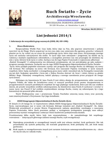 Ruch Światło – Życie Archidiecezja Wrocławska www.wroclaw.oaza.pl DIECEZJALNA DIAKONIA JEDNOŚCI 50- 32 8 W roc ła w, ul. Ka ted r a l na 4, p ok . 2 Wrocław, 06.03.2014 r. List Jedności 2014/1 I. Informacje do wszystkich grup oazowych (ODB, OR, OD i OM): Słowo Moderatora. Rozpoczęliśmy Wielki Post. Czas łaski, który daje na Pan, aby poprzez umartwienie i pokutę nawrócić się do Niego. Warto popatrzyć na ten czas, jako czas umierania dla egoizmu, grzechu i własnych planów po to, by rodzić się na nowo do prawdziwego życia, które daje nam Jezus. Otrzymanego nowego życia nie możemy zatrzymywać dla siebie. To życie daje nam entuzjazm i pragnienie, by dzielić się tą radością z każdym napotkanym człowiekiem, a szczególnie powinno nas ono przynaglać do dzielenia się nim z tymi, którym brak życia w sobie. Zachęca nas do tego Papież Franciszek w najnowszej adhortacji „Radość Ewangelii”. Z wdzięcznością ten dokument przyjmujemy, ale też potraktujmy go jako zadanie i program naszego działania. Zachęciła nas do tego XXXIX Kongregacja Odpowiedzialnych Ruchu Światło-Życie, która podjęła papieskie nauczanie czyniąc zeń program dla naszego Ruchu na zbliżający się nowy rok formacji. Nie czekajmy na nowy rok formacji, lecz nauczanie Papieża wcielajmy w życie naszych wspólnot, które będą wychodzić z ewangelizacją poza mury salek i mieszkań tak, by Ewangelia rozszerzała się już dziś. Szukajmy sposobów i form jak z Dobrą Nowina dotrzeć do braci i sióstr, którzy są głodni Miłości Boga. Ukazujmy ewangeliczną radość płynącą z nowego narodzenia przez przyjęcie do swego życia Jezusa. Zbliżająca się kanonizacja bł. Jana Pawła II jest dobrą okazją do przypomnienia sobie nauczania Papieża Polaka, ale także do świadectwa wiary w naszych parafiach przez pomoc duszpasterzom w przygotowaniach naszych parafialnych wspólnot do tego pięknego wydarzenia, które jest dla nas wielkim darem, ale przede wszystkim wielkim zobowiązaniem, by dziedzictwo Jana Pawła II zachować i wcielać w nasze życie. Jan Paweł II był wielkim orędownikiem naszego Ruchu, czumy się zobowiązani, by z Jego kanonizacji nie pozostał tylko obrazek. Niech Wielkopostny czas i przeżywane Święta Paschalne umocnią naszą wiarę oraz pozwolą nam zmartwychwstać z Chrystusem i być Jego świadkami. 1. 2. XXXIX Kongregacja Odpowiedzialnych Ruchu Światło-Życie. W dniach 21-24 lutego br. w Częstochowie odbyła XXXIX Kongregacja Odpowiedzialnych Ruchu ŚwiatłoŻycie, wprowadzająca nas w nowy rok formacji, którego tematem jest „Radość Ewangelii”. Ks. Adam Wodarczyk przedstawił w swoim Słowie Programowym zadania apostolskie wynikające z nauczania Papieża Franciszka, które Ruch powinien podjąć, a wystąpienia prelegentów pomogły nam odkryć powszechny wymiar ewangelizacji i zobaczyć różne możliwości podejmowania działań. Przedstawiamy kilka myśli, które były tam wypowiedziane – do samodzielnego lub wspólnego rozważenia - dotyczących głównego zadania naszego Ruchu, czyli ewangelizacji: a) b) Największą przeszkodą w ewangelizacji innych osób jest własna niechęć, brak gorliwości. Nie tak przeszkadza zły system polityczny, złe warunki gospodarcze, brak pieniędzy itd., jak brak mojej gorliwości. Brak zapału w ewangelizowaniu innych jest zarazem świetnym samousprawiedliwieniem się – skoro nic się nie uda, to i szkoda trudu. 1 Tymczasem nauka Jezusa w tej sprawie jest jednoznaczna – patrz przypowieści o minach, o talentach. Ostatecznie ten, który mnoży i ma - otrzyma, a ten, który nie przynosi owoców utraci i to, co wydaje mu się, że posiada. d) Rodzi się więc pytanie – po której stronie się opowiadam – tych, którzy mnożą uczniów Jezusa, czy też nie? Więcej informacji o KO znajduje się na stronach www.oaza.pl i www.wroclaw.oaza.pl c) Cieszymy się z udziału wielu osób w KO. W tym roku było nas 71 osób. Dziękujemy za osoby podejmujące odpowiedzialności. Niech udział w KO owocuje w nas i naszych wspólnotach. 3. Archidiecezjalne Wielkopostne Rekolekcje dla Ruchów i Stowarzyszeń Katolickich. Tak jak w ubiegłym roku, Rada Nowej Ewangelizacji zaprasza na rekolekcje wielkopostne dla Ruchów i Stowarzyszeń działających w naszej Archidiecezji (także dla Ruchu Światło-Życie), które odbędą się w parafii p.w. św. Maksymiliana Marii Kolbe we Wrocławiu (ul. Horbaczewskiego 20) w dniach 13-15 marca br. W tym wydarzeniu nie może zabraknąć naszego Ruchu. Będzie je głosił ks. Roman Trzciński z Warszawy - odpowiedzialny za wspólnotę modlitewnoewangelizacyjną „Woda Życia”. Ks. Roman przez wiele lat swojej posługi kapłańskiej był związany z naszym Ruchem. Program rekolekcji: Czwartek 13.03.2014 r. 1800 – Eucharystia z nauczaniem - ks. Roman Trzciński 1900 – Nabożeństwo Fatimskie – prowadzi ks. proboszcz Czesław Majda Po nabożeństwie spotkanie RNE i zaproszonych gości z ks. Romanem Trzcińskim Piątek 14.03.2014 r. 1800 – Eucharystia z nauczaniem - ks. Roman Trzciński 1900 – Droga Krzyżowa – prowadzi ks. Roman Trzciński Po nabożeństwie spotkanie z liderami Wspólnot i Ruchów (z osobami odpowiedzialnymi za ewangelizację we wspólnotach) Sobota 15.03.2014 r. 1630 – Nieszpory z nauczaniem – ks. Roman Trzciński 1800 – Eucharystia z nauczaniem – ks. abp. Senior Marian Gołębiewski Po Eucharystii Modlitwa uwielbienia Boga i modlitwa wstawiennicza Kongregacja Stowarzyszenia „DIAKONIA Ruchu Światło-Życie” Archidiecezji Wrocławskiej. 17 maja br. odbędzie się Kongregacja Stowarzyszenia „DIAKONIA Ruchu Światło-Życie” naszej Archidiecezji, której tematem będzie „Nieść radość Ewangelii do świata”. Będzie to jednocześnie kongregacja wyborcza (będziemy wybierać nowego Moderatora Diecezjalnego) i sprawozdawcza (będziemy podsumowywać pracę poszczególnych diakonii). Naszym gościem będzie Moderator