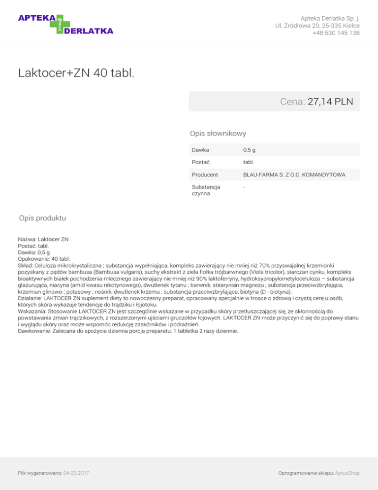 Apteka Derlatka Sp. j. Ul. Źródłowa 20, 25-335 Kielce +48 530 145 138 Laktocer+ZN 40 tabl. Cena: 27,14 PLN Opis słownikowy Dawka 0,5 g Postać tabl. Producent BLAU-FARMA S. Z O.O. KOMANDYTOWA Substancja czynna - Opis produktu Nazwa: Laktocer ZN Postać: tabl. Dawka: 0,5 g Opakowanie: 40 tabl. Skład: Celuloza mikrokrystaliczna ; substancja wypełniająca, kompleks zawierający nie mniej niż 70% przyswajalnej krzemionki pozyskany z pędów bambusa (Bambusa vulgaris), suchy ekstrakt z ziela fiołka trójbarwnego (Viola tricolor), siarczan cynku, kompleks bioaktywnych białek pochodzenia mlecznego zawierający nie mniej niż 90% laktoferryny, hydroksypropylometyloceluloza – substancja glazurująca, niacyna (amid kwasu nikotynowego), dwutlenek tytanu ; barwnik, stearynian magnezu ; substancja przeciwzbrylająca, krzemian glinowo-; potasowy ; nośnik, dwutlenek krzemu ; substancja przeciwzbrylająca, biotyna (D - biotyna). Działanie: LAKTOCER ZN suplement diety to nowoczesny preparat, opracowany specjalnie w trosce o zdrową i czystą cerę u osób, których skóra wykazuje tendencję do trądziku i łojotoku. Wskazania: Stosowanie LAKTOCER ZN jest szczególnie wskazane w przypadku skóry przetłuszczającej się, ze skłonnością do powstawania zmian trądzikowych, z rozszerzonymi ujściami gruczołów łojowych. LAKTOCER ZN może przyczynić się do poprawy stanu i wyglądu skóry oraz może wspomóc redukcję zaskórników i podrażnień. Dawkowanie: Zalecana do spożycia dzienna porcja preparatu: 1 tabletka 2 razy dziennie. Plik wygenerowano: 04-03-2017 Powered by TCPDF (www.tcpdf.org) Oprogramowanie sklepu: AptusShop