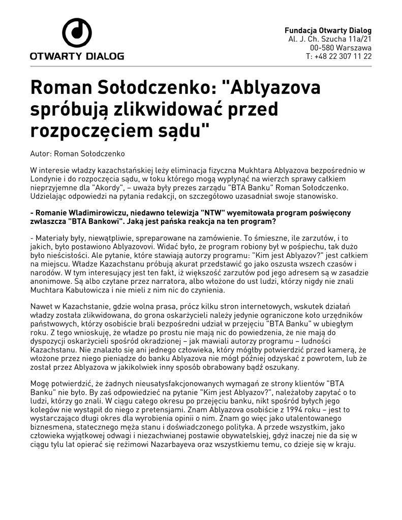 Fundacja Otwarty Dialog Al. J. Ch. Szucha 11a/21 00-580 Warszawa T: +48 22 307 11 22 Roman Sołodczenko: "Ablyazova spróbują zlikwidować przed rozpoczęciem sądu" Autor: Roman Sołodczenko W interesie władzy kazachstańskiej leży eliminacja fizyczna Mukhtara Ablyazova bezpośrednio w Londynie i do rozpoczęcia sądu, w toku którego mogą wypłynąć na wierzch sprawy całkiem nieprzyjemne dla "Akordy", – uważa były prezes zarządu "BTA Banku" Roman Sołodczenko. Udzielając odpowiedzi na pytania redakcji, on szczegółowo uzasadniał swoje stanowisko. - Romanie Wladimirowiczu, niedawno telewizja "NTW" wyemitowała program poświęcony zwłaszcza "BTA Bankowi". Jaką jest pańska reakcja na ten program? - Materiały były, niewątpliwie, spreparowane na zamówienie. To śmieszne, ile zarzutów, i to jakich, było postawiono Ablyazovovi. Widać było, że program robiony był w pośpiechu, tak dużo było nieścisłości. Ale pytanie, które stawiają autorzy programu: "Kim jest Ablyazov?" jest całkiem na miejscu. Władze Kazachstanu próbują akurat przedstawić go jako oszusta wszech czasów i narodów. W tym interesujący jest ten fakt, iż większość zarzutów pod jego adresem są w zasadzie anonimowe. Są albo czytane przez narratora, albo włożone do ust ludzi, którzy nigdy nie znali Muchtara Kabułowicza i nie mieli z nim nic do czynienia. Nawet w Kazachstanie, gdzie wolna prasa, prócz kilku stron internetowych, wskutek działań władzy została zlikwidowana, do grona oskarżycieli należy jedynie ograniczone koło urzędników państwowych, którzy osobiście brali bezpośredni udział w przejęciu "BTA Banku" w ubiegłym roku. Z tego wnioskuję, że władze po prostu nie mają nic do powiedzenia, że nie mają do dyspozycji oskarżycieli spośród okradzionej – jak mawiali autorzy programu – ludności Kazachstanu. Nie znalazło się ani jednego człowieka, który mógłby potwierdzić przed kamerą, że włożone przez niego pieniądze do banku Ablyazova nie mógł później odzyskać z powrotem, lub że został przez Ablyazova w jakikolwiek inny sposób obrabowany bądź oszukany. Mogę potwierdzić, że żadnych nieusatysfakcjonowanych wymagań ze strony klientów "BTA Banku" nie było. By zaś odpowiedzieć na pytanie "Kim jest Ablyazov?", należałoby zapytać o to ludzi, którzy go znali. W ciągu całego okresu po przejęciu banku, nikt spośród byłych jego kolegów nie wystąpił do niego z pretensjami. Znam Ablyazova osobiście z 1994 roku – jest to wystarczająco długi okres dla wyrobienia opinii o nim. Znam go więc jako utalentowanego biznesmena, statecznego męża stanu i doświadczonego polityka. A przede wszystkim, jako człowieka wyjątkowej odwagi i niezachwianej postawie obywatelskiej, gdyż inaczej nie da się w ciągu tylu lat opierać się reżimowi Nazarbayeva oraz wszystkiemu temu, co dzieje się w kraju. - Co, pana zdaniem, chcą osiągnąć władze kazachstańskie? Przecież tak ogromne zasoby zaangażowane są dla prześladowania Ablyazova w Londynie, w Rosji i innych krajach. - Usiłują one fakt rozpatrzenia powodów przeciwko Ablyazovovi w Londynie przedstawić jako międzynarodowe wyznanie go za oszusta o skali międzynarodowej. W rzeczywistości jednak jestem pewny, że rozpoczęcie procesu przez sąd londyński jest wielkim zagrożeniem akurat dla strony kazachstańskiej. Umożliwi on wyjście na jaw i opublikowanie wielu nieprzyjemnych dla "Ak ordy" faktów. Będąc, prawdopodobnie, świadomi tego zagrożenia, władze kazachstańskie w rzeczywistości troszczą się nie o dobrobyt deponentów "BTA Banku" czy zwrot pieniędzy wierzycielom. Ich celem jest zmuszenie Ablyazova do milczenia. Zważywszy na smutną listę ofiar reżimu, które – niestety – bardzo jest dzisiaj obszerna, jestem pewny: oni są zainteresowani w eliminacji fizycznej Mukhtara. Tutaj, w Londynie, przed rozpoczęciem sądu. Jestem pewny, że oni się nie zatrzymają. Istnieje więc realne zagrożenie dla jego życia. - Ale przecież zamach na życie Ablyazova wywoła wielkie poruszenie. Czy się odważą? - Nikt nie wierzył, że odważą się oni na zabójstwo Ałtynbeka Sarsenbajewa. Było to szokujące. Nikt nie wierzył, że służby powiązane bezpośrednio z prezydentem będą zaangażowane w zabójstwie jednego z polityków opozycyjnych. Ale, niestety, ów biznes prowadzony przez Kazachstan na arenie międzynarodowej – czy to naftowy, czy jakikolwiek inny – zapewnia reżimowi poczucie swoistej bezkarności. Wierząc w bezgraniczną moc pieniądza ci ludzie uważają, że w imię zachowania interesów biznesowych z Kazachstanem rządy innych państw nie będą specjalnie zwracać uwagi na problemy z prawami człowieka i wolnością słowa. I ta reakcja, którą obserwujemy w ciągu roku, kiedy Kazachstan przewodniczy w OBWE, w pewnej mierze potwierdza to stanowisko władz kazachstańskich. Są zobowiązania przyjęte przez Kazachstan podczas spotkania Madryckiego, gdy podejmowana była decyzja o przewodniczeniu. Żadne z tych zobowiązań na dziś dzień nie zostało wypełnione. Rozumiemy więc, że tak też pozostaną niewypełnione. I w ciągu tego okresu nie usłyszeliśmy stanowczego zdania OBWE w kwestii niewypełniania przez Kazachstan powziętych zobowiązań. - Bardzo proszę pana opowiedzieć o tym, jak odbywało się przejęcie "BTA Banku". - Przede wszystkim, samo przejęcie było nagłe. O tym, że rząd będzie zabierał bank, dowiedziałem się w piątek wieczorem na spotkaniu z premierem i ministrem skarbu Żamiszewem. A w poniedziałek, 2 lutego o godz. 9 rano, zapadła decyzja. W tym dniu rząd zgromadził się o 8.30, czego wcześniej nie zaobserwowano. Na szczęście, w Kazachstanie nie było przypadku wypowiedzenia wojny, myślę więc, że była ku temu wystarczająco poważna przyczyna, by mężowie stanu zgromadzili się o 8.30. Po tym, jak rząd ogłosił swoją decyzję, zaczęła się panika. Ludzie, którzy wiedz