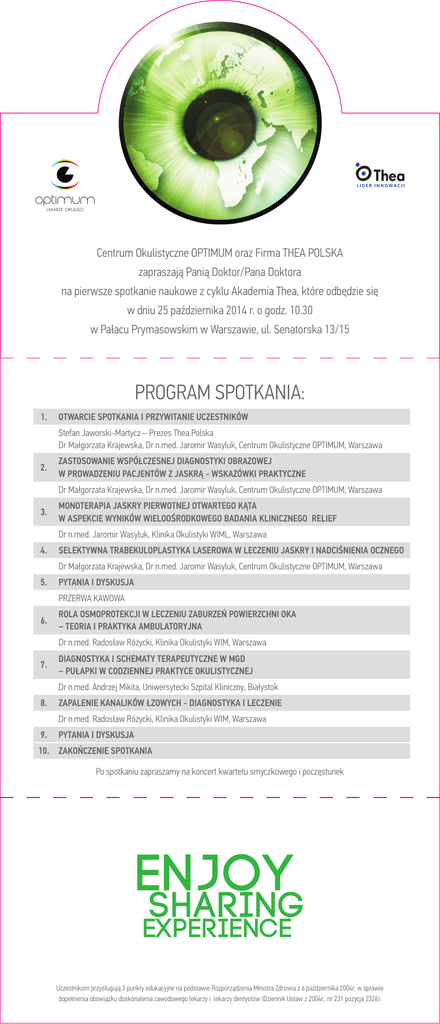 Centrum Okulistyczne OPTIMUM oraz Firma THEA POLSKA zapraszają Panią Doktor/Pana Doktora na pierwsze spotkanie naukowe z cyklu Akademia Thea, które odbędzie się w dniu 25 października 2014 r. o godz. 10.30 w Pałacu Prymasowskim w Warszawie, ul. Senatorska 13/15 PROGRAM SPOTKANIA: 1. OTWARCIE SPOTKANIA I PRZYWITANIE UCZESTNIKÓW Stefan Jaworski-Martycz – Prezes Thea Polska Dr Małgorzata Krajewska, Dr n.med. Jaromir Wasyluk, Centrum Okulistyczne OPTIMUM, Warszawa 2. Z ASTOSOWANIE WSPÓŁCZESNEJ DIAGNOSTYKI OBRAZOWEJ W PROWADZENIU PACJENTÓW Z JASKRĄ - WSKAZÓWKI PRAKTYCZNE Dr Małgorzata Krajewska, Dr n.med. Jaromir Wasyluk, Centrum Okulistyczne OPTIMUM, Warszawa 3. ONOTERAPIA JASKRY PIERWOTNEJ OTWARTEGO KĄTA M W ASPEKCIE WYNIKÓW WIELOOŚRODKOWEGO BADANIA KLINICZNEGO RELIEF Dr n.med. Jaromir Wasyluk, Klinika Okulistyki WIML, Warszawa 4. SELEKTYWNA TRABEKULOPLASTYKA LASEROWA W LECZENIU JASKRY I NADCIŚNIENIA OCZNEGO Dr Małgorzata Krajewska, Dr n.med. Jaromir Wasyluk, Centrum Okulistyczne OPTIMUM, Warszawa 5. PYTANIA I DYSKUSJA PRZERWA KAWOWA 6. OLA OSMOPROTEKCJI W LECZENIU ZABURZEŃ POWIERZCHNI OKA R – TEORIA I PRAKTYKA AMBULATORYJNA Dr n.med. Radosław Różycki, Klinika Okulistyki WIM, Warszawa 7. IAGNOSTYKA I SCHEMATY TERAPEUTYCZNE W MGD D – PUŁAPKI W CODZIENNEJ PRAKTYCE OKULISTYCZNEJ Dr n.med. Andrzej Mikita, Uniwersytecki Szpital Kliniczny, Białystok 8. ZAPALENIE KANALIKÓW ŁZOWYCH - DIAGNOSTYKA I LECZENIE Dr n.med. Radosław Różycki, Klinika Okulistyki WIM, Warszawa 9. PYTANIA I DYSKUSJA 10. ZAKOŃCZENIE SPOTKANIA Po spotkaniu zapraszamy na koncert kwartetu smyczkowego i poczęstunek Uczestnikom przysługują 3 punkty edukacyjne na podstawie Rozporządzenia Ministra Zdrowia z 6 października 2004r. w sprawie dopełnienia obowiązku doskonalenia zawodowego lekarzy i lekarzy dentystów (Dziennik Ustaw z 2004r., nr 231 pozycja 2326).