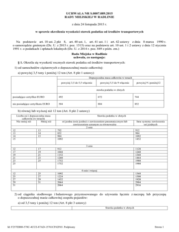 UCHWAŁA NR S.0007.089.2015 RADY MIEJSKIEJ W RADLINIE z dnia 24 listopada 2015 r. w sprawie określenia wysokości stawek podatku od środków transportowych Na podstawie art. 18 ust. 2 pkt 8, art. 40 ust. 1, art. 41 ust. 1 i art. 42 ustawy z dnia 8 marca 1990 r. o samorządzie gminnym (Dz. U. z 2015 r. poz. 1515) oraz na podstawie art. 10 ust. 1 i 2 ustawy z dnia 12 stycznia 1991 r. o podatkach i opłatach lokalnych (Dz. U. z 2014 r. poz. 849 z późn. zm.) Rada Miejska w Radlinie uchwala, co następuje: § 1. Określa się wysokość rocznych stawek podatku od środków transportowych: 1) od samochodów ciężarowych o dopuszczalnej masie całkowitej: a) powyżej 3,5 tony i poniżej 12 ton (Art. 8 pkt 1 ustawy) Dopuszczalna masa całkowita w tonach powyżej 3,5 do 5,5 włącznie powyżej 5,5 do 9 włącznie powyżej 9 i poniżej12 stawka podatku w złotych posiadające certyfikat EURO 492 672 744 nie posiadające certyfikatu EURO 504 804 852 b) równej lub wyższej niż 12 ton (Art. 8 pkt 2 ustawy) Liczba osi i dopuszczalna masa całkowita (w tonach) Nie mniej niż Mniej niż Stawka podatku w złotych oś jezdna (osie jezdne) z zawieszeniem pneumatycznym lub zawieszeniem uznanym za równoważne 2 osie 12 13 14 15 13 14 15 792 852 984 1092 12 17 19 21 23 25 17 19 21 23 25 912 1044 1152 1260 1752 1752 12 25 27 29 31 25 27 29 31 1092 1224 1452 2064 2064 Inne systemy zawieszenia osi jezdnych 912 984 1092 1452 3 osie 1128 1260 1368 1464 1980 1980 4 osie i więcej 1368 1500 1920 2904 2916 2) od ciągnika siodłowego i balastowego przystosowanego do używania łącznie z naczepą lub przyczepą o dopuszczalnej masie całkowitej zespołu pojazdów: a) od 3,5 tony i poniżej 12 ton (Art. 8 pkt 3 ustawy) Stawka podatku w złotych Id: F257EB80-578C-4CCE-87AD-15761CF62F65. Podpisany Strona 1 Ciągniki wyprodukowane posiadające certyfikat EURO nie posiadające certyfikatu EURO od 3,5 tony do 7 włącznie powyżej 7 ton i poniżej 12 144 264 264 384 b) równej lub wyższej niż 12 ton (Art.8 pkt 4 ustawy) Liczba osi i dopuszczalna masa całkowita zespołu pojazdów: ciągnik siodłowy + naczepa, ciągnik balastowy + przyczepa (w tonach) Nie mniej niż Mniej niż 12 18 25 31 18 25 31 12 40 40 Stawka podatku w złotych oś jezdna (osie jezdne) z zawieszeniem pneumatycznym lub zawieszeniem uznanym za równoważne 2 osie 156 276 624 1560 3 osie i więcej 1452 2064 Inne systemy zawieszenia osi jezdnych 276 528 1032 2268 2064 2976 3) od przyczepy i naczepy, które łącznie z pojazdem silnikowym posiadają dopuszczalną masę całkowitą (z wyjątkiem związanych wyłącznie z działalnością rolniczą prowadzoną przez podatnika podatku rolnego): a) od 7 ton i poniżej 12 (Art. 8 pkt 5 ustawy) - stawka podatku 132,00 zł b) równą lub wyższą niż 12 ton ( Art. 8 pkt 6 ustawy) Liczba osi i dopuszczalna masa całkowita zespołu pojazdów: naczepa/przyczepa + pojazd silnikowy (w tonach) Nie mniej niż 12 18 Mniej niż 18 25 25 Stawka podatku w złotych oś jezdna (osie jezdne) z zawieszeniem pneumatycznym lub zawieszeniem uznanym za równoważne 1 oś 156 276 Inne systemy zawieszenia osi jezdnych 264 396 336 588 2 osie 12 28 33 28 33 38 38 12 38 38 264 672 984 396 948 1488 1344 2004 3 osie i więcej 744 1056 996 1476 4) od autobusów w zależności od liczby miejsc do siedzenia poza miejscem kierowcy (Art. 8 pkt 7 ustawy): Mniejszej niż 22 miejsc posiadające certyfikat EURO nie posiadające certyfikatu EURO 864 1224 Stawka podatku w złotych Równej lub wyższej niż 22 miejsc 1584 1824 § 2. Z dniem wejścia w życie niniejszej uchwały traci moc uchwała Nr BRM.0007.084.2014 Rady Miejskiej w Radlinie z dnia 28 paździenika 2014 r. w sprawie określenia wysokości stawek podatku od środków transportowych. § 3. Wykonanie uchwały powierza się Burmistrzowi Radlina. Id: F257EB80-578C-4CCE-87AD-15761CF62F65. Podpisany Strona 2 § 4. 1. Uchwała wchodzi w życie z dniem 1 stycznia 2016 r. 2. Uchwała podlega ogłoszeniu w Dzienniku Urzędowym Województwa Śląskiego oraz wywieszeniu na tablicy ogłoszeń Urzędu Miasta Radlin i BIP. Przewodnicząca Rady Miejskiej mgr Gabriela Chromik Id: F257EB80-578C-4CCE-87AD-15761CF62F65. Podpisany Strona 3