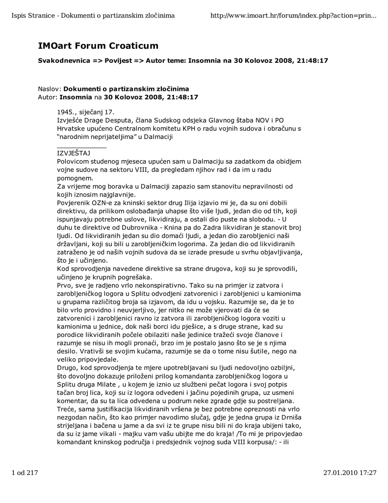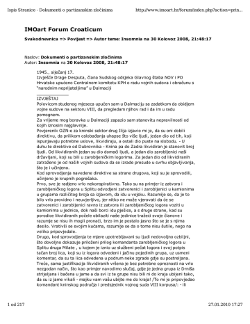 Ispis Stranice - Dokumenti o partizanskim zločinima http://www.imoart.hr/forum/index.php?action=prin... IMOart Forum Croaticum Svakodnevnica => Povijest => Autor teme: Insomnia na 30 Kolovoz 2008, 21:48:17 Naslov: Dokumenti o partizanskim zločinima Autor: Insomnia na 30 Kolovoz 2008, 21:48:17 1945., siječanj 17. Izvješće Drage Desputa, člana Sudskog odsjeka Glavnog štaba NOV i PO Hrvatske upućeno Centralnom komitetu KPH o radu vojnih sudova i obračunu s “narodnim neprijateljima” u Dalmaciji _____________ IZVJEŠTAJ Polovicom studenog mjeseca upućen sam u Dalmaciju sa zadatkom da obidjem vojne sudove na sektoru VIII, da pregledam njihov rad i da im u radu pomognem. Za vrijeme mog boravka u Dalmaciji zapazio sam stanovitu nepravilnosti od kojih iznosim najglavnije. Povjerenik OZN-e za kninski sektor drug Ilija izjavio mi je, da su oni dobili direktivu, da prilikom oslobađanja uhapse što više ljudi, jedan dio od tih, koji ispunjavaju potrebne uslove, likvidiraju, a ostali dio puste na slobodu. - U duhu te direktive od Dubrovnika - Knina pa do Zadra likvidiran je stanovit broj ljudi. Od likvidiranih jedan su dio domaći ljudi, a jedan dio zarobljenici naši državljani, koji su bili u zarobljeničkim logorima. Za jedan dio od likvidiranih zatraženo je od naših vojnih sudova da se izrade presude u svrhu objavljivanja, što je i učinjeno. Kod sprovodjenja navedene direktive sa strane drugova, koji su je sprovodili, učinjeno je krupnih pogrešaka. Prvo, sve je radjeno vrlo nekonspirativno. Tako su na primjer iz zatvora i zarobljeničkog logora u Splitu odvodjeni zatvorenici i zarobljenici u kamionima u grupama različitog broja sa izjavom, da idu u vojsku. Razumije se, da je to bilo vrlo providno i neuvjerljivo, jer nitko ne može vjerovati da će se zatvorenici i zarobljenici ravno iz zatvora ili zarobljeničkog logora voziti u kamionima u jednice, dok naši borci idu pješice, a s druge strane, kad su porodice likvidiranih počele obilaziti naše jedinice tražeći svoje članove i razumje se nisu ih mogli pronaći, brzo im je postalo jasno što se je s njima desilo. Vrativši se svojim kućama, razumije se da o tome nisu šutile, nego na veliko pripovjedale. Drugo, kod sprovodjenja te mjere upotrebljavani su ljudi nedovoljno ozbiljni, što dovoljno dokazuje priloženi prilog komandanta zarobljeničkog logora u Splitu druga Milate , u kojem je iznio uz službeni pečat logora i svoj potpis tačan broj lica, koji su iz logora odvedeni i jačinu pojedinih grupa, uz usmeni komentar, da su ta lica odvedena u podrum neke zgrade gdje su postreljana. Treće, sama justifikacija likvidiranih vršena je bez potrebne opreznosti na vrlo nezgodan način, što kao primjer navodimo slučaj, gdje je jedna grupa iz Drniša strijeljana i bačena u jame a da svi iz te grupe nisu bili ni do kraja ubijeni tako, da su iz jame vikali - majku vam vašu ubijte me do kraja! /To mi je pripovjedao komandant kninskog područja i predsjednik vojnog suda VIII korpusa/: - ili 1 od 217 27.01.2010 17:27 Ispis Stranice - Dokumenti o partizanskim zločinima http://www.imoart.hr/forum/index.php?action=prin... slučaj u Dubrovniku gdje se je justifikacija vršila ne strijeljanjem već su se takva lica klala. To je u Dubrovniku radila jedinica narodne obrane, a ja sam za to saznao od komandira čete narodne obrane. Četvrto, kod sprovodjenja te mjere drugovi koji su je sprovodili bili su vrlo površni. Kao primjer navodimo slučaj koji se je desio u Dubrovniku, gdje je u oglasu osudjenih na smrt bio naveden i jedan gradjanin Dubrovnika, koji se je u tom momentu nalazio na slobodi i u oglasu među strijeljanima čitao svoje ime i prezime; - ili slučaj u Splitu gdje se još i danas nalazi u sudskom zatvoru jedan gradjanin Splita, koji je bio odredjen za strijeljanje i neposredno prije odvođenja na strijeljanje nekim slučajem dospio je u sudski zatvor. Kod OZN-e je zaveden u popisu likvidiranih. Peto, među likvidiranima bez suda nalaze se i takovi, koji bi, da imaju deset života deset puta bili osudjeni na smrt. To su ljudi, koji su svojim radom počinili toliko zla tamošnjem narodu, organizatori četničkih i ustaških banda, te bi se, njihovim izvodjenjem na javno sudjenje, dala ne samo izvjesna zadovoljština tamošnjem narodu, već bi se i postigao veliki politički uspjeh, jer su to klasični primjeri preko kojih bi se sjajno moglo raskrinkati i ustaštvo i četništvo, kao i djelovanje okupatora. Osim toga medju likvidiranim ima i takovih, koji se nikako nisu smjeli likvidirati unutar četri zida. Njih je trebalo najprije raskrinkati medju narodom, izvesti na javno sudjenje i onda suditi. Kao primjer navodim slučaj sa 20 popova u Dubrovniku. Šesto, već sam napred naveo, da je za jedan dio od likvidiranih zatraženo od naših sudskih organa, da se izradi presuda isključivo u svrhu javnog objavljivanja. Naši sudski organi u velikoj su većini tek od novijeg vremena u našem pokretu. Politički su neizgradjeni, s našim pokretom i borbom nesaživljeni, malogradjani. Saznavši za takav postupak OZN-e oni su, razumije se, primili to s negodovanjem i o tome, možda ne u zloj namjeri, pripovjedali drugima. Kako je to daleko otišlo, koliko pogrešno i sa kakvim nerazumjevanjem je to shvaćeno sa strane naših organa najbolje ilustrira slučaj sekretara našeg vojnog suda vijeća kod komande šibenskog područja, koji je učinio čak slijedeću “uredovnu zabilješku”: - “Prema zahtjevu Opunomoćstva OZN-e šibenskog područja, ovaj Sud je naknadno sastavio presudu, radi javnog oglašavanja iste u Šibeniku. ........ Ovakav postupak je kao izniman bio, prema saopćenjima dobivenim od opunomoćstva OZN-e u Šibeniku, dirigiran od viših faktora i odobren od nadležnih političkih funkcionera”. Sedmo, od OZN-e je zatraženo, a po našim organima tako izradjene presude u svrhu objavljivanja nisu od drugova iz OZN-e pregledane, te se je i u tom pravcu griješilo. Kao primjer navodim presudu Oliver Mat