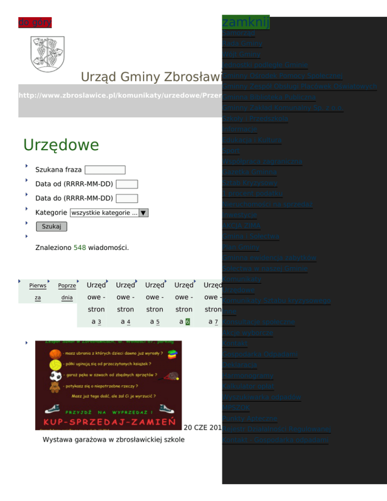 zamknij do góry Samorząd Rada Gminy Wójt Gminy Jednostki podległe Gminie Gminny Ośrodek Pomocy Społecznej Urząd Gminy Zbrosławice Gminny Zespół Obsługi Placówek Oświatowych http://www.zbroslawice.pl/komunikaty/urzedowe/Przerwy-w-dostawie-energii-elektrycznej/id Gminna Biblioteka Publiczna /printpdf/st:6 Gminny Zakład Komunalny Sp. z o.o. Szkoły i Przedszkola Informacje Urzędowe Edukacja i Kultura Sport Współpraca zagraniczna Szukana fraza Gazetka Gminna Data od (RRRR-MM-DD) Sztab Kryzysowy 1 procent podatku Data do (RRRR-MM-DD) Nieruchomości na sprzedaż Kategorie wszystkie kategorie ... ▼ Inwestycje AKCJA ZIMA Szukaj Gmina i Sołectwa Plan Gminy Znaleziono 548 wiadomości. Gminna ewidencja zabytków Sołectwa w naszej Gminie Pierws Poprze Urzęd Urzęd Urzęd Urzęd za dnia owe - owe - owe - owe - stron stron stron stron a3 a4 a5 a 6 Komunikaty Urzęd Urzęd Urzęd Następ Ostatni Urzędowe owe owe owe na a Komunikaty Sztabu kryzysowego stron Innestron stron a 7 Konsultacje a8 a9 społeczne Akcje wyborcze Kontakt Gospodarka Odpadami Deklaracja Harmonogramy Kalkulator opłat Wyszukiwarka odpadów MPSZOK Punkty Apteczne 20 CZE 2016 Rejestr Działalności Regulowanej Wystawa garażowa w zbrosławickiej szkole kategoria: Kontakt - Gospodarka odpadami Komunikaty urzędowe Rada Rodziców Zespołu Szkól w Zbrosławicach zaprasza wszystkich chętnych na szkolną wyprzedaż garażową. Odbędzie się ona w sobotę 25 czerwca w godz. 10:00-14:00 na parkingu szkolnym (Zbrosławice, ul. Wolności 67). Więcej informacji na www.szkola.zbroslawice.pl 14 CZE 2016 kategoria: Remont kładki nad rzeką Drama w Kamieńcu Komunikaty urzędowe Dnia 13.06.2016 r. rozpoczął się remont kładki nad rzeką Drama w Kamieńcu stanowiącej jedyną przeprawę nad rzeką dla mieszkańców i dzieci uczęszczających do Zespołu Szkół w Kamieńcu. Remont będzie polegać na demontażu konstrukcji kładki, wymianie elementów nośnych, zabudowę pali iniekcyjnych i wykonanie płyty żelbetowej na kładce. Na czas wykonywanych prac obecna kładka nie będzie dostępna dla pieszych, w związku 13 CZE 2016 OGŁOSZENIE O ROKOWANIACH „sprzedaż składnika rzeczowego majątku ruchomego” kategoria: Komunikaty urzędowe Wójt Gminy Zbrosławice ogłasza rokowania na „sprzedaż składnika rzeczowego majątku ruchomego" Gmina Zbrosławice z siedzibą w Zbrosławicach przy ul. Oświęcimskiej 2. Miejsce i termin przeprowadzenia rokowań: 22 lipca 2016r. o godz. 1000 w Centrum Usług Publicznych w Zbrosławicach ul. Oświęcimska 2a. Rokowania na sprzedaż niżej wymienionego składnika majątku ruchomego:Naczepa do przewozu koni marki Mercedes. Numer 10 CZE 2016 Ogłoszenie kategoria: Komunikaty urzędowe Wójt Gminy Zbrosławice informuje, że został wywieszony na okres 21 dni, tj. od dnia 08.06.2016 r. do dnia 28.06.2016 r. na tablicy ogłoszeń Urzędu Gminy w Zbrosławicach przy ul. Oświęcimskiej 2, wykaz nieruchomości przeznaczonych do dzierżawy: działka nr 867/246(k. m. 4obręb Czekanów) o pow. 0,0080 ha. działka nr 868/246(k. m. 4obręb Czekanów) o pow. 0,0082 ha. działka nr 487/15 (k. m. 1 Kęp obręb Wilkowice) o pow. 07 CZE 2016 kategoria: Przeprosiny Komunikaty urzędowe Przepraszamy Pana Mirosława Ogińskiego za umieszczenie na plakacie promocyjnym oraz zaproszeniach na wydarzenie "Wokoło Industriady" bez uzyskania zgody rysunku utopca, którego jest on autorem. 07 CZE 2016 Zapraszamy na Industriadę do Karchowic 07 CZE 2016 Noc Świętojańska w Świętoszowicach 06 CZE 2016 Trening systemu alarmowania i ostrzegania podczas krajowego ćwiczenia "Anakonda 16" kategoria: Komunikaty urzędowe W dniach 7 - 9 czerwca br. (termin zapasowy 10 czerwca br.) Dowództwo Operacyjne Rodzajów Sił Zbrojnych organizuje krajowe ćwiczenie „Anakonda 16". Podczas ćwiczenia odbędzie się również trening systemu alarmowania i ostrzegania, podczas którego może wystąpić konieczność uruchomienia syren alarmowych w celu ogłoszenia i odwołania alarmu. Podczas ćwiczenia „Anakonda 16", w trybie całodobowym odbędą się epizody 06 CZE 2016 Ciąg dalszy modernizacji ewidencji gruntów w Gminie Zbrosławice kategoria: Komunikaty urzędowe Swoim ogłoszeniem nr GP.K.6623.61.2015 z dnia 22.04.2016 r. Starosta Tarnogórski zawiadomił o wyłożeniu do wglądu osób zainteresowanych, w szczególności właścicieli nieruchomości w sołectwach Boniowice, Karchowice, Wieszowa i Zawada, projektu operatu opisowo-kartograficznego modernizacji ewidencji gruntów i budynków. Dane wykazane w ewidencji gruntów i budynków Starostwa Powiatowego w Tarnowskich Górach są wiążące dla 03 CZE 2016 Wokoło Industrady Pierws Poprze Urzęd Urzęd Urzęd Urzęd Urzęd Urzęd Urzęd Następ Ostatni za dnia owe - owe - owe - owe - owe - owe - owe - na a stron stron stron stron stron stron stron a3 a4 a5 a7 a8 a9 a 6
