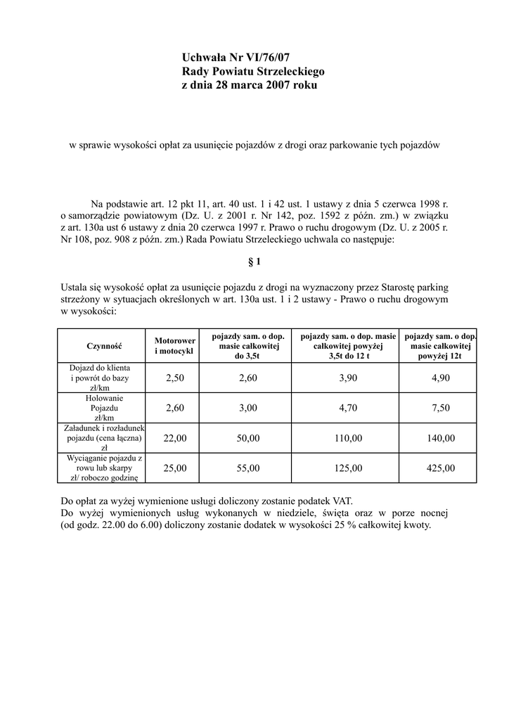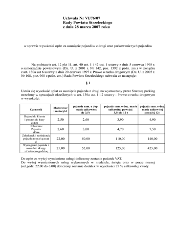 Uchwała Nr VI/76/07 Rady Powiatu Strzeleckiego z dnia 28 marca 2007 roku w sprawie wysokości opłat za usunięcie pojazdów z drogi oraz parkowanie tych pojazdów Na podstawie art. 12 pkt 11, art. 40 ust. 1 i 42 ust. 1 ustawy z dnia 5 czerwca 1998 r. o samorządzie powiatowym (Dz. U. z 2001 r. Nr 142, poz. 1592 z późn. zm.) w związku z art. 130a ust 6 ustawy z dnia 20 czerwca 1997 r. Prawo o ruchu drogowym (Dz. U. z 2005 r. Nr 108, poz. 908 z późn. zm.) Rada Powiatu Strzeleckiego uchwala co następuje: §1 Ustala się wysokość opłat za usunięcie pojazdu z drogi na wyznaczony przez Starostę parking strzeżony w sytuacjach określonych w art. 130a ust. 1 i 2 ustawy - Prawo o ruchu drogowym w wysokości: Czynność Dojazd do klienta i powrót do bazy zł/km Holowanie Pojazdu zł/km Załadunek i rozładunek pojazdu (cena łączna) zł Wyciąganie pojazdu z rowu lub skarpy zł/ roboczo godzinę Motorower i motocykl pojazdy sam. o dop. masie całkowitej do 3,5t pojazdy sam. o dop. masie całkowitej powyżej 3,5t do 12 t pojazdy sam. o dop. masie całkowitej powyżej 12t 2,50 2,60 3,90 4,90 2,60 3,00 4,70 7,50 22,00 50,00 110,00 140,00 25,00 55,00 125,00 425,00 Do opłat za wyżej wymienione usługi doliczony zostanie podatek VAT. Do wyżej wymienionych usług wykonanych w niedziele, święta oraz w porze nocnej (od godz. 22.00 do 6.00) doliczony zostanie dodatek w wysokości 25 % całkowitej kwoty. §2 Ustala się wysokość opłat za parkowanie pojazdu usuniętego z drogi na parking wyznaczony przez Starostę w następującej wysokości: opłata za pierwszą dobę postoju opłata za każdą następną rozpoczętą dobę postoju 4,50 4,20 10,30 10,00 17,00 14,50 27,00 25,50 przyczepa do dmc 750 kg 5,80 5,60 przyczepa o dmc do 3,5 t i campingowa 10,60 10,30 przyczepa o dmc do 12 t 14,50 13,50 przyczepa, naczepy o dmc powyżej 12 t 26,00 25,00 rodzaj pojazdu motorower, motocykl pojazd samochodowy o dmc do 3,5 t i ciągnik rolniczy pojazd samochodowy o dmc powyżej 3,5 t do 12 t i autobusy pojazd samochodowy o dmc powyżej 12 t Do wyżej wymienionych opłat doliczony zostanie podatek VAT. §3 Traci moc uchwała Nr XLVII/340/2002 z dnia 9 października 2002 roku (Dz. Urz. Woj. Op. Nr 114, poz. 1484) §4 Wykonanie uchwały powierza się Zarządowi Powiatu Strzeleckiego. §5 Uchwała podlega ogłoszeniu w Dzienniku Urzędowym Województwa Opolskiego i wchodzi w życie po upływie 14 dni od jej ogłoszenia.