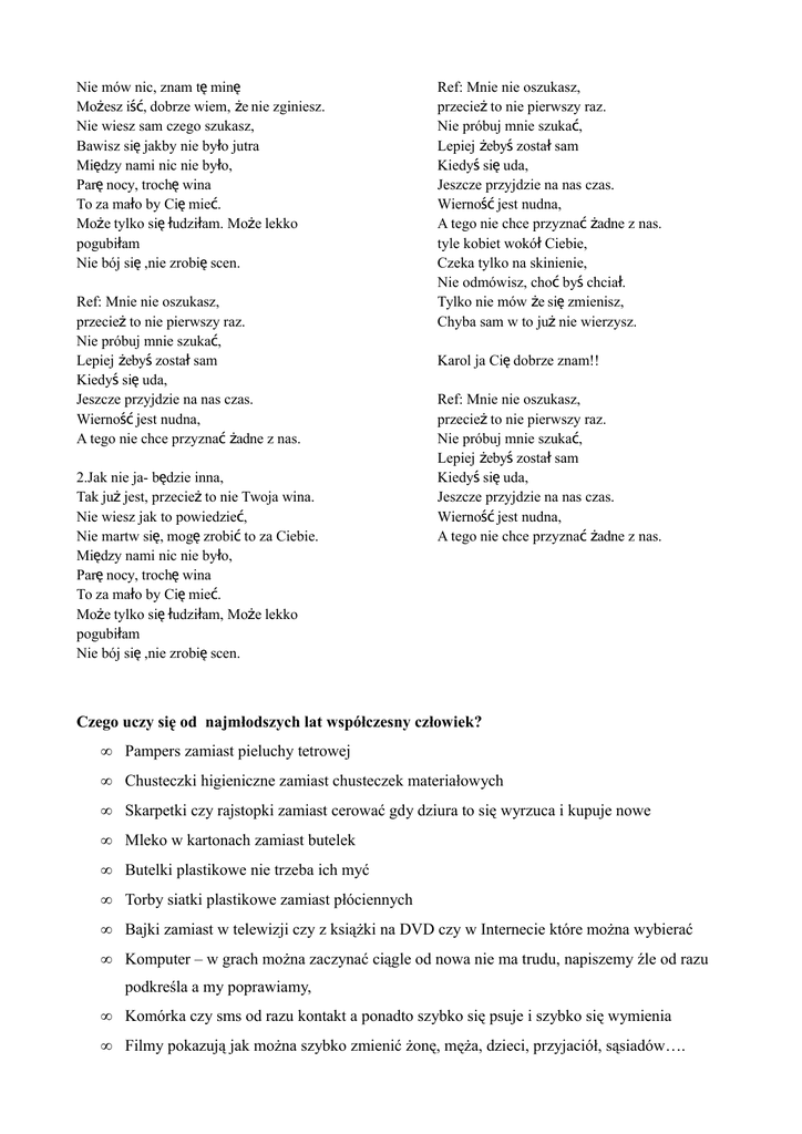 Nie mów nic, znam tę minę Możesz iść, dobrze wiem, że nie zginiesz. Nie wiesz sam czego szukasz, Bawisz się jakby nie było jutra Między nami nic nie było, Parę nocy, trochę wina To za mało by Cię mieć. Może tylko się łudziłam. Może lekko pogubiłam Nie bój się ,nie zrobię scen. Ref: Mnie nie oszukasz, przecież to nie pierwszy raz. Nie próbuj mnie szukać, Lepiej żebyś został sam Kiedyś się uda, Jeszcze przyjdzie na nas czas. Wierność jest nudna, A tego nie chce przyznać żadne z nas. 2.Jak nie ja- będzie inna, Tak już jest, przecież to nie Twoja wina. Nie wiesz jak to powiedzieć, Nie martw się, mogę zrobić to za Ciebie. Między nami nic nie było, Parę nocy, trochę wina To za mało by Cię mieć. Może tylko się łudziłam, Może lekko pogubiłam Nie bój się ,nie zrobię scen. Ref: Mnie nie oszukasz, przecież to nie pierwszy raz. Nie próbuj mnie szukać, Lepiej żebyś został sam Kiedyś się uda, Jeszcze przyjdzie na nas czas. Wierność jest nudna, A tego nie chce przyznać żadne z nas. tyle kobiet wokół Ciebie, Czeka tylko na skinienie, Nie odmówisz, choć byś chciał. Tylko nie mów że się zmienisz, Chyba sam w to już nie wierzysz. Karol ja Cię dobrze znam!! Ref: Mnie nie oszukasz, przecież to nie pierwszy raz. Nie próbuj mnie szukać, Lepiej żebyś został sam Kiedyś się uda, Jeszcze przyjdzie na nas czas. Wierność jest nudna, A tego nie chce przyznać żadne z nas. Czego uczy się od najmłodszych lat współczesny człowiek? • Pampers zamiast pieluchy tetrowej • Chusteczki higieniczne zamiast chusteczek materiałowych • Skarpetki czy rajstopki zamiast cerować gdy dziura to się wyrzuca i kupuje nowe • Mleko w kartonach zamiast butelek • Butelki plastikowe nie trzeba ich myć • Torby siatki plastikowe zamiast płóciennych • Bajki zamiast w telewizji czy z książki na DVD czy w Internecie które można wybierać • Komputer – w grach można zaczynać ciągle od nowa nie ma trudu, napiszemy źle od razu podkreśla a my poprawiamy, • Komórka czy sms od razu kontakt a ponadto szybko się psuje i szybko się wymienia • Filmy pokazują jak można szybko zmienić żonę, męża, dzieci, przyjaciół, sąsiadów…. Najczęstsze przyczyny braku wierności: 1) niedojrzałość osobowości, deklaruję się do małżeństwa ale nie zastanawiam się co to znaczy i nie mam zamiaru tego realizować 2) ucieczka od trudności życiowych zamiast rozwiązywać trudności twierdzę że jestem postępowy w swych poglądach – jest to prostsze ale puste 3) fałszywa koncepcja miłości, - że miłość się zmienia, zamienia… ? miłość jest rzeczywiście zmienna, ale w sensie wzrostu, uczucie jest tylko jednym z jej części, wierność pomaga miłości przetrwać stany kryzysu, zmienności etapów, zanik bujnej emocjonalności i przyjąć wreszcie człowieka takim, jakim jest, 4)przedkładanie ponad wszystko prawa do przyjemności i swobody 5) dziecięce pragnienie nowych wrażeń i bodźców. Kiedy widzimy czego uczymy się od najmłodszych lat, kiedy widzimy przyczyny niewierności, która ma miejsce i zdaje się chce mieć dalej, rodzi się pytanie co zrobić aby wierność była? Oraz pytanie co to w ogóle jest wierność i dlaczego jest tak ważna? Czym jest wierność? Wierność jest ustawicznym „byciem przy”, wzajemnym towarzyszeniem, dążeniem do pogłębiania więzi, słuchaniem, gotowością do rozmowy, która będzie spotkaniem w prawdzie, wzajemnej akceptacji i zaufaniu. Wierność oznacza wspólne, we dwoje, szukanie rozwiązania trudności, jakie pojawiają się w małżeństwie. Wierność zostaje poddana próbie w chwili gdy przyjdą rozczarowania, gdy pojawi się osądzanie współmałżonka, że jest nieuczynny, nieżyczliwy, niedojrzały, że ciągle krzyczy i ma pretensje o wszystko, że lepiej się nie odzywać, a najlepiej spakować swoje manatki i się wynieść, albo jego rzeczy wystawić na korytarz… właśnie wtedy wierność przestaje być uczuciem, pięknym słówkiem, ale staje się sprawdzianem dojrzałości. Sprawdzianem dojrzałości własnej a nie współmałżonka. Ślubuję Ci wierność Wypełnienie ślubu wierności ma miejsce wtedy, gdy małżonkowie są lojalni wobec siebie w odniesieniu do świata zewnętrznego. Pierwsza skojarzenie dotyczące złamania ślubu wierności, to myśl o zdradzie fizycznej – związana z aspektem seksualności. Tak rozumiana zdrada, to najbardziej oczywisty sposób złamania ślubowania. Może się ona dokonać także poprzez pielęgnowanie pożądliwych spojrzeń, myśli, pragnień. Jest jednak inny aspekt niewierności, który jest konsekwencją mniej znanego oblicza zdrady. Można bowiem być niewiernym w inny, wydawałoby się banalny sposób, ale jednak znacznie osłabiający więź duchową pomiędzy małżonkami. Niewierność może po prostu polegać na • wyśmiewaniu współmałżonka wobec innych ludzi, • obgadywaniu go podczas jego nieobecności, • mówieniu o naszych lub jego sekretach, • podważaniu jego autorytetu. Można więc zdradzić współmałżonka z mamą, tatą, kolegami lub koleżankami, nawet z dziećmi. Trzeba pamiętać o tym, że dobra relacja między małżonkami wymaga, aby małżonek był pierwszy i najważniejszy w hierarchii bliskich nam osób. Powinien być przed dziećmi, czy też przed rodzicami. Szczególnie ważne jest, aby w sytuacjach konfliktowych z innymi ludźmi, choćby rodzicami, stawać ze współmałżonkiem po tej samej stronie - nawet wtedy, gdybyśmy sobie musieli później na osobności wyjaśnić niektóre kwestie sporne. Największym zagrożenie dla miłości małżeńskiej, dla małżeństwa jest osoba trzecia, przeciwnej płci. Czasem się mówiło, że jeśli małżeństwo jest szczęśliwe i dobre to nie ma problemu, jeśli kobieta będzie miała przyjaciela ( w prawdziwym znaczeniu w facecie) a mężczyzna przyjaciela w kobiecie. Jedna niestety jest to tak ogromnie 