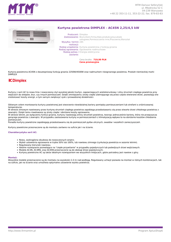 MTM Dariusz Seferyński ul. Młodnicka 52 C 04-239 Warszawa +48 22 353-11-11, 353-22-22, fax. 879-83-83 Kurtyna powietrzna DIMPLEX - AC45N 2,25/4,5 kW Producent: Dimplex Zastosowanie: Biuro,Dom,Firma,Hala produkcyjna,Lokale usługowe,Pomieszczenia inne,Pracownia,Warsztat Wysyłka / termin 24h realizacji: Rodzaj urządzenia: Kurtyna powietrzna z funkcją grzania Rodzaj ogrzewania: Ogrzewanie nadmuchowe Rodzaj paliwa / Energia elektryczna zasilanie: Cena brutto: 719,99 PLN Cena promocyjna Kurtyna powietrzna AC45N z dwustopniową funkcją grzania 2250W/4500W oraz nadmuchem nieogrzanego powietrza. Produkt niemieckiej marki DIMPLEX Kurtyny z serii AC to nowa linia i nowoczesny styl wysokiej jakości kurtyn, zapewniających wielokierunkowy i silny strumień ciepłego powietrza przy wejściach do sklepów, biur, czy innych pomieszczeń. Dzięki zmniejszeniu utraty ciepła ulatniającego się przez często otwierane drzwi, pozwalają one zredukować koszty energii, a tym samym zwiększyć zysk z prowadzonej działalności. Głównym celem montowania kurtyny powietrznej jest stworzenie niewidzialnej bariery pomiędzy pomieszczeniami lub strefami o zróżnicowanej temperaturze. W okresie zimowym nawiewany przez kurtynę strumień ciepłego powietrza zapobiega przedostawaniu się przez otwarte drzwi chłodnego powietrza z zewnątrz. Dzięki temu niwelowane są straty ciepła i obniżane koszty ogrzewania. W okresie letnim, po wyłączeniu funkcji grzania, kurtyny nawiewają zimny strumień powietrza, tworząc jednocześnie barierę, która nie przepuszcza gorącego powietrza z zewnątrz. W przypadku zastosowania kurtyny w pomieszczeniach z klimatyzacją wpływa to na obniżenie kosztów chłodzenia pomieszczeń. Ponadto kurtyny powietrzne zapobiegają przedostawaniu się do pomieszczeń pyłów ulicznych, owadów i wszelkich zanieczyszczeń. Kurtyny powietrzne przeznaczone są do montażu zarówno na suficie jak i na ścianie. Charakterystyka serii AC: Nowa, zaokrąglona obudowa do nowoczesnych wnętrz. Wybór ustawienia ogrzewania w trybie 50% lub 100%, lub nawiewu zimnego (cyrkulacja powietrza w sezonie letnim). Regulowany kierunek nawiewu. Idealne rozwiązanie pozwalające na "ciepłe przywitanie" w przypadku pojedynczych lub podwójnych drzwi wejściowych. Modele AC3N, AC3RN, oraz AC45N przeznaczone są do obsługi drzwi pojedynczych. Kurtyny powietrzne AC są także idealnym rozwiązaniem we wszystkich miejscach, gdzie potrzebny jest nawiew z góry. Montaż: Wszystkie modele przeznaczone są do montażu na wysokości 2,3 m nad podłogą. Regulowany uchwyt pozwala na montaż w różnych kombinacjach, tak na suficie, jak na ścianie oraz umożliwia optymalne ustawienie wylotu powietrza. http://www.firmamtm.pl Program AptusShop6 MTM Dariusz Seferyński ul. Młodnicka 52 C 04-239 Warszawa +48 22 353-11-11, 353-22-22, fax. 879-83-83 Budowa/wykończenie: Obudowa z tłoczonej stali z nakładkami z żaroodpornego plastiku w trwałym kolorze białym z kontrastującymi przełącznikami. Podłączenie do sieci elektrycznej: Urządzenie dostarczone jest bez przewodów zasilających. Przewody należy dobrać wg indywidualnych zapotrzebowań użytkownika. Gwarancja producenta: 3 lata. Zalety urządzenia: Dwustopniowy przełącznik mocy nagrzewnicy. Zimny nadmuch. Regulowany kierunek nawiewu. Możliwy montaż ścienny i sufitowy. Model przeznaczony do obsługi drzwi pojedynczych. http://www.firmamtm.pl Program AptusShop6 MTM Dariusz Seferyński ul. Młodnicka 52 C 04-239 Warszawa +48 22 353-11-11, 353-22-22, fax. 879-83-83 Dane techniczne Moc grzewcza: Pobór prądu: Napięcie: Długość: Wysokość: Głębokość: Masa: Przepływ powietrza max.: Wysokość montażu max.: Poziom hałasu: http://www.firmamtm.pl Powered by TCPDF (www.tcpdf.org) 2,25/4,5 kW. 19 A. 240V / ~1PN. 605 mm. 214 mm. 135 mm. 5,2 kg. 248 m3/h. 2,3 m. 52 dB Program AptusShop6