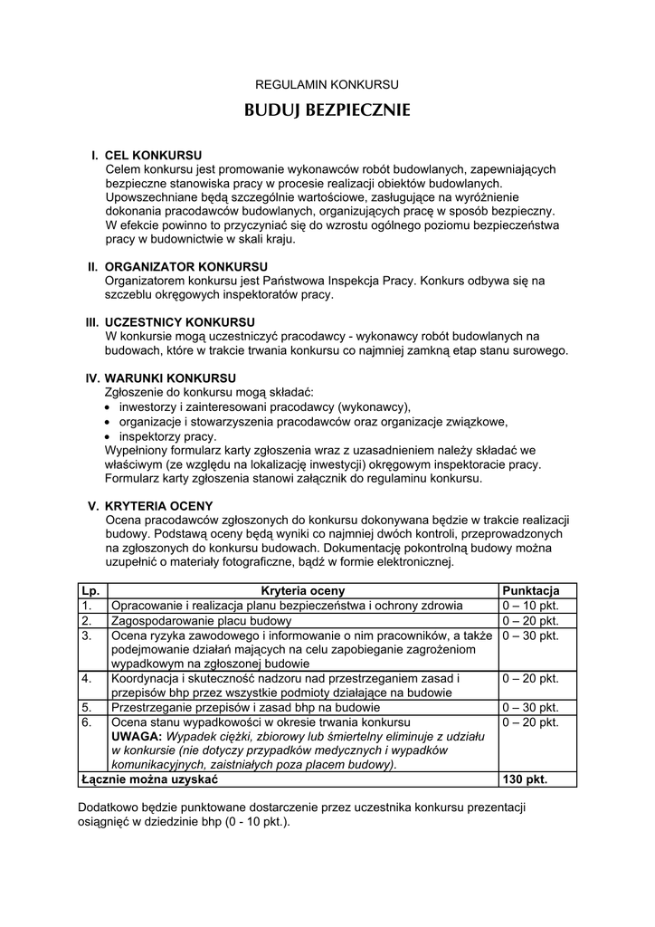 REGULAMIN KONKURSU BUDUJ BEZPIECZNIE I. CEL KONKURSU Celem konkursu jest promowanie wykonawców robót budowlanych, zapewniających bezpieczne stanowiska pracy w procesie realizacji obiektów budowlanych. Upowszechniane będą szczególnie wartościowe, zasługujące na wyróżnienie dokonania pracodawców budowlanych, organizujących pracę w sposób bezpieczny. W efekcie powinno to przyczyniać się do wzrostu ogólnego poziomu bezpieczeństwa pracy w budownictwie w skali kraju. II. ORGANIZATOR KONKURSU Organizatorem konkursu jest Państwowa Inspekcja Pracy. Konkurs odbywa się na szczeblu okręgowych inspektoratów pracy. III. UCZESTNICY KONKURSU W konkursie mogą uczestniczyć pracodawcy - wykonawcy robót budowlanych na budowach, które w trakcie trwania konkursu co najmniej zamkną etap stanu surowego. IV. WARUNKI KONKURSU Zgłoszenie do konkursu mogą składać: • inwestorzy i zainteresowani pracodawcy (wykonawcy), • organizacje i stowarzyszenia pracodawców oraz organizacje związkowe, • inspektorzy pracy. Wypełniony formularz karty zgłoszenia wraz z uzasadnieniem należy składać we właściwym (ze względu na lokalizację inwestycji) okręgowym inspektoracie pracy. Formularz karty zgłoszenia stanowi załącznik do regulaminu konkursu. V. KRYTERIA OCENY Ocena pracodawców zgłoszonych do konkursu dokonywana będzie w trakcie realizacji budowy. Podstawą oceny będą wyniki co najmniej dwóch kontroli, przeprowadzonych na zgłoszonych do konkursu budowach. Dokumentację pokontrolną budowy można uzupełnić o materiały fotograficzne, bądź w formie elektronicznej. Lp. Kryteria oceny 1. Opracowanie i realizacja planu bezpieczeństwa i ochrony zdrowia 2. Zagospodarowanie placu budowy 3. Ocena ryzyka zawodowego i informowanie o nim pracowników, a także podejmowanie działań mających na celu zapobieganie zagrożeniom wypadkowym na zgłoszonej budowie 4. Koordynacja i skuteczność nadzoru nad przestrzeganiem zasad i przepisów bhp przez wszystkie podmioty działające na budowie 5. Przestrzeganie przepisów i zasad bhp na budowie 6. Ocena stanu wypadkowości w okresie trwania konkursu UWAGA: Wypadek ciężki, zbiorowy lub śmiertelny eliminuje z udziału w konkursie (nie dotyczy przypadków medycznych i wypadków komunikacyjnych, zaistniałych poza placem budowy). Łącznie można uzyskać Punktacja 0 – 10 pkt. 0 – 20 pkt. 0 – 30 pkt. 0 – 20 pkt. 0 – 30 pkt. 0 – 20 pkt. 130 pkt. Dodatkowo będzie punktowane dostarczenie przez uczestnika konkursu prezentacji osiągnięć w dziedzinie bhp (0 - 10 pkt.). VI. ORGANIZACJA KONKURSU Konkurs odbywa się na szczeblu okręgowych inspektoratów pracy. Corocznie zgłoszenia do konkursu powinny być kierowane do dnia 30 czerwca do okręgowych inspektoratów pracy. Okręgowy inspektor pracy powołuje komisję konkursową, w której skład wchodzą: Zastępca OIP ds. nadzoru, jako jej przewodniczy oraz przedstawiciele: Związku Zawodowego Budowlani, Sekcji Budownictwa NSZZ „Solidarność”, Komisji ds. bezpieczeństwa pracy w budownictwie, przedstawiciele innych organizacji branżowych (jeśli taka działa przy okręgowym inspektoracie pracy), kierownik sekcji prewencji i promocji, nadinspektor koordynujący kontrole w zakładach prowadzących działalność budowlaną. Komisja konkursowa dokonuje oceny kandydatów i przedstawia okręgowemu inspektorowi pracy wnioski dot. nagród. Główny Inspektor Pracy na wniosek okręgowego inspektora pracy może podjąć decyzję o przyznaniu szczególnych nagród i wyróżnień laureatom szczebla regionalnego. VII. NAGRODY Corocznie do 30 listopada komisje konkursowe wyłaniają laureatów konkursu, którym przyznają I, II i III nagrodę. Laureatem konkursu może zostać wykonawca budowy, którą oceniono na co najmniej 90 punktów. Nagrody mają charakter honorowy. VIII. INFORMACJE KOŃCOWE 1. Wszystkim zainteresowanym podmiotom budowlanym okręgowe inspektoraty pracy udostępnią regulamin konkursu oraz wzór karty zgłoszenia, które dostępne są również na stronie internetowej www.pip.gov.pl. 2. Ciekawe rozwiązania wprowadzane przez nagrodzonych mogą zostać wykorzystane w celach szkoleniowych oraz opublikowane w czasopismach Państwowej Inspekcji Pracy. 3. Uczestnicy konkursu winni złożyć oświadczenie o wyrażeniu zgody na wykorzystanie danych osobowych i firmowych do celów promocji ochrony pracy (zgodnie z ustawą o ochronie danych osobowych). 4. Organizator zastrzega sobie prawo weryfikacji materiałów zgłoszeniowych (zgłoszeń i materiałów faktograficznych) ze stanem faktycznym zakładu pracy. 5. Informacje o konkursie, a także o jego wynikach będą podawane do publicznej wiadomości za pośrednictwem środków masowego przekazu oraz w Internecie. Załącznik nr 1: Karta zgłoszenia Załącznik nr 1 do regulaminu konkursu BUDUJ BEZPIECZNIE KARTA ZGŁOSZENIA 1 Wykonawca – nazwa i adres 2 Nazwa i adres budowy 3 Podwykonawcy – nazwy, adresy, telefony 4 Zgoda wykonawcy Wyrażam zgodę na udział w konkursie „BUDUJ BEZPIECZNIE” oraz na przetwarzanie moich danych osobowych do celów konkursu zgodnie z ustawą o ochronie danych osobowych*. Data.......................................... 5 Wnioskodawca 6 Podpis................................................. Uzasadnienie wnioskodawcy * Ustawa o ochronie danych osobowych z dnia 29.08.1997 r. (Dz. U. nr 101 poz. 926)