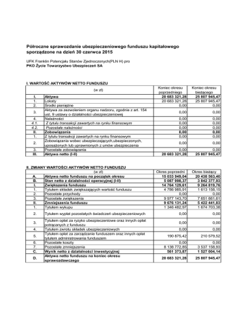 Półroczne sprawozdanie ubezpieczeniowego funduszu kapitałowego sporządzone na dzień 30 czerwca 2015 UFK Franklin Potencjału Stanów Zjednoczonych(PLN H) pro PKO Życie Towarzystwo Ubezpieczeń SA UFK Franklin Potencjału Stanów Zjednoczonych(PLN I. WARTOŚĆ AKTYWÓW NETTO FUNDUSZU (w zł) I. 1. 2. 3. 4. 4.1. 4.2. II. 1. 2. 3. III. Aktywa Lokaty Środki pieniężne Aktywa za zezwoleniem organu nadzoru, zgodnie z art. 154 ust. 9 ustawy o działalności ubezpieczeniowej Należności Z tytułu transakcji zawartych na rynku finansowym Pozostałe należności Zobowiązania Z tytułu transakcji zawartych na rynku finansowym Zobowiązania wobec ubezpieczających,ubezpieczonych, uposażonych lub uprawnionych z umów ubezpieczenia Pozostałe zobowiązania Aktywa netto (I-II) II. ZMIANY WARTOŚCI AKTYWÓW NETTO FUNDUSZU (w zł) A. Aktywa netto funduszu na początek okresu B. Stan netto z działalności operacyjnej (I-II) I. Zwiększenia funduszu 1. Tytułem składek zwiększających wartość funduszu Pozostałe przychody 2. 3. Pozostałe zwiększenia II. Zmniejszenia funduszu 1. Tytułem wykupu 2. 3. 4. 5. 6. 7. C. D. Tytułem wypłat pozostałych świadczeń ubezpieczeniowych Tytułem opłat za ryzyko ubezpieczeniowe oraz innych opłat potrącanych z funduszu Tytułem zwrotu składek ubezpieczeniowych Tytułem opłat za zarządzanie funduszem oraz innych opłat tytułem administrowania funduszem Pozostałe koszty Pozostałe zmniejszenia Wynik netto z działalności inwestycyjnej Aktywa netto funduszu na koniec okresu sprawozdawczego Koniec okresu poprzedniego 20 683 321,28 20 683 321,28 0,00 Koniec okresu bieżącego 25 807 945,47 25 807 945,47 0,00 0,00 0,00 0,00 0,00 0,00 0,00 0,00 0,00 0,00 0,00 0,00 0,00 0,00 0,00 0,00 20 683 321,28 0,00 25 807 945,47 Okres poprzedni 15 033 949,04 5 087 998,37 14 764 129,61 4 786 985,91 0,00 9 977 143,70 9 676 131,24 1 346 482,97 Okres bieżący 20 438 563,40 3 842 377,93 9 264 819,76 1 613 158,15 0,00 7 651 661,61 5 422 441,83 1 674 703,38 0,00 0,00 0,00 0,00 0,00 0,00 190 875,42 210 579,52 0,00 8 138 772,85 561 373,87 0,00 3 537 158,93 1 527 004,14 20 683 321,28 25 807 945,47 III. LICZBA I WARTOŚĆ JEDNOSTEK ROZRACHUNKOWYCH Pozycja 1. Liczba jednostek rozrachunkowych: liczba jednostek rozrachunkowych na początek okresu 1.1 sprawozdawczego liczba jednostek rozrachunkowych na koniec okresu 1.2 sprawozdawczego 2. Wartość jednostki rozrachunkowej: wartość jednostki rozrachunkowej na początek okresu 2.1 sprawozdawczego minimalna wartość jednostki rozrachunkowej w okresie 2.2 sprawozdawczym maksymalna wartość jednostki rozrachunkowej w okresie 2.3 sprawozdawczym wartość jednostki rozliczeniowej na koniec okresu 2.4 sprawozdawczego Okres poprzedni Okres bieżący 778 154,7122 973 264,9238 1 031 587,0963 1 137 414,9612 19,32 21,00 18,04 20,31 20,40 23,43 20,05 22,69 IV. ZESTAWIENIE AKTYWÓW NETTO FUNDUSZU - półroczne Udział w aktywach netto funduszu (w %) 2 3 25 807 945,47 100,00% Wartość bilansowa (w zł) 1 I. Lokaty (suma 1-12) 1. Papiery wartościowe emitowane, poręczone lub gwarantowane przez Skarb Państwa lub organizacje międzynarodowe, których członkiem jest Rzeczpospolita Polska 2. 3. 4. 5. 6. 7. 8. 9. 10. 11. 12. Obligacje emitowane lub poręczone przez jednostki samorządu terytorialnego lub związki jednostek samorządu terytorialnego Inne dłużne papiery wartościowe o stałej stopie dochodu Akcje Udziały Jednostki uczestnictwa i certyfikaty inwestycyjne w funduszach inwestycyjnych Instrumenty pochodne, o ile służą zmniejszeniu ryzyka związanego z innymi aktywami stanowiącymi pokrycie rezerw techniczno-ubezpieczeniowych Inne papiery wartościowe o zmiennej kwocie dochodu Pożyczki Nieruchomości Depozyty bankowe Pozostałe lokaty II. Aktywa za zezwoleniem organu nadzoru, zgodnie z art. 154 ust. 9 ustawy o działalności ubezpieczeniowej III. IV. V. VI. 1 2 3 Środki pieniężne Należności Zobowiązania Aktywa netto (w tym) krajowe zagraniczne - kraje UE zagraniczne - kraje poza UE 0,00 0,00% 0,00 0,00% 0,00 0,00 0,00 0,00% 0,00% 0,00% 25 807 945,47 100,00% 0,00 0,00% 0,00 0,00 0,00 0,00 0,00 0,00% 0,00% 0,00% 0,00% 0,00% 0,00 0,00% 0,00 0,00 0,00 25 807 945,47 0,00 25 807 945,47 0,00 0,00% 0,00% 0,00% 100,00% 0,00% 100,00% 0,00%