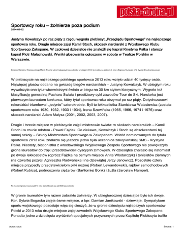 Sportowcy roku – żołnierze poza podium 2014-01-12 Justyna Kowalczyk po raz piąty z rzędu wygrała plebiscyt „Przeglądu Sportowego” na najlepszego sportowca roku. Drugie miejsce zajął Kamil Stoch, skoczek narciarski z Wojskowego Klubu Sportowego Zakopane. W czołowej dziesiątce nie znaleźli się kapral Krystyna Pałka i starszy kapral Piotr Małachowski. Wyniki głosowania ogłoszono w sobotę w Teatrze Polskim w Warszawie. Dyrektor Maratonu Warszawskiego Marek Tronina wśród najlepszych zawodników w kategorii M-40 (w środku na podium st. chor. Zbigniew Murawski z 12 Dywizji Zmechanizowanej) W plebiscycie na najlepszego polskiego sportowca 2013 roku wzięło udział 40 tysięcy osób. Najwięcej głosów oddano na gwiazdę biegów narciarskich – Justynę Kowalczyk. W ubiegłym roku wywalczyła ona tytuł wicemistrzyni świata w biegu na 30 km stylem klasycznym. Wygrała też klasyfikację generalną Pucharu Świata i prestiżowy cykl zawodów Tour de Ski. Narciarka jest pierwszym laureatem konkursu, który tytuł sportowca roku otrzymał po raz piąty. Dotychczasowi rekordziści triumfowali „jedynie” czterokrotnie. Byli to lekkoatletka Stanisława Walasiewicz (została sportowcem roku 1930, 1932, 1933 i 1934), Irena Szewińska (1965, 1966, 1974 i 1976) oraz skoczek narciarski Adam Małysz (2001, 2002, 2003, 2007). Drugie i trzecie miejsce w plebiscycie zajęli mistrzowie świata: w skokach narciarskich – Kamil Stoch i w rzucie młotem - Paweł Fajdek. Co ciekawe, Kowalczyk i Stoch są absolwentami tej samej szkoły – Szkoły Mistrzostwa Sportowego w Zakopanem. Wśród nominowanych do tytułu sportowca 2013 roku znalazła się jeszcze jedna była uczennica zakopiańskiej SMS - Krystyna Pałka. Niestety, biatlonistka z wrocławskiego Wojskowego Zespołu Sportowego nie powiększyła grona laureatów do trójki przedstawicieli dyscyplin zimowych. W dziesiątce znalazło się natomiast po dwoje lekkoatletów (oprócz Fajdka na ósmym miejscu Anita Włodarczyk) i tenisistów ziemnych (na czwartej pozycji Agnieszka Radwańska i na dziewiątej Jerzy Janowicz). Pozostałe cztery miejsca przypadły przedstawicielom piłki nożnej (Robert Lewandowski), rajdów samochodowych (Robert Kubica), podnoszenia ciężarów (Bartłomiej Bonk) i żużla (Jarosław Hampel). Na mecie imprezy masowej 2013 roku zameldowało się aż 8509 zawodników W gronie laureatów tym razem zabrakło żołnierzy. W ubiegłorocznej dziesiątce było ich dwoje. Kpr. Sylwia Bogacka zajęła ósme miejsce, a kpr. Damian Janikowski - dziewiąte. Sympatykom sportu wojskowego pozostaje więc się cieszyć, że w gronie dziesięciu najlepszych sportowców Polski w 2013 roku drugie miejsce zajął zawodnik Wojskowego Klubu Sportowego Zakopane. Ponadto jedno z dziesięciu wyróżnień specjalnych przyznanych przez Kapitułę Plebiscytu trafiło Autor: szus Strona: 1 do rąk byłego żołnierza zawodowego. Ambasadorem Polskiego Sportu wybrano bowiem chor. rez. Czesława Langa, dyrektora Wyścigu Dookoła Polski. Przed laty był on znakomitym kolarzem warszawskiej Legii (był m.in. wicemistrzem olimpijskim w wyścigu ze startu wspólnego z 1980 roku). Lang w 2013 roku znakomicie zorganizował 70. edycję Tour de Pologne. Dyrektorem wyścigu, który przez fachowców uznawany jest za trzecią po Tour de France i Giro-Italia, wieloetapową imprezę kolarską na świecie, jest od 20 lat. Z kolei Julian Gozdowski zdobył statuetkę czempiona w kategorii Animator Sportu Masowego. Legenda polskich biegów narciarskich, twórca tras na Polanie Jakuszyckiej, statuetkę odbierał już cztery lata temu. Wówczas za najlepszą imprezę masową 2008 roku – Bieg Piastów. Gozdowski jest jego pomysłodawcą i organizatorem od 1976 roku. Zdobywca statuetki ASM nie raz sam wręczał nagrody najlepszym żołnierzom, którzy w ramach Biegu Piastów rywalizowali o zwycięstwo w Międzynarodowym Biegu Żołnierskim. Wśród wręczających statuetki czempionów gwiazd polskiego sportu byli również sportowcy, którzy zwyciężali w Plebiscycie na Najlepszego Sportowca Wojska Polskiego. Nagrodę dla Trenera Roku wręczył żonie trenera Łukasza Kruczka – Agacie, mistrz świata w trójskoku z 1983 roku Zdzisław Hoffmann (w 1983 r. kpr. Zdzisław Hoffmann otrzymał najwięcej głosów od czytelników „Żołnierza Wolności” i wygrał 7. Plebiscyt na Najlepszego Sportowca Wojska Polskiego). Natomiast czempiona dla najlepszego sportowca niepełnosprawnego Mateusza Michalskiego wręczył Robert Korzeniowski, czterokrotny mistrz olimpijski, trzykrotny mistrz świata i dwukrotny mistrz Europy w chodzie sportowym. Były pracownik wojska Wojskowego Ośrodka Szkolenia Sportowego Krakowskiego Okręgu Wojskowego wygrał Plebiscyt „Polski Zbrojnej” na Najlepszego Sportowca Wojska Polskiego w 1997, 2000, 2001, 2003 i 2004 roku. Wiceprezes Wojskowego Klubu Biegacza Meta Lubliniec st. chor. sztab. Zbigniew Rosiński, który od ponad 30 lat głosuje w plebiscycie „Przeglądu Sportowego”, nie krył zdziwienia, że w pierwszej dziesiątce najlepszych sportowców Polski w 2013 roku nie znaleźli się wicemistrzowie świata w biatlonie i rzucie dyskiem. – Starszy kapral Małachowski byłby trzecim lekkoatletą wśród laureatów, a kapral Pałka trzecią przedstawicielką dyscyplin zimowych. Szkoda, że biorący udział w głosowaniu nie docenili żołnierzy. Żal mi zwłaszcza naszej biatlonistki i tego, że wśród głosujących nie było zbyt wielu sympatyków biatlonu. Może się wydawać, że ta dyscyplina jest u nas popularna, ale fakt, iż TVP nie popularyzuje tego sportu tak jak biegi narciarskie kobiet i skoki narciarskie – mówi wiceprezes Mety. Działacz lublinieckiego klubu był z kolei zadowolony wyborem Kapituły Plebiscytu w kategorii Impreza Masowa Roku. – Bardzo się cieszę, że wyróżniono Maraton Warszawski i jego dyrektora Marka Troninę, który podziękował również zawodnikom ratującym tę imprezę w t