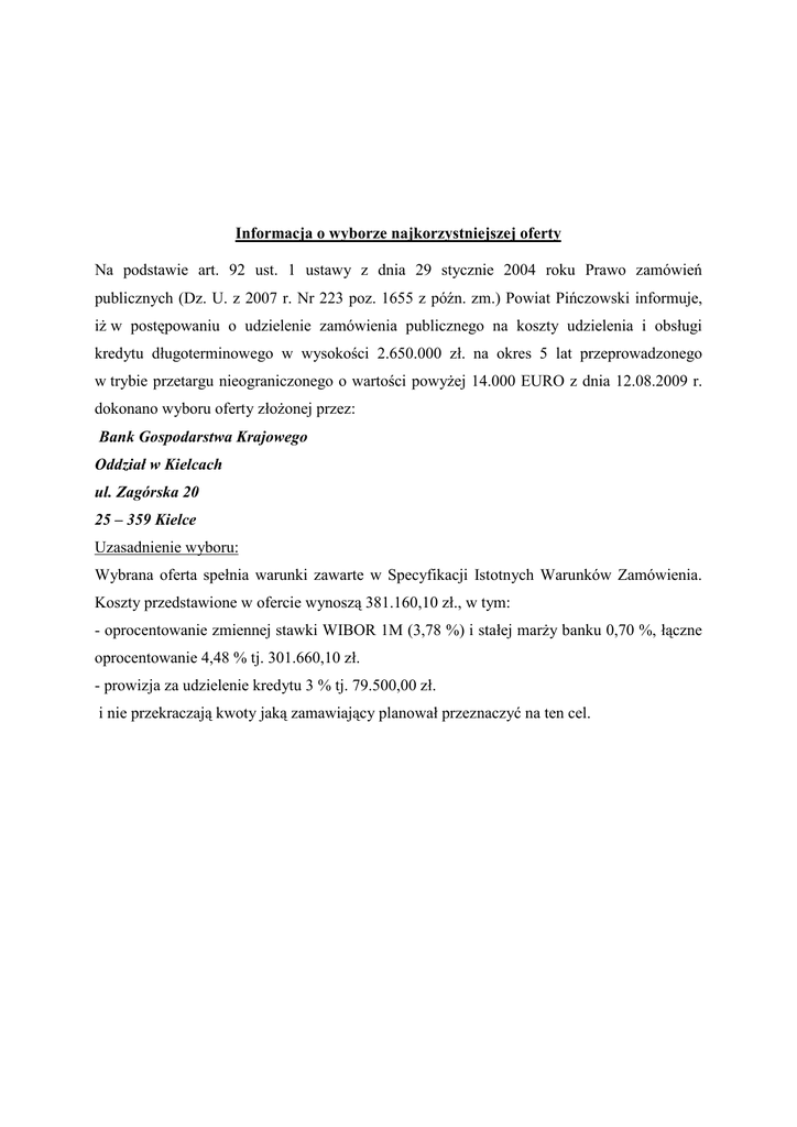 Informacja o wyborze najkorzystniejszej oferty Na podstawie art. 92 ust. 1 ustawy z dnia 29 stycznie 2004 roku Prawo zamówień publicznych (Dz. U. z 2007 r. Nr 223 poz. 1655 z późn. zm.) Powiat Pińczowski informuje, iż w postępowaniu o udzielenie zamówienia publicznego na koszty udzielenia i obsługi kredytu długoterminowego w wysokości 2.650.000 zł. na okres 5 lat przeprowadzonego w trybie przetargu nieograniczonego o wartości powyżej 14.000 EURO z dnia 12.08.2009 r. dokonano wyboru oferty złożonej przez: Bank Gospodarstwa Krajowego Oddział w Kielcach ul. Zagórska 20 25 – 359 Kielce Uzasadnienie wyboru: Wybrana oferta spełnia warunki zawarte w Specyfikacji Istotnych Warunków Zamówienia. Koszty przedstawione w ofercie wynoszą 381.160,10 zł., w tym: - oprocentowanie zmiennej stawki WIBOR 1M (3,78 %) i stałej marży banku 0,70 %, łączne oprocentowanie 4,48 % tj. 301.660,10 zł. - prowizja za udzielenie kredytu 3 % tj. 79.500,00 zł. i nie przekraczają kwoty jaką zamawiający planował przeznaczyć na ten cel. Zestawienie ofert na udzielenie kredytu długoterminowego Lp. kryterium Oferta Nr 1 Oferta Nr 2 Oferta Nr 3 ING Bank Śląski BGK BS Oddział w Kielcach Oddział w Kielcach Pińczów Oferta Nr 4 BOŚ Oddział w Częstochowie 1. Kwota kredytu 2.650.000,00 2.650.000,00 2.650.000,00 2.650.000,00 2. Okres spłaty kredytu 60 miesięcy 60 miesięcy 60 miesięcy 60 miesięcy 3. Oprocentowanie kredytu 5,67 % 4,48 % 7,28 % 6,61 % a) WIBOR-1M na dzień 30 czerwca 2009 r. 3,78 % 3,78 % 3,78 % 3,78 % b) marża banku 1,89 % 0,70 % 3,50 % 2,83 % 381.572,20 301.660,10 483.092,87 445.111,01 0,30 % (7.950) 3% (79.500) 0,50 % (13.250) 393.723,20 381.160,10 496.342,87 w tym: 4. Odsetki za 5-letni okres kredytowania 5. Otwarcie rachunku 6. Prowizja za prowadzenie rachunku 70zł./m-c (70 zł. x 60 m-cy =4.200) 7. Prowizja za rozpatrzenie wniosku 8. Prowizja za 1 przelew 9. Prowizja od wypłaty kredytu w formie bezgotówkowej 10. Prowizja za udzielenie kredytu 11. Koszty wyciągów bankowych wysyłanych drogą pocztową 12. Koszty ustanowienia prawnego zabezpieczenia kredytu 13. Koszty przelewu między rachunkami kredytobiorcy w banku 1,00 Razem: 445.111,01