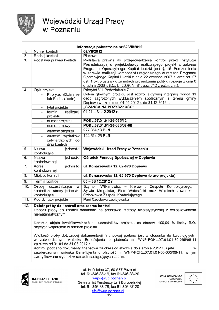 Wojewódzki Urząd Pracy w Poznaniu 1. 2. 3. 4. Informacja pokontrolna nr 62/VII/2012 62/VII/2012 Planowa Podstawą prawną do przeprowadzenia kontroli przez Instytucję Pośredniczącą u projektodawcy realizującego projekt z zakresu Programu Operacyjnego Kapitał Ludzki jest § 15 Porozumienia w sprawie realizacji komponentu regionalnego w ramach Programu Operacyjnego Kapitał Ludzki z dnia 22 czerwca 2007 r. oraz art. 27 ust. 1 pkt 5 ustawy o zasadach prowadzenia polityki rozwoju z dnia 6 grudnia 2006 r. (Dz. U. 2009, Nr 84, poz. 712 z późn. zm.). Opis projektu Priorytet VII, Poddziałanie 7.1.1 − Priorytet (Działanie Celem głównym projektu jest rozwój aktywnej integracji wśród 11 osób zagrożonych wykluczeniem społecznym z terenu gminy lub Poddziałanie) Dopiewo w okresie od 01.01.2012 r. do 31.12.2012 r. „SZANSA NA PRZYSZŁOŚĆ” − tytuł projektu − termin realizacji 01.01 – 31.12.2012 r. projektu POKL.07.01.01-30-065/12 − numer projektu POKL.07.01.01-30-065/08-00 − numer umowy 227 356,13 PLN − wartość projektu Numer kontroli Rodzaj kontroli Podstawa prawna kontroli − 5. 6. 7. 8. 9. 10. 11. 12. wartość wydatków zatwierdzonych do dnia kontroli Nazwa jednostki kontrolującej Nazwa jednostki kontrolowanej Adres jednostki kontrolowanej Miejsce kontroli 124 514,25 PLN Termin kontroli Osoby uczestniczące w kontroli ze strony jednostki kontrolującej Koordynator projektu 05 – 06.12.2012 r. Szymon Wilkanowicz – Kierownik Zespołu Kontrolującego, Sylwia Mrugalska, Piotr Walusiński oraz Wojciech Jaworski – Członkowie Zespołu Kontrolującego. Pani Czesława Leciejewska Wojewódzki Urząd Pracy w Poznaniu Ośrodek Pomocy Społecznej w Dopiewie ul. Konarzewska 12, 62-070 Dopiewo ul. Konarzewska 12, 62-070 Dopiewo (biuro projektu) Dobór próby do kontroli oraz zakres kontroli Doboru próby do kontroli dokonano na podstawie metody niestatystycznej z wnioskowaniem niematematycznym. Kontrolą objęto kwalifikowalność 11 uczestników projektu, co stanowi 100,00 % liczby B.O. objętych wsparciem w ramach projektu. Wielkość próby dotyczącej dokumentacji finansowej podana jest w stosunku do kwot ujętych w zatwierdzonym wniosku Beneficjenta o płatność nr WNP-POKL.07.01.01-30-065/08-11 za okres od 01.01 do 31.08.2012 r. Kontroli poddano dokumenty finansowe za okres od stycznia do sierpnia 2012 r., ujęte w zatwierdzonym wniosku Beneficjenta o płatność nr WNP-POKL.07.01.01-30-065/08-11, w tym zweryfikowano wydatki w ramach następujących zadań: ul. Kościelna 37, 60-537 Poznań tel. 61-846-38-19, fax 61-846-38-20 [email protected] Sekretariat Funduszy Unii Europejskiej tel. 61-846-38-78, fax 61-846-37-20 [email protected] 1/7 Zadanie 1 (Aktywna integracja): 16 150,00 PLN, Zadanie 2 (Pomoc celowa): 16 040,00 PLN, Zadanie 3 (Praca socjalna): 25 463,84 PLN, Zadanie 5 (Zarządzanie projektem): 3 272,26 PLN, Koszty pośrednie (rozliczane na podstawie rzeczywiście poniesionych wydatków): 7 719,12 PLN. 13. 14. Wskazany powyżej dobór próby do kontroli ma na celu zweryfikowanie czy Beneficjent prawidłowo realizuje działania związane z realizacją projektu: 1. Rozliczenia finansowe. 2. Zgodność danych przekazywanych we wnioskach o płatność w części dotyczącej postępu rzeczowego oraz postępu finansowego z dokumentacją dotyczącą realizacji projektu dostępną w biurze projektu. 3. Rekrutacja uczestników projektu. 4. Kwalifikowalność B.O. 5. Realizacja form wsparcia. 6. Sposób przetwarzania danych o uczestnikach projektu. 7. Działania promocyjne i informacyjne. 8. Prowadzenie i archiwizacja dokumentacji projektu. 9. Kwalifikowalność wydatków dotyczących personelu projektu. 10. Poprawność stosowania procedur przetargowych. 11. Poprawność stosowania zasady efektywnego zarządzania finansami. 12. Wdrożenie zaleceń pokontrolnych. Merytoryka projektu (w tym realizacja kryteriów dostępu oraz strategicznych) Beneficjent do dnia rozpoczęcia kontroli planowej nr 62/VII/2012 (tj. 05.12.2012 r.) złożył dwa wnioski o płatność za rok 2012, w których w częściach sprawozdawczych zgłaszał trudności związane z realizacją projektu (patrz załącznik nr 2, pkt 1.8). Ponadto, w okresie realizacji projektu systemowego w 2012 r., Projektodawca podpisał aneks nr POKL.07.01.01-30-065/08-06 do umowy ramowej nr POKL.07.01.01-30-065/08-00 (patrz załącznik nr 2, pkt 1.11) oraz wprowadził zmiany do wniosku o dofinansowanie projektu nr POKL.07.01.01-30-065/12 (patrz załącznik nr 2, pkt 1.7). Pracownicy Zespołu Kontrolującego stwierdzili, iż Beneficjent posiada Gminną Strategię Rozwiązywania Problemów Społecznych w latach 2006-2015. Realizacja kryteriów dostępu oraz strategicznych Beneficjent spełnił założone kryteria dostępu (patrz załącznik nr 2, pkt 1.13). Projekt nie zakłada realizacji kryteriów strategicznych. Ustalenia kontroli (zakres i opis kontrolowanych obszarów) Kontrola prawidłowości rozliczeń finansowych Beneficjent do dnia rozpoczęcia kontroli planowej nr 62/VII/2012 (tj. 05.12.2012 r.) złożył dwa wnioski o płatność za rok 2012, w terminie (patrz załącznik nr 2, pkt 4.27). Beneficjent przedstawił dokument poświadczający założenie dla potrzeb realizacji projektu rachunku bankowego (Poznański Bank Spółdzielczy, Oddział w Dopiewie, nr rachunku 08 9043 1012 3012 0026 7852 0003). Księgowość projektu prowadzona jest w formie pełnej – plan kont. Obsługą księgową projektu zajmuje się Pani Małgorzata Hetmańska, zatrudniona u Beneficjenta na stanowisku Starszego Inspektora ds. Księgowości. a) koszty bezpośrednie Skontrolowano wydatki w wysokości: 60 926,10 PLN – patrz załącznik nr 1 (wykaz skontrolowanych dokumentów księgowych w ramach projektu, pozycje nr od 1 do 37). b) koszty pośrednie Skontrolowano wydatki w wysokości: 7 719,12 PLN – patrz załącznik nr 1 (wykaz skontrolowanych dokumentów księgowych w ramach projektu, pozycje nr od 38 do 43). Pracownic