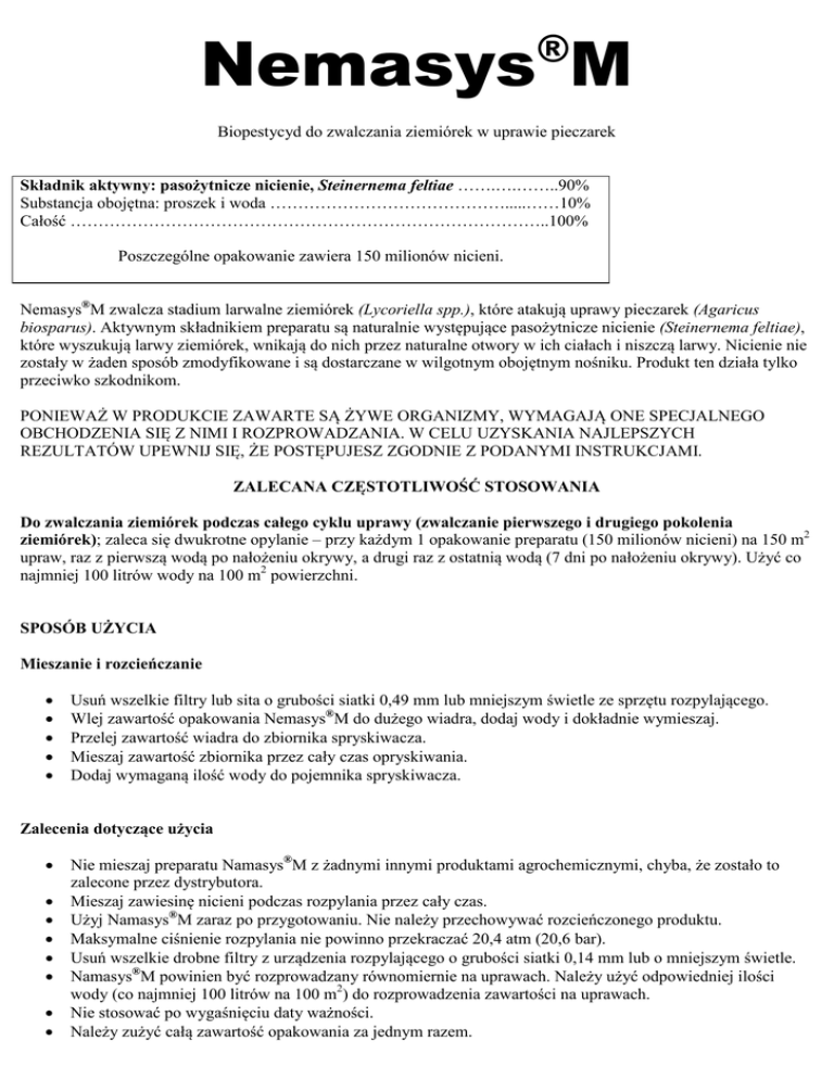 Nemasys M ® Biopestycyd do zwalczania ziemiórek w uprawie pieczarek Składnik aktywny: pasożytnicze nicienie, Steinernema feltiae …….….……..90% Substancja obojętna: proszek i woda …………………………………….....……10% Całość …………………………………………………………………………..100% Poszczególne opakowanie zawiera 150 milionów nicieni. Nemasys®M zwalcza stadium larwalne ziemiórek (Lycoriella spp.), które atakują uprawy pieczarek (Agaricus biosparus). Aktywnym składnikiem preparatu są naturalnie występujące pasożytnicze nicienie (Steinernema feltiae), które wyszukują larwy ziemiórek, wnikają do nich przez naturalne otwory w ich ciałach i niszczą larwy. Nicienie nie zostały w żaden sposób zmodyfikowane i są dostarczane w wilgotnym obojętnym nośniku. Produkt ten działa tylko przeciwko szkodnikom. PONIEWAŻ W PRODUKCIE ZAWARTE SĄ ŻYWE ORGANIZMY, WYMAGAJĄ ONE SPECJALNEGO OBCHODZENIA SIĘ Z NIMI I ROZPROWADZANIA. W CELU UZYSKANIA NAJLEPSZYCH REZULTATÓW UPEWNIJ SIĘ, ŻE POSTĘPUJESZ ZGODNIE Z PODANYMI INSTRUKCJAMI. ZALECANA CZĘSTOTLIWOŚĆ STOSOWANIA Do zwalczania ziemiórek podczas całego cyklu uprawy (zwalczanie pierwszego i drugiego pokolenia ziemiórek); zaleca się dwukrotne opylanie – przy każdym 1 opakowanie preparatu (150 milionów nicieni) na 150 m2 upraw, raz z pierwszą wodą po nałożeniu okrywy, a drugi raz z ostatnią wodą (7 dni po nałożeniu okrywy). Użyć co najmniej 100 litrów wody na 100 m2 powierzchni. SPOSÓB UŻYCIA Mieszanie i rozcieńczanie • • • • • Usuń wszelkie filtry lub sita o grubości siatki 0,49 mm lub mniejszym świetle ze sprzętu rozpylającego. Wlej zawartość opakowania Nemasys®M do dużego wiadra, dodaj wody i dokładnie wymieszaj. Przelej zawartość wiadra do zbiornika spryskiwacza. Mieszaj zawartość zbiornika przez cały czas opryskiwania. Dodaj wymaganą ilość wody do pojemnika spryskiwacza. Zalecenia dotyczące użycia • • • • • • • • Nie mieszaj preparatu Namasys®M z żadnymi innymi produktami agrochemicznymi, chyba, że zostało to zalecone przez dystrybutora. Mieszaj zawiesinę nicieni podczas rozpylania przez cały czas. Użyj Namasys®M zaraz po przygotowaniu. Nie należy przechowywać rozcieńczonego produktu. Maksymalne ciśnienie rozpylania nie powinno przekraczać 20,4 atm (20,6 bar). Usuń wszelkie drobne filtry z urządzenia rozpylającego o grubości siatki 0,14 mm lub o mniejszym świetle. Namasys®M powinien być rozprowadzany równomiernie na uprawach. Należy użyć odpowiedniej ilości wody (co najmniej 100 litrów na 100 m2) do rozprowadzenia zawartości na uprawach. Nie stosować po wygaśnięciu daty ważności. Należy zużyć całą zawartość opakowania za jednym razem. Przechowywanie i utylizacja Przechowywanie: Produkt ten może być przechowywany w lodówce (5˚C) do końca daty ważności. NIE ZAMRAŻAĆ. Nie wystawiać na działanie wysokich temperatur (powyżej 32˚C). Należy zużyć całą zawartość opakowania za jednym razem. Nie należy dzielić zawartości opakowania na mniejsze części, ponieważ każde opakowanie zawiera określoną ilość nicieni. Zawsze należy używać świeżo rozcieńczonego preparatu. Utylizacja: Opakowanie i nieużyty lub przeterminowany produkt mogą być utylizowane w każdym miejscu przeznaczonym do utylizacji, zgodnie ogólnokrajowymi lub lokalnymi przepisami. OŚWIADCZENIE DOTYCZĄCE GWARANCJI Firma BASF oświadcza, że niniejszy produkt jest zgodny z opisem na etykiecie i jest przeznaczony do celu określonego na etykiecie pod warunkiem ścisłego przestrzegania wskazań. Firma BASF odmawia jakichkolwiek gwarancji, wyrażonych jednoznacznie bądź domniemanych, w tym domniemanych gwarancji przydatności do sprzedaży i przydatności do celu innego, aniżeli określone na etykiecie. ODPOWIEDZIALNOŚĆ Firma BASF nie ponosi odpowiedzialności za szkody powstałe na skutek niewłaściwego użycia lub obchodzenia się z produktem. OGRANICZENIE ODPOWIEDZIALNOŚCI Nikt nie jest upoważniony do zmieniania lub uzupełniania, ustnie lub na piśmie, informacji zawartych na etykiecie. Firma BASF ani sprzedawca nie ponoszą odpowiedzialności za obrażenia ciała, uszkodzenia mienia ani straty, także uszkodzenie upraw czy brak skuteczności, spowodowane czynnikami leżącymi poza ich kontrolą, jak nieprzestrzeganie instrukcji przez użytkownika. Wyprodukowano przez: BASF www.agricentre.basf.co.uk Informacja w nagłych przypadkach (bezpłatny numer czynny całą dobę) Tel.: 00 49 180 2273112 Nemasys® jest zarejestrowanym znakiem handlowym firmy BASF.