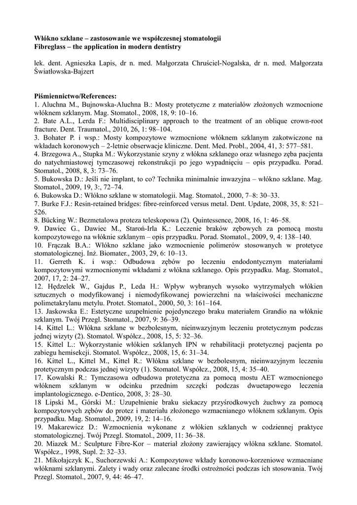 Włókno szklane – zastosowanie we współczesnej stomatologii Fibreglass – the application in modern dentistry lek. dent. Agnieszka Lapis, dr n. med. Małgorzata Chruściel-Nogalska, dr n. med. Małgorzata Światłowska-Bajzert Piśmiennictwo/References: 1. Aluchna M., Bujnowska-Aluchna B.: Mosty protetyczne z materiałów złożonych wzmocnione włóknem szklanym. Mag. Stomatol., 2008, 18, 9: 10–16. 2. Bate A.L., Lerda F.: Multidisciplinary approach to the treatment of an oblique crown-root fracture. Dent. Traumatol., 2010, 26, 1: 98–104. 3. Bohater P. i wsp.: Mosty kompozytowe wzmocnione włóknem szklanym zakotwiczone na wkładach koronowych – 2-letnie obserwacje kliniczne. Dent. Med. Probl., 2004, 41, 3: 577–581. 4. Brzegowa A., Stupka M.: Wykorzystanie szyny z włókna szklanego oraz własnego zęba pacjenta do natychmiastowej tymczasowej rekonstrukcji po jego wypadnięciu – opis przypadku. Porad. Stomatol., 2008, 8, 3: 73–76. 5. Bukowska D.: Jeśli nie implant, to co? Technika minimalnie inwazyjna – włókno szklane. Mag. Stomatol., 2009, 19, 3:, 72–74. 6. Bukowska D.: Włókno szklane w stomatologii. Mag. Stomatol., 2000, 7–8: 30–33. 7. Burke F.J.: Resin-retained bridges: fibre-reinforced versus metal. Dent. Update, 2008, 35, 8: 521– 526. 8. Bücking W.: Bezmetalowa proteza teleskopowa (2). Quintessence, 2008, 16, 1: 46–58. 9. Dawiec G., Dawiec M., Staroń-Irla K.: Leczenie braków zębowych za pomocą mostu kompozytowego na włóknie szklanym – opis przypadku. Porad. Stomatol., 2009, 9, 4: 138–140. 10. Frączak B.A.: Włókno szklane jako wzmocnienie polimerów stosowanych w protetyce stomatologicznej. Inż. Biomater., 2003, 29, 6: 10–13. 11. Gerreth K. i wsp.: Odbudowa zębów po leczeniu endodontycznym materiałami kompozytowymi wzmocnionymi wkładami z włókna szklanego. Opis przypadku. Mag. Stomatol., 2007, 17, 2: 24–27. 12. Hędzelek W., Gajdus P., Leda H.: Wpływ wybranych wysoko wytrzymałych włókien sztucznych o modyfikowanej i niemodyfikowanej powierzchni na właściwości mechaniczne polimetakrylanu metylu. Protet. Stomatol., 2000, 50, 3: 161–164. 13. Jaskowska E.: Estetyczne uzupełnienie pojedynczego braku materiałem Grandio na włóknie szklanym. Twój Przegl. Stomatol., 2007, 9: 36–39. 14. Kittel L.: Włókna szklane w bezbolesnym, nieinwazyjnym leczeniu protetycznym podczas jednej wizyty (2). Stomatol. Współcz., 2008, 15, 5: 32–36. 15. Kittel L.: Wykorzystanie włókien szklanych IPN w rehabilitacji protetycznej pacjenta po zabiegu hemisekcji. Stomatol. Współcz., 2008, 15, 6: 31–34. 16. Kittel L., Kittel M., Kittel R.: Włókna szklane w bezbolesnym, nieinwazyjnym leczeniu protetycznym podczas jednej wizyty (1). Stomatol. Współcz., 2008, 15, 4: 35–40. 17. Kowalski R.: Tymczasowa odbudowa protetyczna za pomocą mostu AET wzmocnionego włóknem szklanym w odcinku przednim szczęki podczas dwuetapowego leczenia implantologicznego. e-Dentico, 2008, 3: 28–30. 18 Lipski M., Górski M.: Uzupełnienie braku siekaczy przyśrodkowych żuchwy za pomocą kompozytowych zębów do protez i materiału złożonego wzmacnianego włóknem szklanym. Opis przypadku. Mag. Stomatol., 2009, 19, 2: 14–16. 19. Makarewicz D.: Wzmocnienia wykonane z włókien szklanych w codziennej praktyce stomatologicznej. Twój Przegl. Stomatol., 2009, 11: 36–38. 20. Miazek M.: Sculpture Fibre-Kor – materiał złożony zawierający włókna szklane. Stomatol. Współcz., 1998, Supl. 2: 32–33. 21. Mikołajczyk K., Suchorzewski A.: Kompozytowe wkłady koronowo-korzeniowe wzmacniane włóknami szklanymi. Zalety i wady oraz zalecane środki ostrożności podczas ich stosowania. Twój Przegl. Stomatol., 2007, 9, 44: 46–47. 22. Pilich J.: Tymczasowe zaopatrzenie poekstrakcyjnego braku zęba pojedynczego z zastosowaniem włókna szklanego. Opis przypadku. Mag. Stomatol., 2008, 18, 2: 36–38. 23. Raszewski Z.: Zastosowanie włókien szklanych w stomatologii. Część I – włókna i maty szklane. Twój Prz. Stomatol., 2008, 7/8: 41–42. 24. Staroń-Irla K., Dawiec M., Dawiec G.: Odbudowa korony zęba 22 z użyciem wkładu z włókna szklanego. Twój Prz. Stomatol., 2008, 10: 44–45.