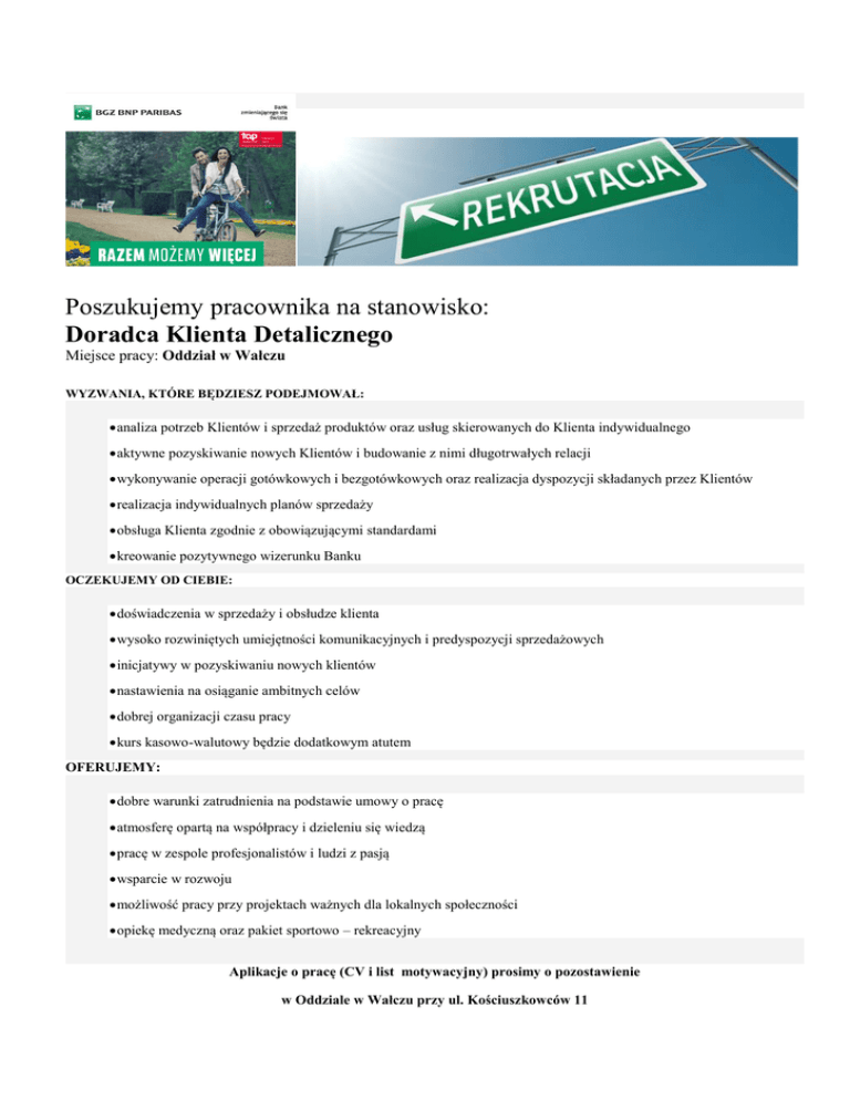 Poszukujemy pracownika na stanowisko: Doradca Klienta Detalicznego Miejsce pracy: Oddział w Wałczu WYZWANIA, KTÓRE BĘDZIESZ PODEJMOWAŁ: analiza potrzeb Klientów i sprzedaż produktów oraz usług skierowanych do Klienta indywidualnego aktywne pozyskiwanie nowych Klientów i budowanie z nimi długotrwałych relacji wykonywanie operacji gotówkowych i bezgotówkowych oraz realizacja dyspozycji składanych przez Klientów realizacja indywidualnych planów sprzedaży obsługa Klienta zgodnie z obowiązującymi standardami kreowanie pozytywnego wizerunku Banku OCZEKUJEMY OD CIEBIE: doświadczenia w sprzedaży i obsłudze klienta wysoko rozwiniętych umiejętności komunikacyjnych i predyspozycji sprzedażowych inicjatywy w pozyskiwaniu nowych klientów nastawienia na osiąganie ambitnych celów dobrej organizacji czasu pracy kurs kasowo-walutowy będzie dodatkowym atutem OFERUJEMY: dobre warunki zatrudnienia na podstawie umowy o pracę atmosferę opartą na współpracy i dzieleniu się wiedzą pracę w zespole profesjonalistów i ludzi z pasją wsparcie w rozwoju możliwość pracy przy projektach ważnych dla lokalnych społeczności opiekę medyczną oraz pakiet sportowo – rekreacyjny Aplikacje o pracę (CV i list motywacyjny) prosimy o pozostawienie w Oddziale w Wałczu przy ul. Kościuszkowców 11