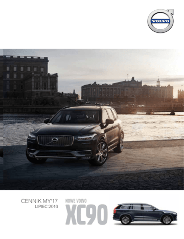 VOLVO XC90 | 1 CENNIK MY’17 LIPIEC 2016 XC90 NOWE VOLVO VOLVO XC90 | 2 VOLVO XC90 | 3 SPIS TREŚCI Jednostki napędowe 05 Wyposażenie standardowe 06 DESIGN 08 Plug-In Hybrid 10 Bezpieczeństwo 11 Komfort 11 Funkcjonalność 13 Multimedia 14 Wykończenie wnętrza 16 Tapicerki 17 Lakiery 23 Koła 24 Promocyjne pakiety wyposażenia 26 Wybrane Systemy Bezpieczeństwa 28 Volvo On Call 30 Promocyjne pakiety gwarancyjne 31 Akcesoria 32 Dane techniczne 34 VOLVO XC90 | 4 VOLVO XC90 | 5 SILNIKI DIESLA Silnik Skrzynia biegów (litr/KM) Cena w zł z VAT Kinetic Momentum Inscription DESIGN D4 FWD 2.0/190 automatyczna Geartronic, 8 biegów 229 900 254 700 275 200 275 200 D5 AWD 2.0/235 automatyczna Geartronic, 8 biegów 245 800 270 600 291 100 291 100 SILNIKI BENZYNOWE Silnik Skrzynia biegów (litr/KM) Cena w zł z VAT Kinetic Momentum Inscription DESIGN T5 AWD 2.0/254 automatyczna Geartronic, 8 biegów 269 800 294 600 315 100 315 100 T6 AWD 2.0/320 automatyczna Geartronic, 8 biegów 281 700 306 500 327 000 327 000 PLUG-IN HYBRID Silnik T8 AWD wersja 7-miejscowa (litr/KM) 2.0/320+87 Skrzynia biegów automatyczna Geartronic, 8 biegów Cena w zł z VAT Kinetic Momentum Inscription - 351 600 368 100 DESIGN 367 700 WERSJA 7-MIEJSCOWA Trzeci rząd siedzeń (wersja 7-miejscowa) Chowane siedzenia z regulacją wzdłużną (120 mm) dla drugiego rzędu siedzeń i funkcja łatwego wejścia. Polestar Performance dla XC90 D5, T6 i T8 Dopłata w zł z VAT 7 600 Oprogramowanie Polestar zmienia charakterystykę układu napędowego, zwiększa moc oraz moment obrotowy Twojego Volvo. PAKIET SERWISOWY VOLVO CARE Powyższe ceny zawierają pakiet serwisowy Volvo Care na okres 3 lat lub 100.000 km ( w zależności od tego, który warunek zostanie wcześniej spełniony), pokrywający koszty okresowych przeglądów, wliczając w to oryginalne części Volvo, olej oraz robociznę. Pakiet obejmuje czynności przewidziane zakresem przeglądów okresowych Volvo. Więcej informacji na temat Volvo Care, dodatkowego pakietu Care+ oraz zakresu przeglądów okresowych znajdą Państwo u Autoryzowanego Dealera Volvo. VOLVO XC90 | 6 WYPOSAŻENIE STANDARDOWE Opis wyposażenia BEZPIECZEŃSTWO oraz WŁAŚCIWOŚCI JEZDNE – 7 poduszek powietrznych: dla kierowcy i pasażera, dwie poduszki boczne (dwukomorowe), kurtyny powietrzne (IC), poduszka chroniąca kolana kierowcy – CITY SAFETY - Układ wspomagania hamowania dla różnicy prędkości pomiędzy pojazdami sięgającej 50 km/h – Unikanie lub łagodzenie skutków zderzeń z innymi samochodami na skrzyżowaniach - rozwiązanie wprowadzone po raz pierwszy na świecie – Unikanie lub łagodzenie skutków zderzeń z pieszymi i rowerzystami do prędkości 40km/h. System działa również w ciemności – SYSTEM BEZPIECZEŃSTWA INTELLISAFE ASSIST zawiera: - Active Cruise Control (ACC) - aktywny tempomat - Pilot Assist II generacji - wspomaganie kierowania przy prędkości do 130 km/h, nie wymagające obecności pojazdu z przodu - Lane Keeping Aid (LKA) - układ utrzymania pasa ruchu - Queue Assist - funkcjonalność ACC wspomagająca jazdę w korkach: samodzielne zatrzymanie i ruszenie za pojazdem - Distance Alert - układ ostrzegania o zbyt małej odległości od poprzedzającego pojazdu – DRIVER ALERT CONTROL - układ ostrzegający o dekoncentracji kierowcy – LDW (LANE DEPARTURE WARNING) - system ostrzegania o niekontrolowanej zmianie pasa ruchu – RSI (ROAD SIGN INFORMATION) - układ informowania o znakach drogowych – Napęd na wszystkie koła AWD (All WHEEL DRIVE) Haldex 5 generacji z system Instant Traction™ (dla silnika D5AWD, T6AWD, T5AWD) – ESC (ELECTRONIC STABILITY CONTROL) - układ elektronicznej kontroli stabilności i trakcji – SIPS (SIDE IMPACT PROTECTION SYSTEM) system zabezpieczeń przed skutkami uderzeń bocznych – WHIPS (WHIPLASH PROTECTION SEATING SYSTEM) system zabezpieczeń przed urazami kręgosłupa szyjnego – ABS (ANTI-LOCK BRAKE SYSTEM) z elektronicznym układem rozdziału sił hamowania (EBD – Electronic Brake Distribution) – CTC (CORNER TRACTION CONTROL) - kontrola trakcji w zakręcie – TSA (TRAILER STABILITY ASSIST) system stabilizacji pojazdu w czasie holowania przyczepy – EBA (EMERGENCY BRAKE ASSISTANCE) - układ wspomagania nagłego hamowania – EBL (EMERGENCY BRAKE LIGHTS) - ostrzeganie innych użytkowników drogi o gwałtownym hamowaniu – RSC (ROLL STABILITY CONTROL) - układ stabilizacji przechyłu – Fotele pochłaniające energię zderzenia – Regulacja pasów bezpieczeństwa w pierwszym i drugim rzędzie siedzeń – System mocowania fotelika ISOFIX dla zewnętrznych miejsc tylnej kanapy – Przednie pasy bezpieczeństwa z elektrycznymi napinaczami łagodzącymi skutki kolizji – Napinacze pasów bezpieczństwa (również dla 3-go rzędu siedzeń) – Zwalnianie pedału hamulca - rozwiązanie wprowadzone po raz pierwszy na świecie – Tempomat – Czujnik deszczu – Autoalarm Volvo Guard z czujnikiem przechyłu oraz ruchu – Zdalnie sterowany zamek centralny – Centralna blokada schowka – Immobilizer – Wyłącznik poduszki powietrznej pasażera – Elektryczny hamulec postojowy – Funkcja Auto Hold – System monitorowania ciśnienia w oponach WNĘTRZE – System Audio High Performance - 9" centralny ekran dotykowy o dużej powierzchni - moc 330W - 10 głośników - złącze AUX / USB – Sensus Connect Infotainment System wraz z zestawem głośnomówiacym Bluetooth. Udostępnianie połączenia internetowego poprzez Wi-Fi lub Bluetooth – Fotele komfortowe z tapicerką tekstylną R100 – 8" graficzny wyświetlacz zegarów – Wykończenie wnętrza CHARCOAL – ECC (ELECTRONIC CLIMATE CONTROL) - kilimatyzacja elektroniczna 2-strefowa – Pólautomatyczna roleta bagażnika – Automatycznie przyciemniane lusterko wsteczne – Trójramienna, skórzana kierownica – Sterowanie audio z kierownicy – Dywaniki tekstylne – Podświetlane lusterka wewnętrzne dla kierowcy i pasażera – Skórzane pokrycie dźwigni z