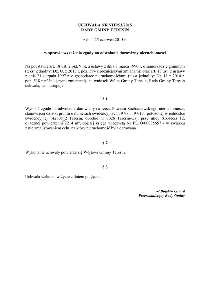 UCHWAŁA NR VIII/53/2015 RADY GMINY TERESIN z dnia 25 czerwca 2015 r. w sprawie wyrażenia zgody na odwołanie darowizny nieruchomości Na podstawie art. 18 ust. 2 pkt. 9 lit. a ustawy z dnia 8 marca 1990 r. o samorządzie gminnym (tekst jednolity: Dz. U. z 2013 r. poz. 594 z późniejszymi zmianami) oraz art. 13 ust. 2 ustawy z dnia 21 sierpnia 1997 r. o gospodarce nieruchomościami (tekst jednolity: Dz. U. z 2014 r. poz. 518 z późniejszymi zmianami), na wniosek Wójta Gminy Teresin, Rada Gminy Teresin uchwala, co następuje: §1 Wyrazić zgodę na odwołanie darowizny na rzecz Powiatu Sochaczewskiego nieruchomości, stanowiącej działki gruntu o numerach ewidencyjnych 197/7 i 197/10, położonej w jednostce ewidencyjnej 142808_2 Teresin, obrębie nr 0026 Teresin-Gaj, przy ulicy XX-lecia 12, o łącznej powierzchni 2214 m2, objętej księgą wieczystą Nr PL1O/00035657 - w związku z nie zrealizowaniem celu, na który nieruchomość była darowana. §2 Wykonanie uchwały powierza się Wójtowi Gminy Teresin. §3 Uchwała wchodzi w życie z dniem podjęcia. /-/ Bogdan Linard Przewodniczący Rady Gminy UZASADNIENIE do uchwały Nr VIII/53/2015 Rady Gminy Teresin z dnia 25 czerwca 2015 r. Uchwałą Nr X/49/05 z dnia 17 listopada 2005 r. w sprawie wyrażenia zgody na dokonanie darowizny nieruchomości na rzecz Powiatu Sochaczewskiego Rada Gminy Teresin wyraziła zgodę na dokonanie darowizny przez Gminę Teresin na rzecz Powiatu Sochaczewskiego zabudowanej nieruchomości położonej w Teresinie-Gaju przy ulicy Al. XX-lecia o pow. 2214 m2, uregulowanej w KW 16759, oznaczonej po podziale jako działka ewidencyjna nr 197/7 i 197/10 z przeznaczeniem dla Zespołu Szkół im. Prymasa Tysiąclecia Stefana Kardynała Wyszyńskiego w Teresinie pod budowę basenu. W dniu 3 lutego 2006 r. aktem notarialnym za nr REPERTORIUM A nr 392/06 w kancelarii notariusza Jolanty Teresy Demczyszyn w Sochaczewie nastąpiła darowizna ww. nieruchomości na rzecz Powiatu Sochaczewskiego. Mimo upływu prawie 10 lat Powiat nie podjął żadnej czynności aby rozpocząć budowę basenu. Mając powyższe na uwadze Rada Gminy wyraża zgodę Wójtowi Gminy na odwołanie darowizny w trybie art. 900 k.c. /-/ Bogdan Linard Przewodniczący Rady Gminy