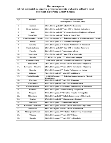 Harmonogram zebrań wiejskich w sprawie przeprowadzenia wyborów sołtysów i rad sołeckich na terenie Gminy Słupca L.p. Sołectwo 1. Kamień 2. Cienin Kościelny 3. Kąty 4. Nowa Wieś 5. Wola Koszucka - Parcele 6. Pokoje 23.01.2015r. godz.18 °° sala OSP w Pokojach 7. Koszuty 24.01.2015r. godz.15 °° Szkoła Podstawowa w Koszutach 8. Cienin Zaborny 25.01.2015 r. godz.16°° Sala OSP w Cieninie Zabornym 9. Pępocin 10. Marcewek 27.01.2015 r. godz.15 ³° sala OSP w Marcewku 11. Korwin 27.01.2015 r. godz.17°° mieszkanie sołtysa 12. Kowalewo Góry 28.01.2015r. godz.15°° sala OSP w Kowalewie – Opactwie 13. Poniatówek 28.01.2015r. godz.16°° sala OSP w Kowalewie – Opactwie 14. Kowalewo – Opactwo 28.01.2015r. godz.17°° sala OSP w Kowalewie – Opactwie 15. Kotunia 29.01.2015r. godz.18°° Szkoła Podstawowa w Kotuni 16. Gółkowo 30.01.2015r.godz.17°° sala OSP w Gółkowie 17. Cienin Kolonia 18. Wierzbno 19. Wierzbocice 20. Koszuty Parcele 21. Kochowo 04.02.2015r. godz.17°°mieszkanie p.Jarzyńskich 22. Niezgoda 04.02.2015r. godz.18³° Świetlica wiejska w Niezgodzie 23. Młodojewo 24. Drążna 25. Marcewo 26. Kowalewo – Sołectwo 27. Piotrowice 28. Młodojewo Parcele 29. Wilczna 15.02.2015r. godz.16°° sala OSP Wilczna 30. Rozalin 16.02.2015r. godz.17°° sala OSP w Rozalinie Termin i miejsce zebrania (data i godzina zebrania ,lokal) 19.01.2015 r. godz.15³° sala OSP w Kamieniu 20.01.2015 r. godz.18 °° sala OSP w Cieninie Kościelnym 21.01.2015 r. godz.16 °° Centrum Spotkań Wiejskich w Kątach 21.01.2015 r. godz.18 °° Pałac w Nowej Wsi 22.01.2015 r.godz.18°° Świetlica wiejska w Woli Koszuckiej – Parcele 26.01.2015r. godz.18 °°mieszkanie sołtysa 31.01.2015r.godz.11°° Świetlicy Środowiskowej w Cieninie Kościelnym 01.02.2015r.godz.15 °° sala OSP Wierzbno 01.02.2015r.godz.15 °° sala OSP Wierzbocicach 03.02.2015r. godz.18°° w Szkole Podstawowej w Koszutach 05.02.2015r.godz.18 °° Szkoła Podstawowa w Młodojewie 07.02.2015r.godz.18 °° Gimnazjum w Drążnej 08.02.2015r. godz.17°° mieszkanie sołtysa 09.02.2015r. godz.16°° sala OSP w Kowalewie - Opactwie 09.02.2015 r.godz.18°° sala OSP w Piotrowicach. 13.02.2015r. godz.18°° w Szkole Podstawowej w Koszutach