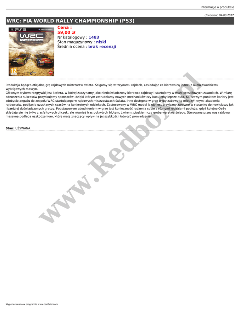 Informacje o produkcie Utworzono 04-03-2017 WRC: FIA WORLD RALLY CHAMPIONSHIP (PS3) Cena : 59,00 zł Nr katalogowy : 1483 Stan magazynowy : niski Średnia ocena : brak recenzji oX .p l Produkcja będąca oficjalną grą rajdowych mistrzostw świata. Ścigamy się w trzynastu rajdach, zasiadając za kierownicą jednej z około dwudziestu wyścigowych maszyn. Głównym trybem rozgrywki jest kariera, w której zaczynamy jako niedoświadczony kierowca rajdowy i startujemy w mało prestiżowych zawodach. W miarę odnoszenia sukcesów pozyskujemy sponsorów, dzięki którym zatrudniamy nowych mechaników czy kupujemy lepsze auta. Kluczowym punktem kariery jest zdobycie angażu do zespołu WRC startującego w rajdowych mistrzostwach świata. Inne dostępne w grze tryby zabawy to między innymi akademia rajdowców, pobijanie uzyskanych czasów na konkretnych odcinkach. Zastosowany w WRC model jazdy jest przyjazny zarówno w stosunku do nowicjuszy jak i bardziej doświadczonych graczy. Podstawowym utrudnieniem w grze jest konieczność radzenia sobie z różnymi rodzajami podłoża, gdyż kolejne OeSy składają się nie tylko z asfaltowych uliczek, ale również tras pokrytych błotem, żwirem, piaskiem czy grubą warstwą śniegu. Sterowana przez nas rajdowa maszyna podlega uszkodzeniom, które mają znaczący wpływ na jej szybkość i łatwość prowadzenia. w w w .R ed b Stan: UŻYWANA Wygenerowano w programie www.oscGold.com