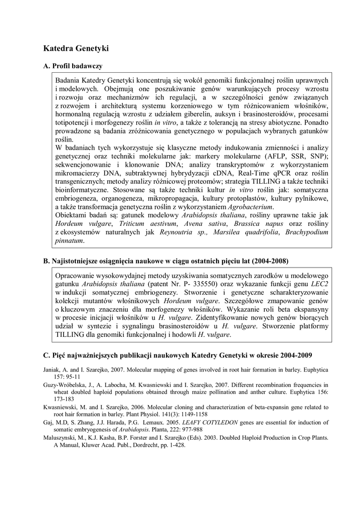 Katedra Genetyki A. Profil badawczy Badania Katedry Genetyki koncentrują się wokół genomiki funkcjonalnej roślin uprawnych i modelowych. Obejmują one poszukiwanie genów warunkujących procesy wzrostu i rozwoju oraz mechanizmów ich regulacji, a w szczególności genów związanych z rozwojem i architekturą systemu korzeniowego w tym róŜnicowaniem włośników, hormonalną regulacją wzrostu z udziałem giberelin, auksyn i brasinosteroidów, procesami totipotencji i morfogenezy roślin in vitro, a takŜe z tolerancją na stresy abiotyczne. Ponadto prowadzone są badania zróŜnicowania genetycznego w populacjach wybranych gatunków roślin. W badaniach tych wykorzystuje się klasyczne metody indukowania zmienności i analizy genetycznej oraz techniki molekularne jak: markery molekularne (AFLP, SSR, SNP); sekwencjonowanie i klonowanie DNA; analizy transkryptomów z wykorzystaniem mikromacierzy DNA, subtraktywnej hybrydyzacji cDNA, Real-Time qPCR oraz roślin transgenicznych; metody analizy róŜnicowej proteomów; strategia TILLING a takŜe techniki bioinformatyczne. Stosowane są takŜe techniki kultur in vitro roślin jak: somatyczna embriogeneza, organogeneza, mikropropagacja, kultury protoplastów, kultury pylnikowe, a takŜe transformacja genetyczna roślin z wykorzystaniem Agrobacterium. Obiektami badań są: gatunek modelowy Arabidopsis thaliana, rośliny uprawne takie jak Hordeum vulgare, Triticum aestivum, Avena sativa, Brassica napus oraz rośliny z ekosystemów naturalnych jak Reynoutria sp., Marsilea quadrifolia, Brachypodium pinnatum. B. Najistotniejsze osiągnięcia naukowe w ciągu ostatnich pięciu lat (2004-2008) Opracowanie wysokowydajnej metody uzyskiwania somatycznych zarodków u modelowego gatunku Arabidopsis thaliana (patent Nr. P- 335550) oraz wykazanie funkcji genu LEC2 w indukcji somatycznej embriogenezy. Stworzenie i genetyczne scharakteryzowanie kolekcji mutantów włośnikowych Hordeum vulgare. Szczegółowe zmapowanie genów o kluczowym znaczeniu dla morfogenezy włośników. Wykazanie roli beta ekspansyny w procesie inicjacji włośników u H. vulgare. Zidentyfikowanie nowych genów biorących udział w syntezie i sygnalingu brasinosteroidów u H. vulgare. Stworzenie platformy TILLING dla genomiki funkcjonalnej i hodowli H. vulgare. C. Pięć najwaŜniejszych publikacji naukowych Katedry Genetyki w okresie 2004-2009 Janiak, A. and I. Szarejko, 2007. Molecular mapping of genes involved in root hair formation in barley. Euphytica 157: 95-11 Guzy-Wróbelska, J., A. Labocha, M. Kwasniewski and I. Szarejko, 2007. Different recombination frequencies in wheat doubled haploid populations obtained through maize pollination and anther culture. Euphytica 156: 173-183 Kwasniewski, M. and I. Szarejko, 2006. Molecular cloning and characterization of beta-expansin gene related to root hair formation in barley. Plant Physiol. 141(3): 1149-1158 Gaj, M.D, S. Zhang, J.J. Harada, P.G. Lemaux. 2005. LEAFY COTYLEDON genes are essential for induction of somatic embryogenesis of Arabidopsis. Planta, 222: 977-988 Maluszynski, M., K.J. Kasha, B.P. Forster and I. Szarejko (Eds). 2003. Doubled Haploid Production in Crop Plants. A Manual, Kluwer Acad. Publ., Dordrecht, pp. 1-428.