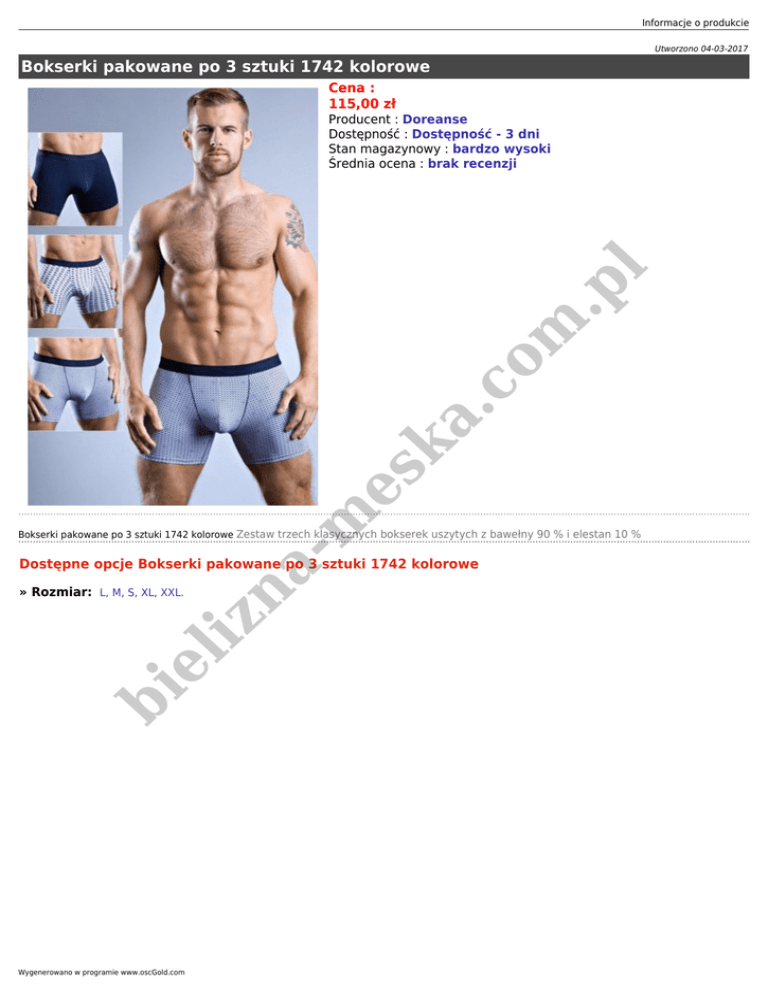 Informacje o produkcie Utworzono 04-03-2017 Bokserki pakowane po 3 sztuki 1742 kolorowe Cena : 115,00 zł m es ka .c o m .p l Producent : Doreanse Dostępność : Dostępność - 3 dni Stan magazynowy : bardzo wysoki Średnia ocena : brak recenzji na - Bokserki pakowane po 3 sztuki 1742 kolorowe Zestaw trzech klasycznych bokserek uszytych z bawełny 90 % i elestan 10 % Dostępne opcje Bokserki pakowane po 3 sztuki 1742 kolorowe bi el iz » Rozmiar: L, M, S, XL, XXL. Wygenerowano w programie www.oscGold.com