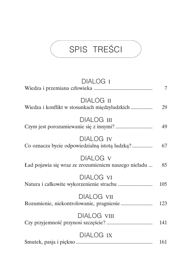 SPIS TREŒCI DIALOG I Wiedza i przemiana człowieka .............................................. 7 DIALOG II Wiedza i konflikt w stosunkach międzyludzkich ................. 29 DIALOG III Czym jest porozumiewanie się z innymi? ............................. 49 DIALOG IV Co oznacza bycie odpowiedzialną istotą ludzką? ................ 67 DIALOG V Ład pojawia się wraz ze zrozumieniem naszego nieładu ... 85 DIALOG VI Natura i całkowite wykorzenienie strachu ........................... 105 DIALOG VII Rozumienie, niekontrolowanie, pragnienie ......................... 123 DIALOG VIII Czy przyjemność przynosi szczęście? .................................... 141 DIALOG IX Smutek, pasja i piękno ............................................................ 161 6 DIALOG I DIALOG X Sztuka słuchania ...................................................................... 177 DIALOG XI Bycie zranionym i ranienie innych ........................................ 195 DIALOG XII Miłość, seks i przyjemność ..................................................... 215 DIALOG XIII Inny sposób życia ..................................................................... 235 DIALOG XIV Śmierć, życie i miłość są niepodzielne – natura nieśmiertelności ................................................... 255 DIALOG XV Religia, władza i edukacja – część I ...................................... 275 DIALOG XVI Religia, autorytet i edukacja – część II ................................. 293 DIALOG XVII Medytacja, właściwość uwagi, która przenika całe życie .... 313 DIALOG XVIII Medytacja i święty umysł ........................................................ 335