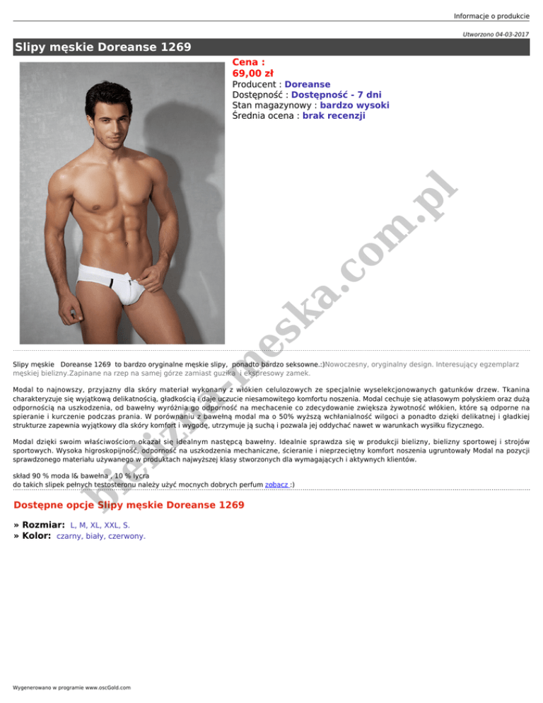Informacje o produkcie Utworzono 04-03-2017 Slipy męskie Doreanse 1269 Cena : 69,00 zł m es ka .c o m .p l Producent : Doreanse Dostępność : Dostępność - 7 dni Stan magazynowy : bardzo wysoki Średnia ocena : brak recenzji Slipy męskie Doreanse 1269 to bardzo oryginalne męskie slipy, ponadto bardzo seksowne.:)Nowoczesny, oryginalny design. Interesujący egzemplarz męskiej bielizny.Zapinane na rzep na samej górze zamiast guzika i ekspresowy zamek. el iz na - Modal to najnowszy, przyjazny dla skóry materiał wykonany z włókien celulozowych ze specjalnie wyselekcjonowanych gatunków drzew. Tkanina charakteryzuje się wyjątkową delikatnością, gładkością i daje uczucie niesamowitego komfortu noszenia. Modal cechuje się atłasowym połyskiem oraz dużą odpornością na uszkodzenia, od bawełny wyróżnia go odporność na mechacenie co zdecydowanie zwiększa żywotność włókien, które są odporne na spieranie i kurczenie podczas prania. W porównaniu z bawełną modal ma o 50% wyższą wchłanialność wilgoci a ponadto dzięki delikatnej i gładkiej strukturze zapewnia wyjątkowy dla skóry komfort i wygodę, utrzymuje ją suchą i pozwala jej oddychać nawet w warunkach wysiłku fizycznego. Modal dzięki swoim właściwościom okazał się idealnym następcą bawełny. Idealnie sprawdza się w produkcji bielizny, bielizny sportowej i strojów sportowych. Wysoka higroskopijność, odporność na uszkodzenia mechaniczne, ścieranie i nieprzeciętny komfort noszenia ugruntowały Modal na pozycji sprawdzonego materiału używanego w produktach najwyższej klasy stworzonych dla wymagających i aktywnych klientów. bi skład 90 % moda l& bawełna , 10 % lycra do takich slipek pełnych testosteronu należy użyć mocnych dobrych perfum zobacz :) Dostępne opcje Slipy męskie Doreanse 1269 » Rozmiar: L, M, XL, XXL, S. » Kolor: czarny, biały, czerwony. Wygenerowano w programie www.oscGold.com