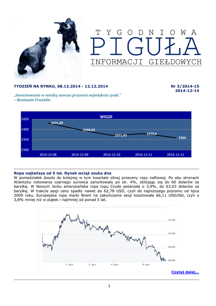 TYDZIEŃ NA RYNKU, 08.12.2014 - 12.12.2014 Nr 3/2014-15 2014-12-14 „Inwestowanie w wiedzę zawsze przynosi największe zyski.” – Beniamin Franklin WIG20 2450 2431,89 2400 2398,03 2371,43 2379,6 2360 2350 2300 2014-12-08 2014-12-09 2014-12-10 2014-12-11 2014-12-12 Ropa najtańsza od 5 lat. Rynek wciąż szuka dna W poniedziałek doszło do kolejnej w tym kwartale silnej przeceny ropy naftowej. Po obu stronach Atlantyku notowania czarnego surowca zanurkowały po ok. 4%, zbliżając się do 60 dolarów za baryłkę. W Nowym Jorku amerykańska ropa typu Crude potaniała o 3,9%, do 63,03 dolarów za baryłkę. W trakcie sesji ceny spadły nawet do 62,78 USD, czyli do najniższego poziomu od lipca 2009 roku. Europejska ropa marki Brent na zakończenie sesji kosztowała 66,11 USD/bbl, czyli o 3,8% mniej niż w piątek i najmniej od ponad 5 lat. Czytaj dalej… 1 Dow Jones zaliczył najgorszy tydzień od 3 lat Po piątkowym spadku o 315 punktów Dow Jones zanotował największą tygodniową stratę od listopada 2011 roku. Według komentatorów inwestorów zaniepokoiły nurkujące notowania ropy naftowej oraz słabsze dane z Chin. Czytaj dalej… Rubel pikuje, kolejny rekord pobity Rubel w piątek ustanowił nowe antyrekordy. Po raz pierwszy w historii za dolara płacono powyżej 57 rubli, a za euro - więcej niż 71 rubli. Na koniec dnia za euro trzeba już było zapłacić 72,75 rubla, a za dolara 58,28 rubla. Presję na kurs waluty narodowej Rosji wywierają zachodnie sankcje i wciąż taniejąca ropa naftowa. Czytaj dalej... Wzrost PKB Polski przyspieszy w 2015 r. Tempo wzrostu polskiej gospodarki w przyszłym roku może przyspieszyć i może wynieść ok. 3,5 proc. Kluczowy dla koniunktury będzie popyt wewnętrzny - uważają uczestnicy poniedziałkowej debaty PAP Biznes "Strategie rynkowe 2015". W ich ocenie przy coraz lepszej sytuacji gospodarki realnej RPP raczej nie zdecyduje się na dalsze obniżki stóp procentowych. Czytaj dalej... Bezrobocie w Australii najwyższe od 12 lat Australia jawi się wielu Polakom jako jedno z najlepszych państw, do których można wyemigrować. Okazuje się, że tamtejszy rynek pracy jest w najgorszej kondycji od lat. Stopa bezrobocia w Australii wzrosła w listopadzie do 6,3% wobec 6,2% w październiku – poinformował tamtejszy urząd statystyczny. Odczyt ten trafił w przewidywania analityków, choć to najwyższy poziom bezrobocia od 2002 r. Czytaj dalej... Greckiej tragedii ciąg dalszy. Giełda pikuje Grecka giełda ponownie zalicza silne spadki. Główny ateński indeks momentami pikował w czwartek o 8%. W górę z kolei pnie się rentowność greckich obligacji, która przekroczyła barierę 9%. Czytaj dalej... Zachęcamy do rozwiązywania naszego Pigułowego Quizu!!! Zasady konkursu: o Zwycięzcą numeru zostaje osoba, która jako pierwsza udzieli poprawnych odpowiedzi na wszystkie pytania Quizu numeru. Zwycięzca numeru będzie ogłoszony w najbliższym kolejnym numerze. o Zwycięzcą roku zostaje osoba, która w ciągu całego roku akademickiego sumarycznie udzieli najwięcej prawidłowych odpowiedzi. Zwycięzca roku otrzyma nagrodę roku. Zwycięzcą numeru 2/2014-15 został: Rafał Barbacki Quiz numeru 3/2014-15 Autorem quizu numeru 3/2014-15 jest Kamil Banaś Redakcja: Hanna Otremba 2 powered by KOŁO NAUKOWE MODELOWANIA FINANSOWEGO